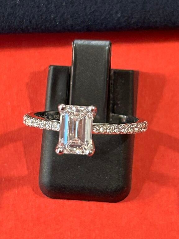 Bague solitaire en or blanc 18 carats ornée d'un diamant taille émeraude sur une alliance américaine (pierres de synthèse) le tout pesant 1,260 carats.