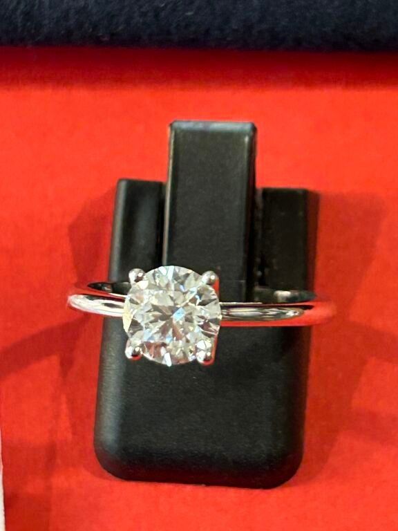 Bague solitaire en or blanc 18 carats sertie d'un diamant ( pierre de synthèse ) pesant 1,010 carat.
