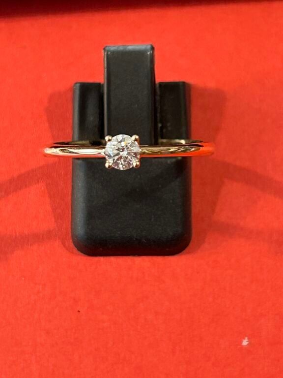 Bague solitaire en or rose 18 carats ornée d'un diamant (pierres de synthèse) pesant 0,220 carats.