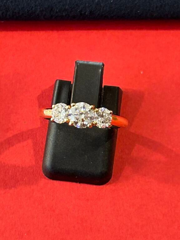 Bague trilogie en or jaune 18 carats ornée de trois diamants (pierres de synthèse) le tout pesant 1,040 carats.