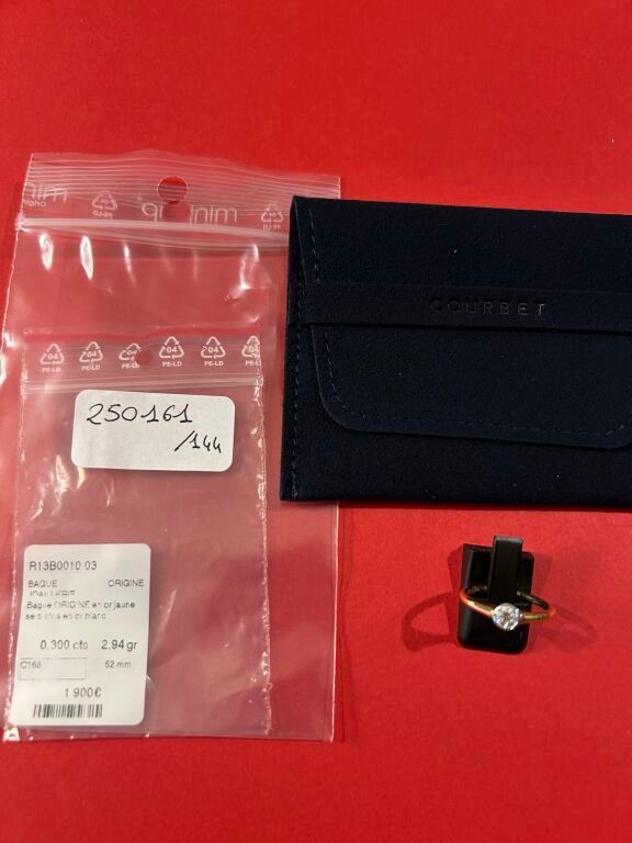COURBET Bague solitaire en or jaune 18 carats ornée d'un diamant (pierre de synthèse) pesant 0,300 carats. Poids brut : 2,7 g.