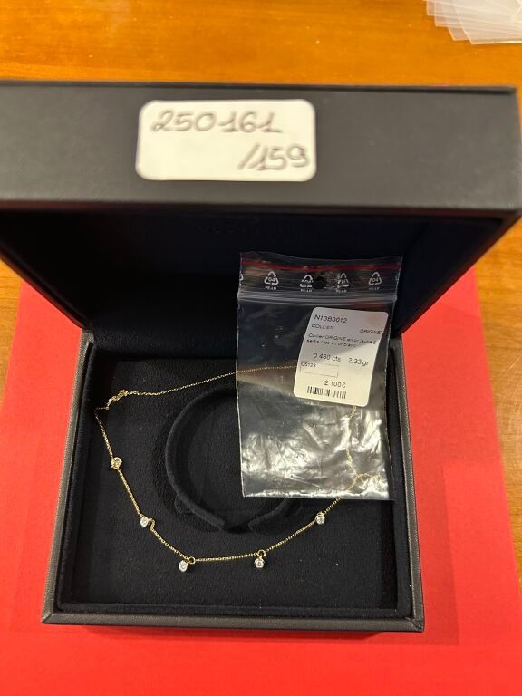 COURBET Chaine en or jaune 18 carats retenant cinq diamants (pierre de synthèse) pesant 0,460 carats dans son écrin Poids brut : 2,33 g.