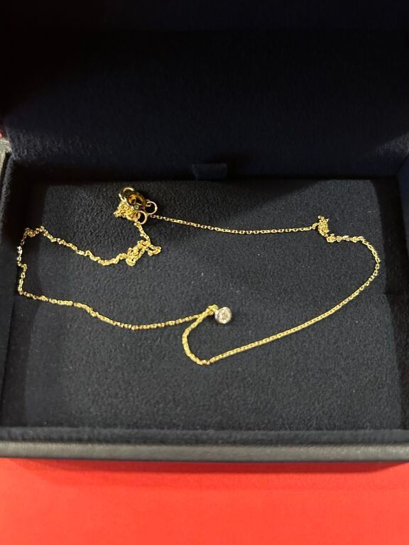 COURBET Chaine en or jaune retenant un diamant (pierre de synthèse) pesant 0,100 carats dans son écrin Poids brut : 1,63 g.