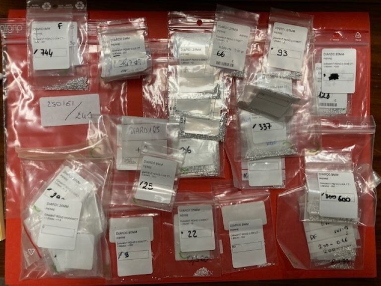 Lot de diamants de synthèse , diamants ronds environ 6000 diamants de 0,0025 à 0,0095 carats Poids total : environ 30 carats