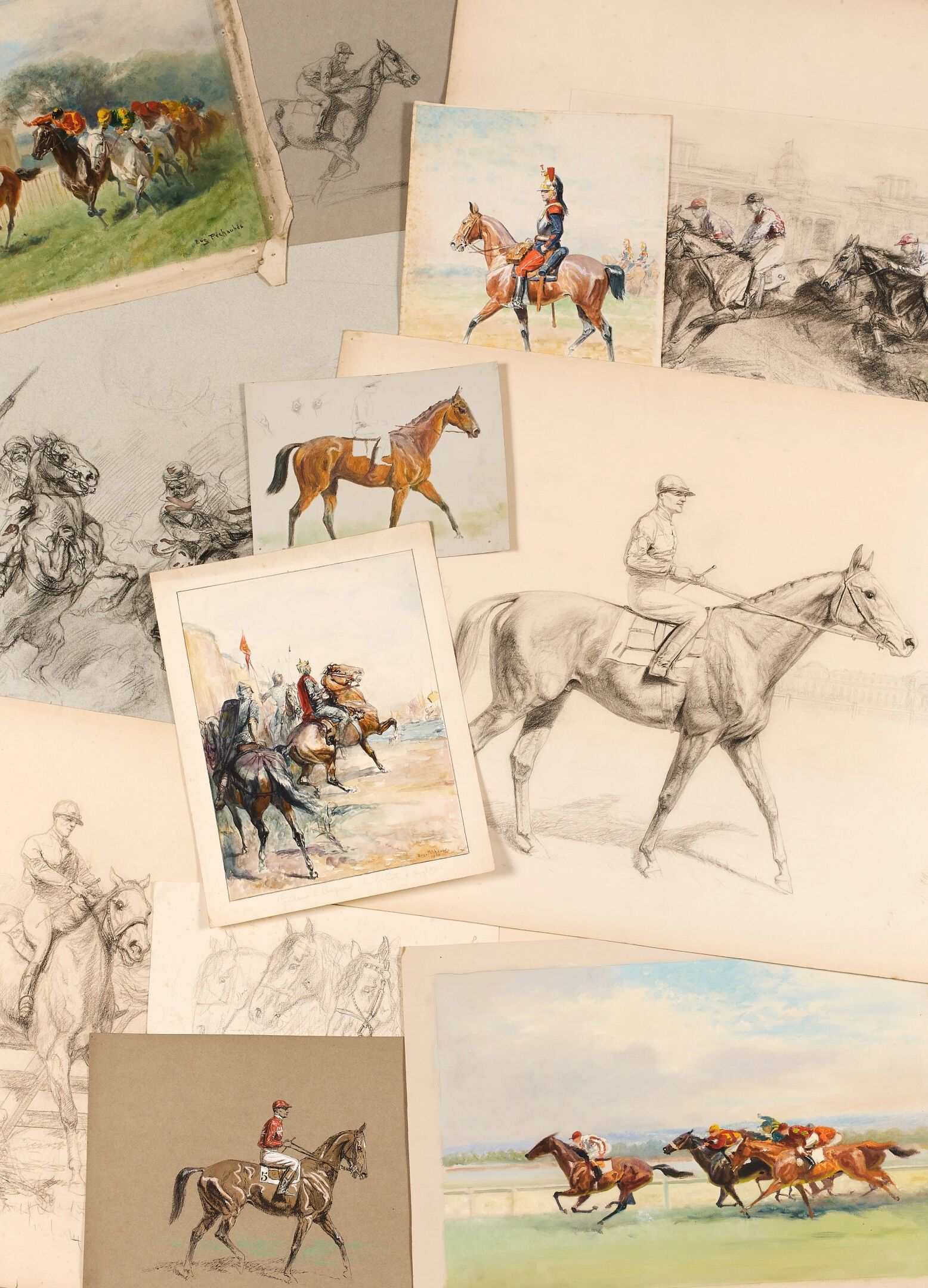 ÉCOLE MODERNE Scènes de courses - Jockeys - Fantasia - Étude de chiens - Étude de personnages et divers Environ quarante-huit dessins ou impressions au crayon noir, au fusain, à l'estompe, ou à l'encre, certains sur papier teinté, certains signés et datés, certains double face. - Expert : Amaury de LOUVENCOURT & Mme Agnès SEVESTRE-BARBE