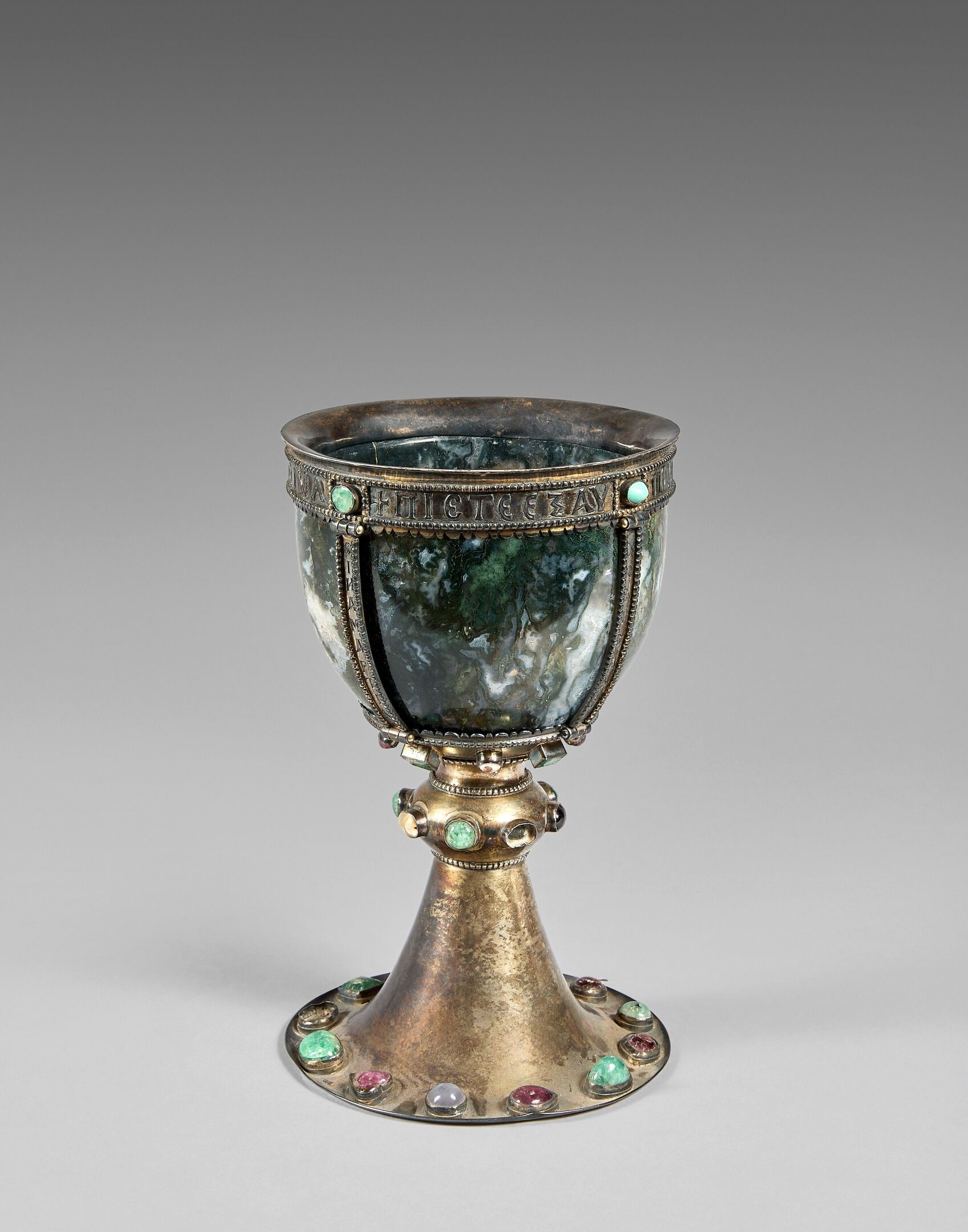 Calice à base circulaire dont la coupe ovoïde en agate est enchâssée dans une monture en argent parcourue d'inscriptions en grec ancien « †ΠΙΕΤΕ EΞ ΑΥΤΟΥ ΠΑΝΤ[ΕC] ΤΟΥ-Τ[Ο] Μ[OY] ΕΣΤ[ι] ΤΟ ΑΙΜΑ Τ[O] ΥΠΕΡ ΥΜ[ΩΝ] Κ[AI] ΠΟΛΛΩΝ ΕΚΧΥΝΟΜ[ENON] ΕΙC ΑΦΕCΙΝ ΑΜΑΡΤ[IΩΝ] » (Buvez-en tous, ceci est mon sang, versé pour vous et pour beaucoup, en rémission des péchés). Le décor est composé de granules et de pierres enchâssées (améthyste, nacre, grenat et autres).