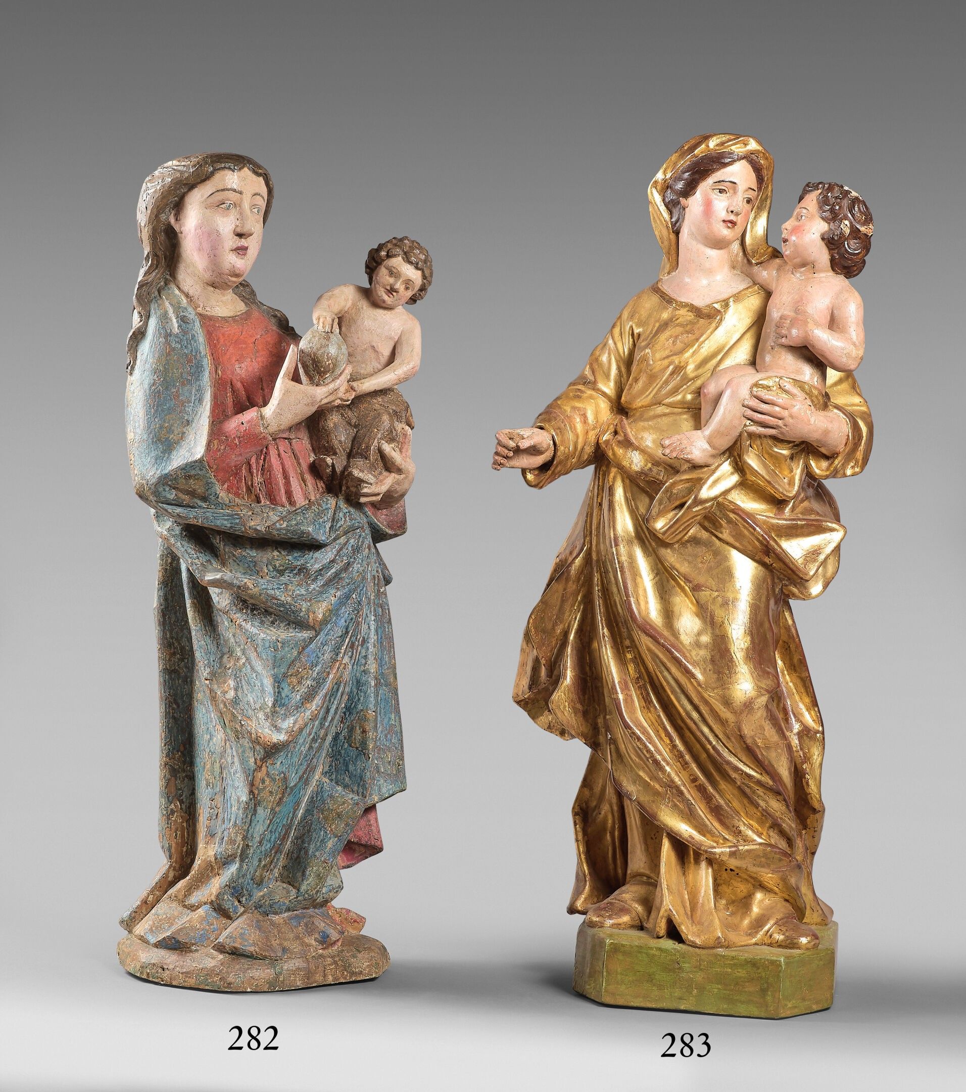 Statue de Vierge à l'Enfant déhanchée en bois polychrome.