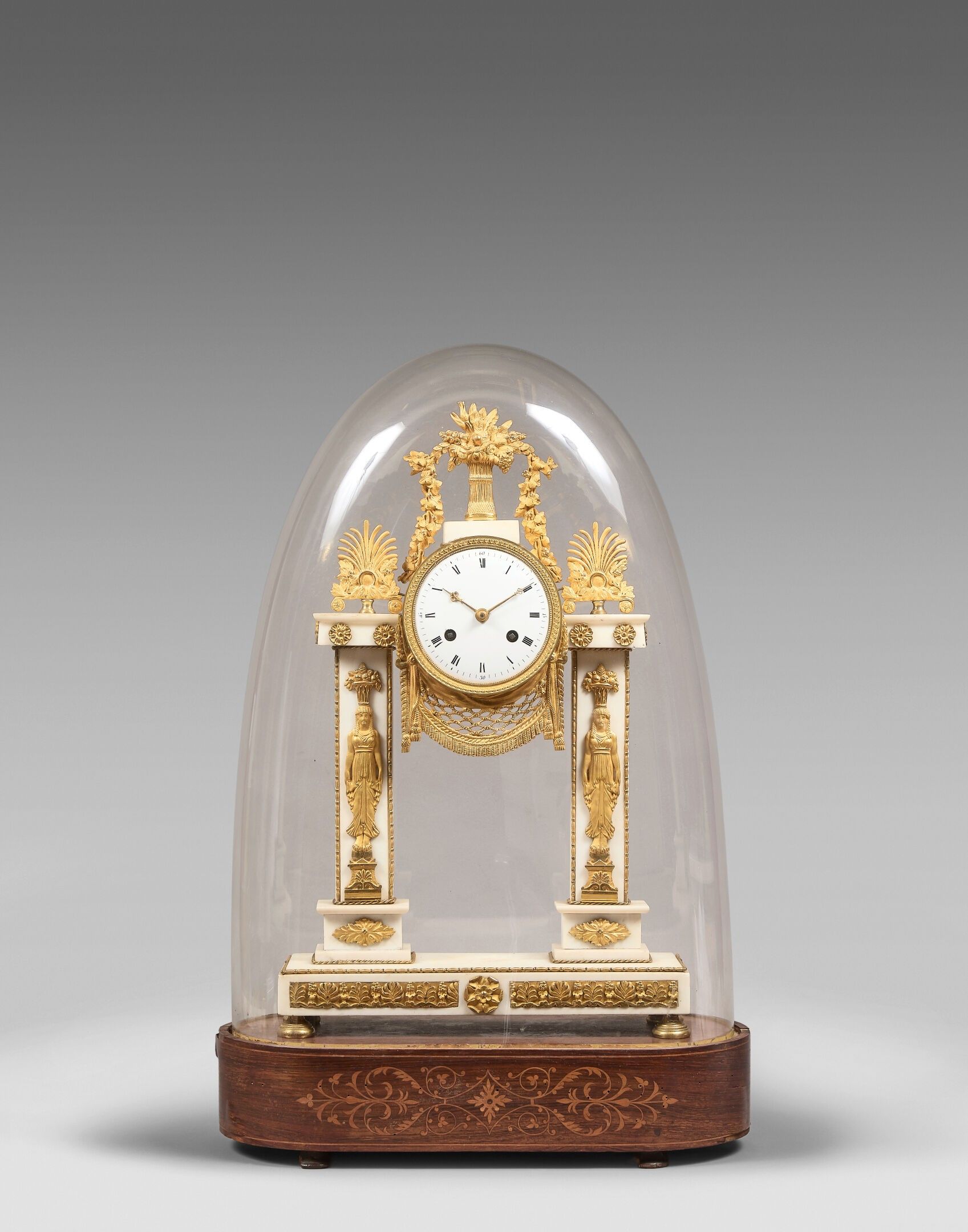 Pendule en marbre blanc et bronze doré, colonnes en marbre à décor de cariatides, palmettes, draperie, guirlandes et bouquet fleuri.
