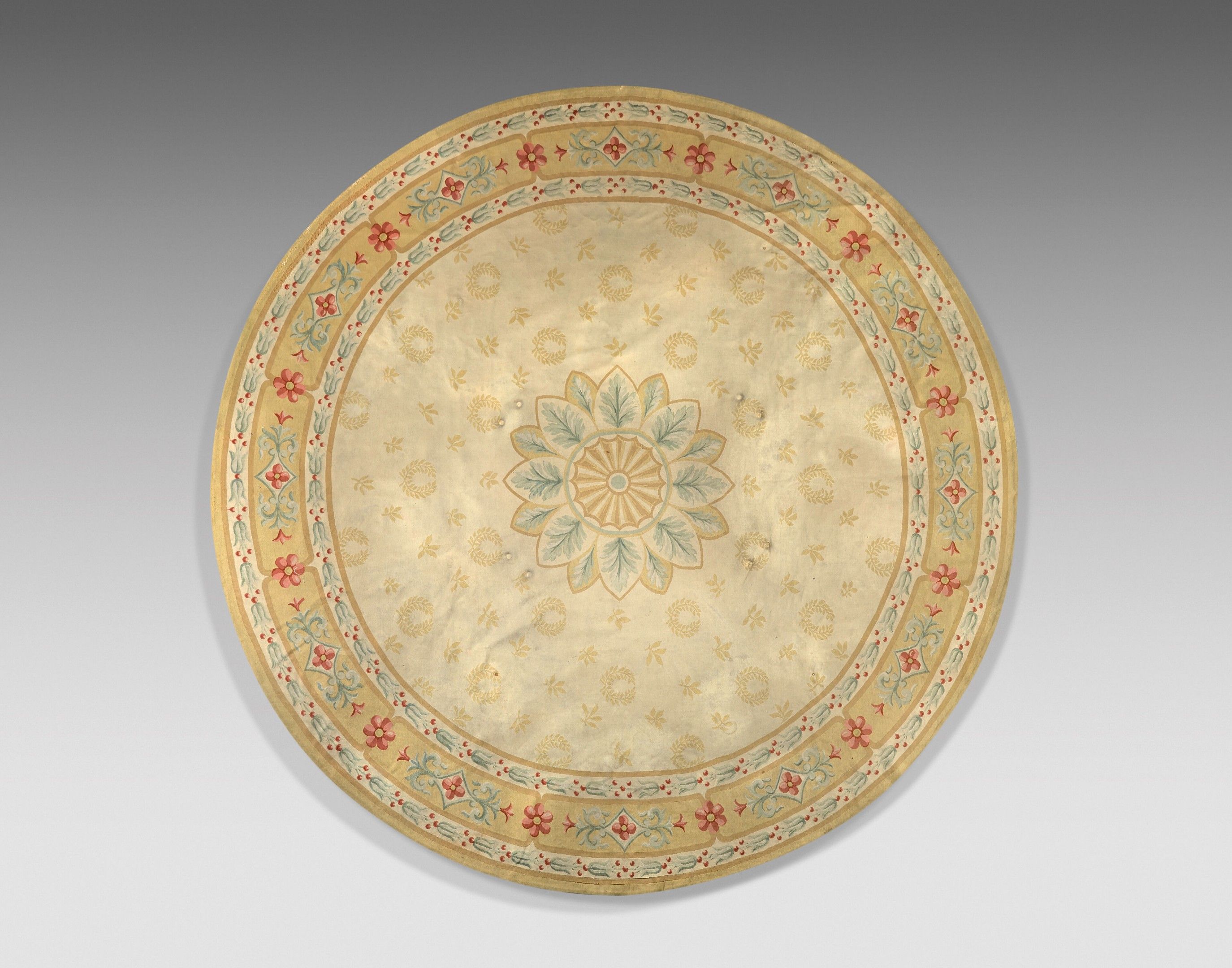 Tapis rond orné d'un médaillon central fleuri sur un fond blanc semé de couronnes de laurier. Bordure à cartouches et rinceaux.