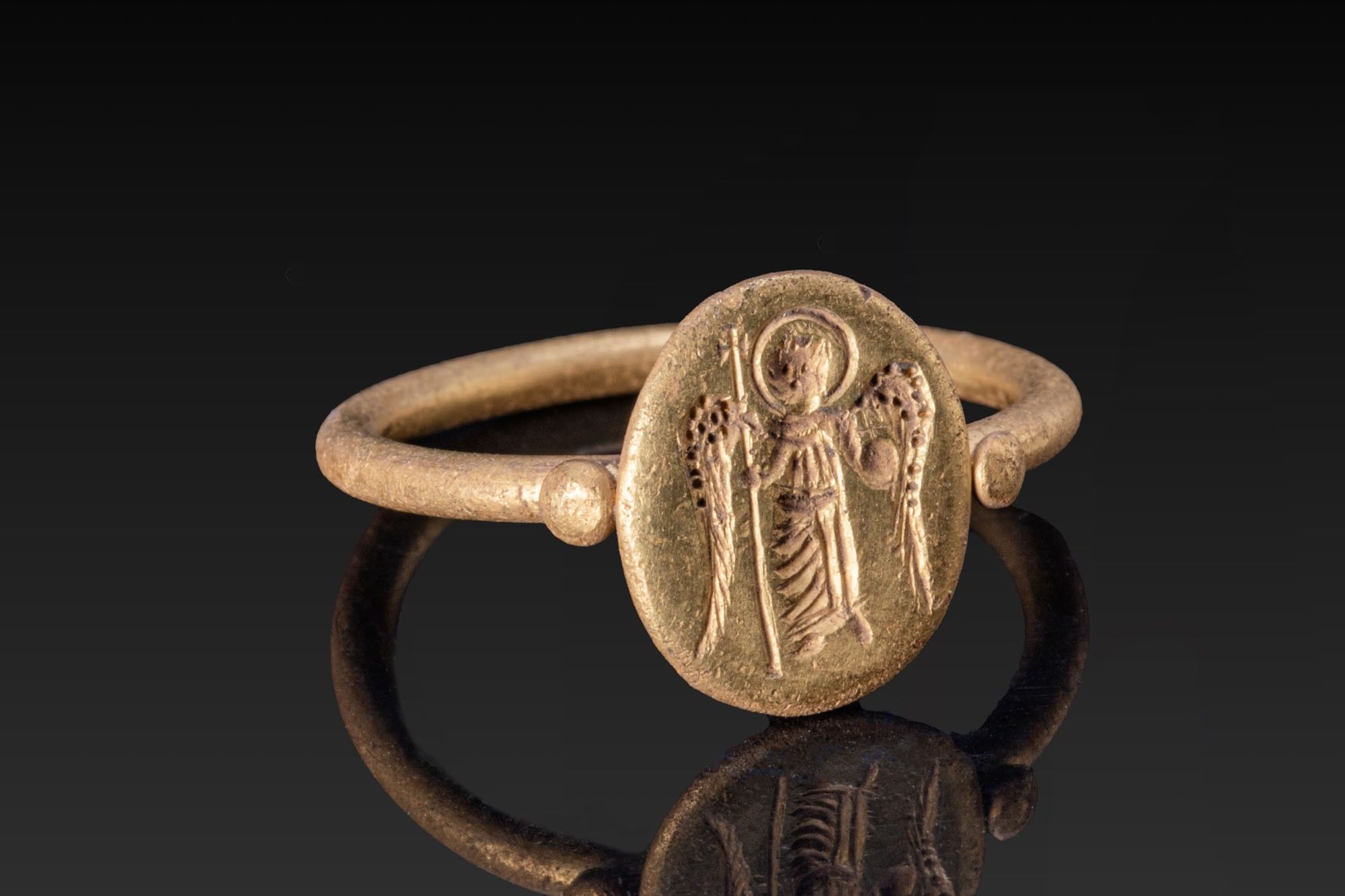 Premium BAGUE BYZANTINE EN OR NIELLÉ REPRÉSENTANT UN ANGE DEBOUT TEN…