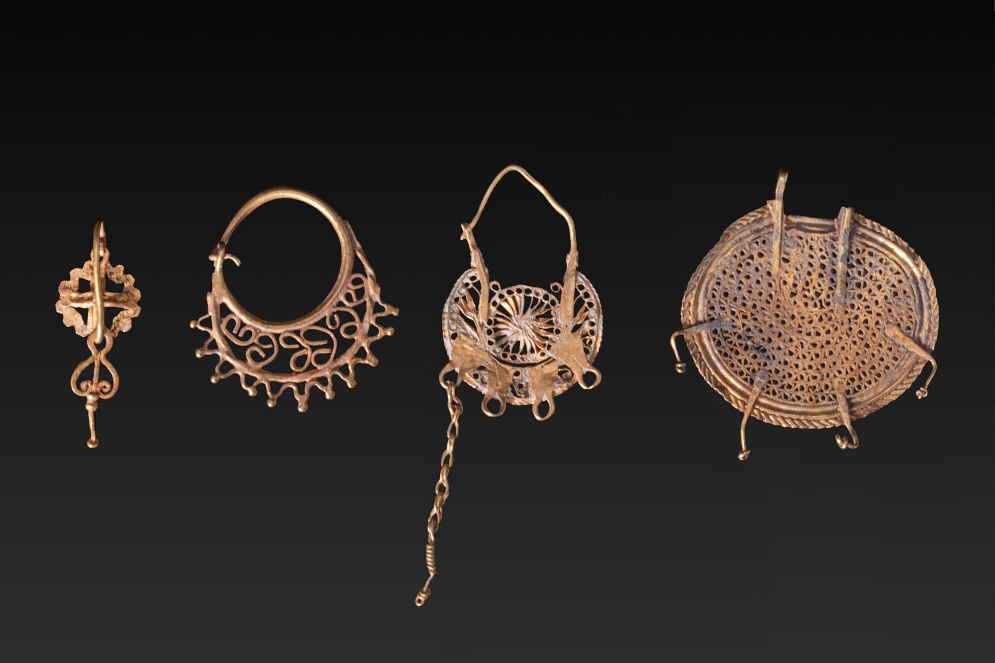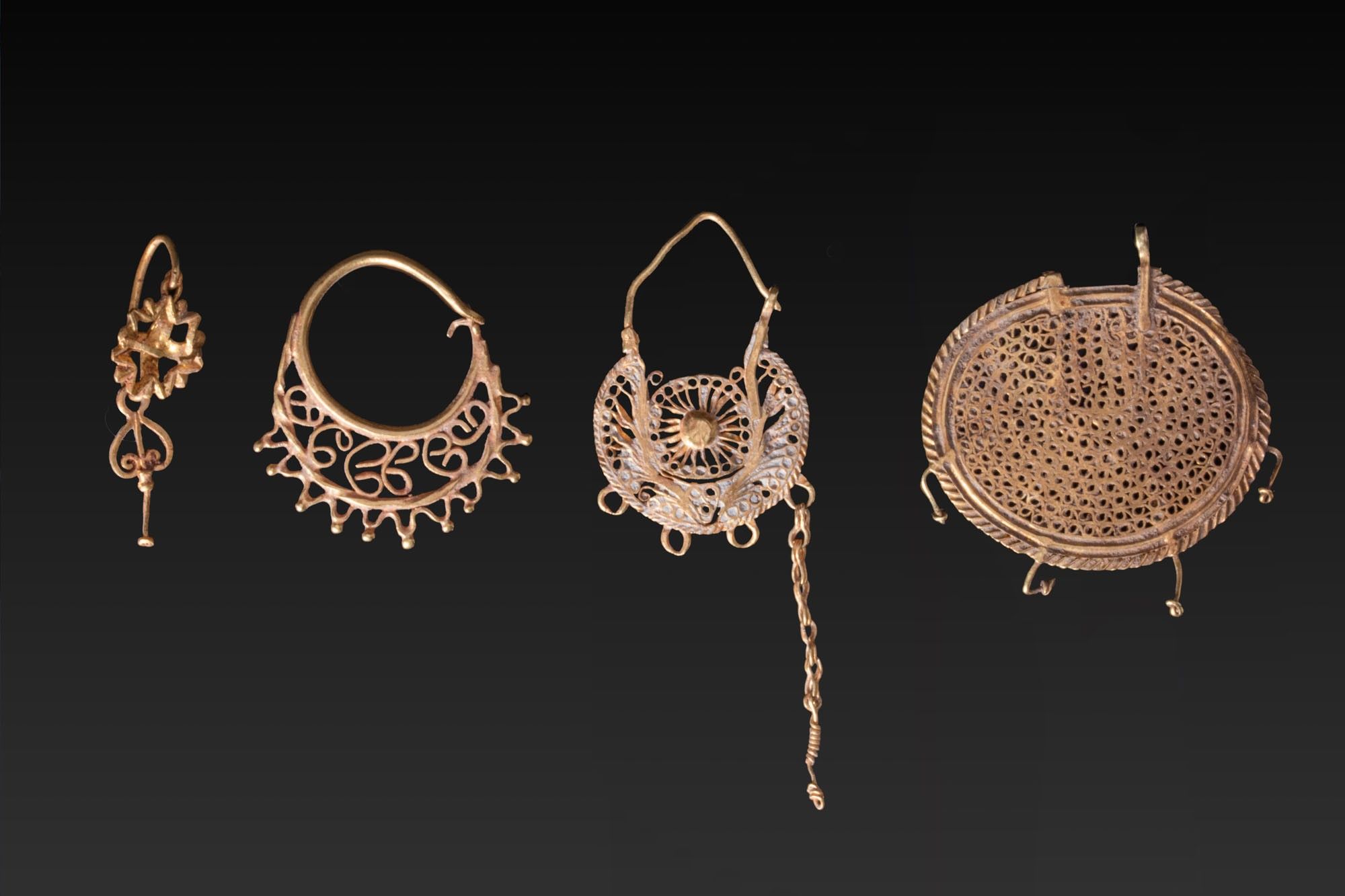 Une collection de quatre boucles d'oreilles en or, comprenant de gauche à droite : une boucle d'oreille avec une plaque ajourée et un long élément vertical se terminant par un bouton ; une boucle d'oreille en forme de croissant avec une volute ajourée et une bordure de pastilles en saillie ; une boucle d'oreille en forme de croissant avec un fin ajourage, une rosette centrale et un pendentif en chaîne torsadée ; et une grande boucle d'oreille en forme de disque avec un treillis ajouré dense encadré par une bordure à motif de corde.