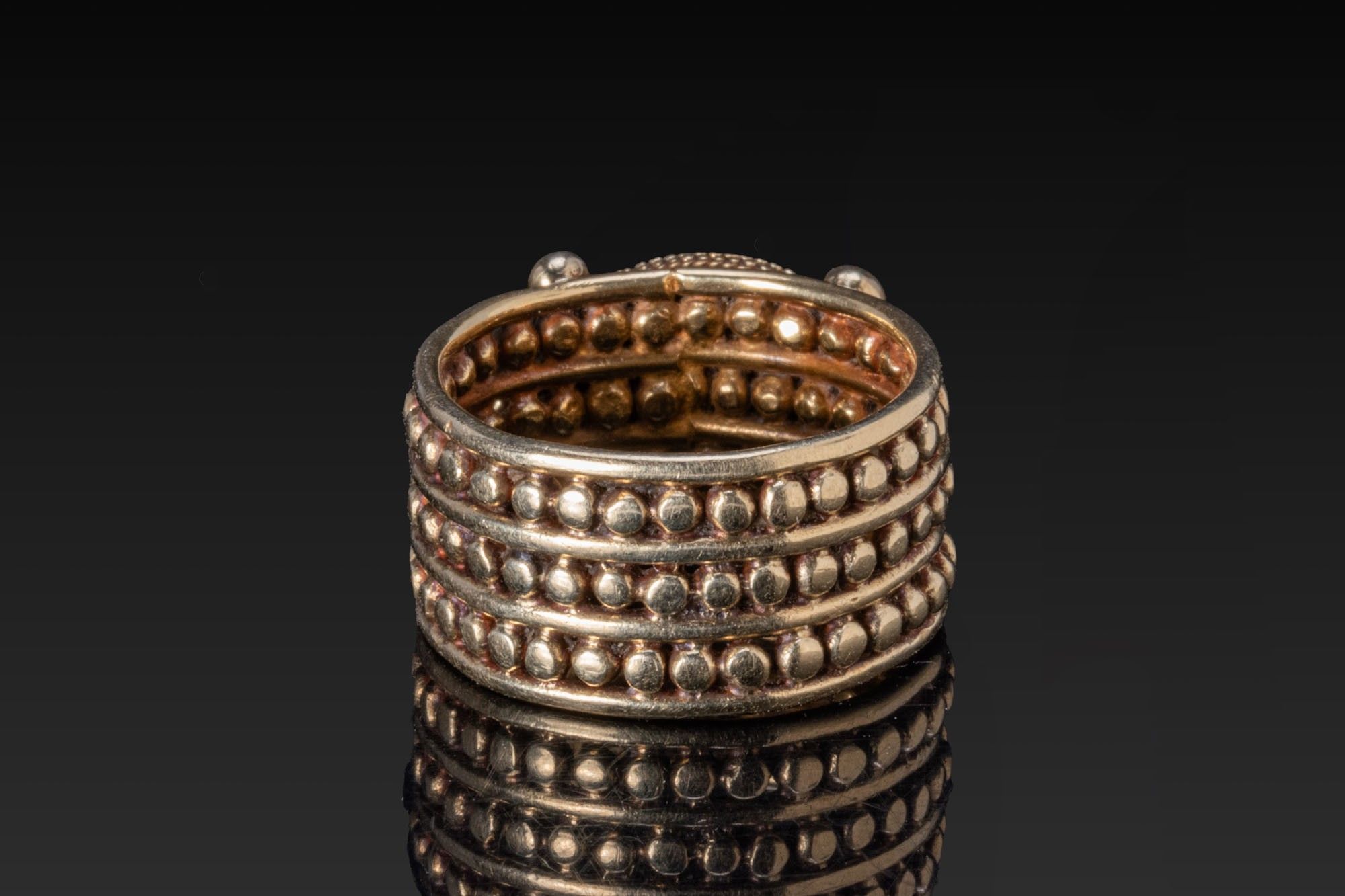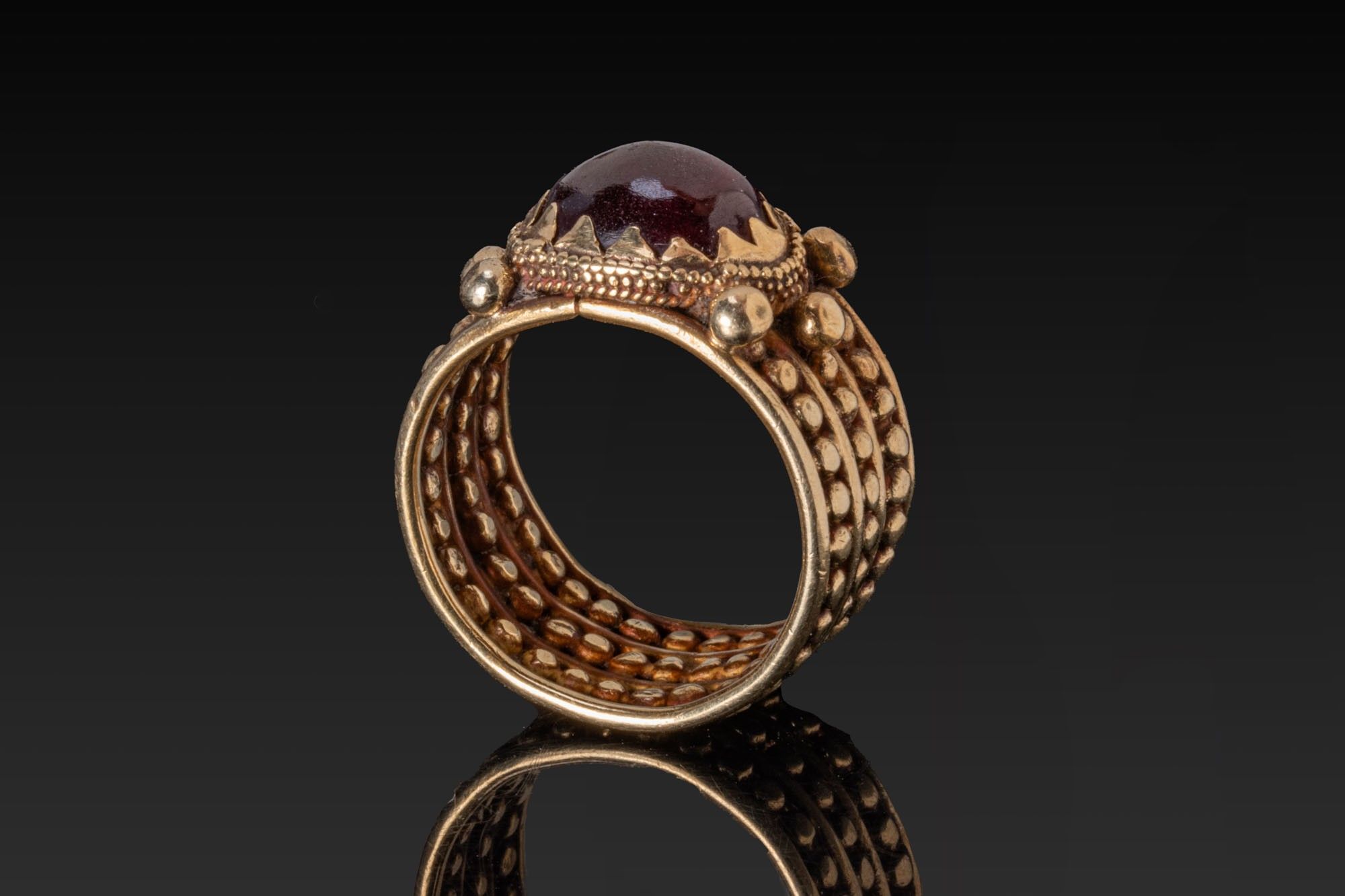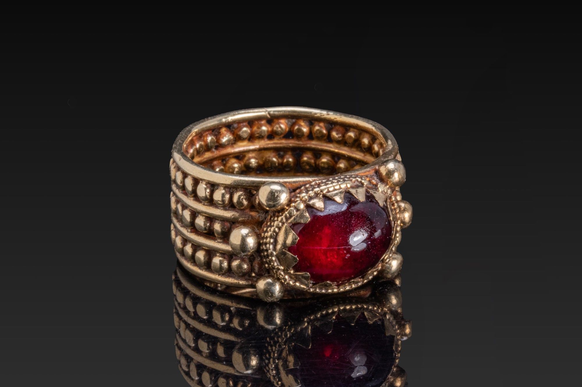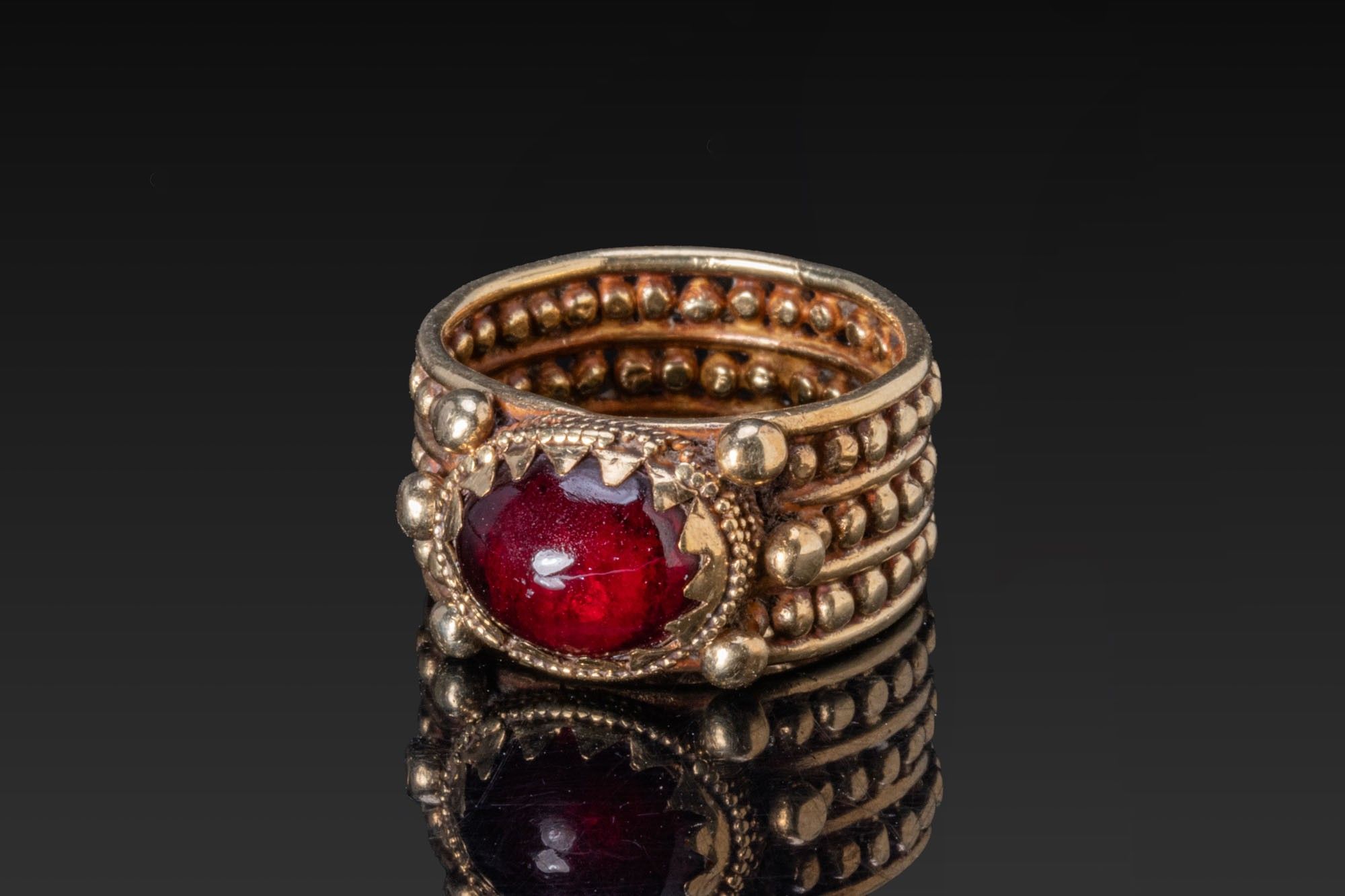 Premium BAGUE EN OR BYZANTIN TARDIF AVEC CABOCHON DE GRENAT ROUGE.