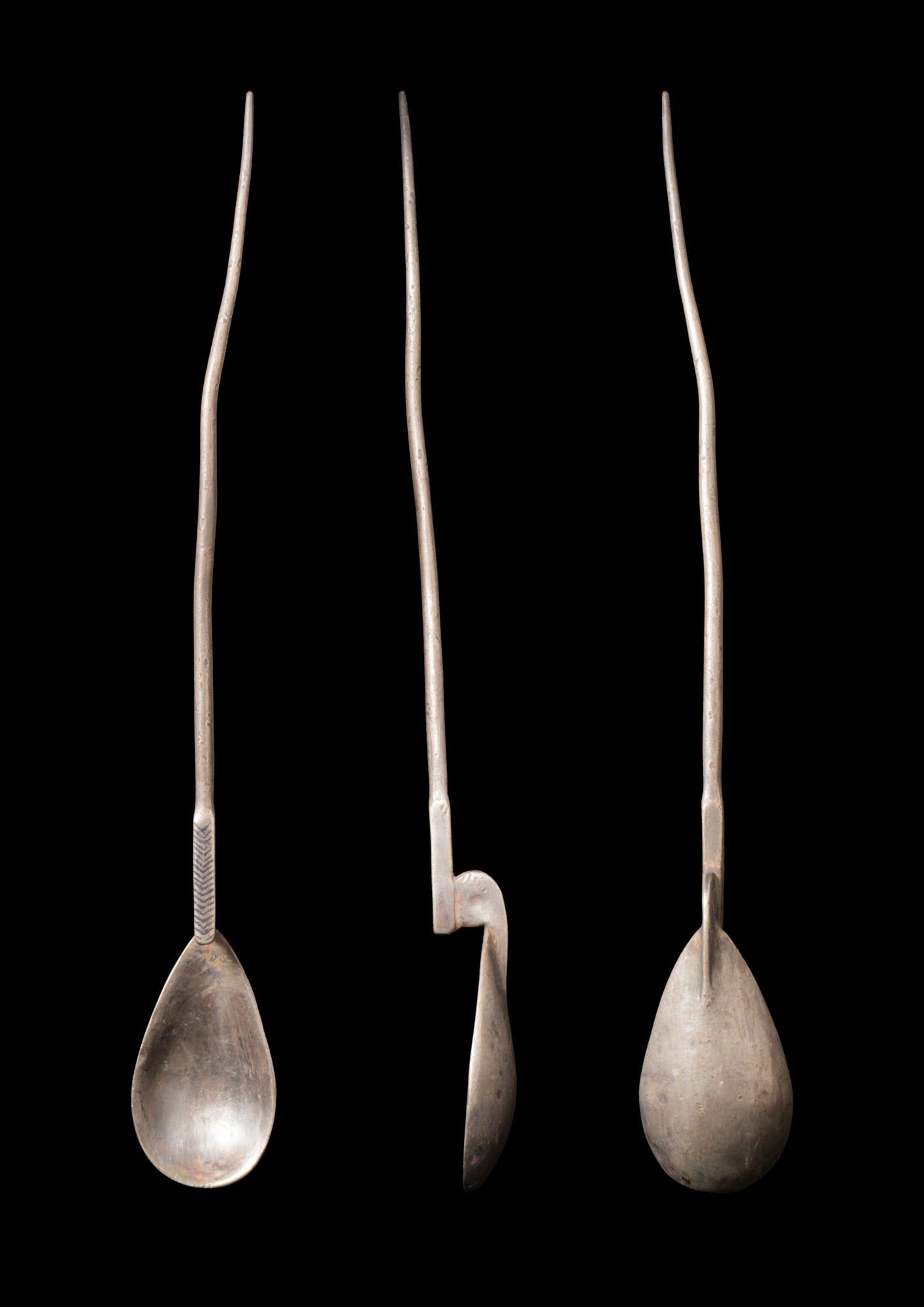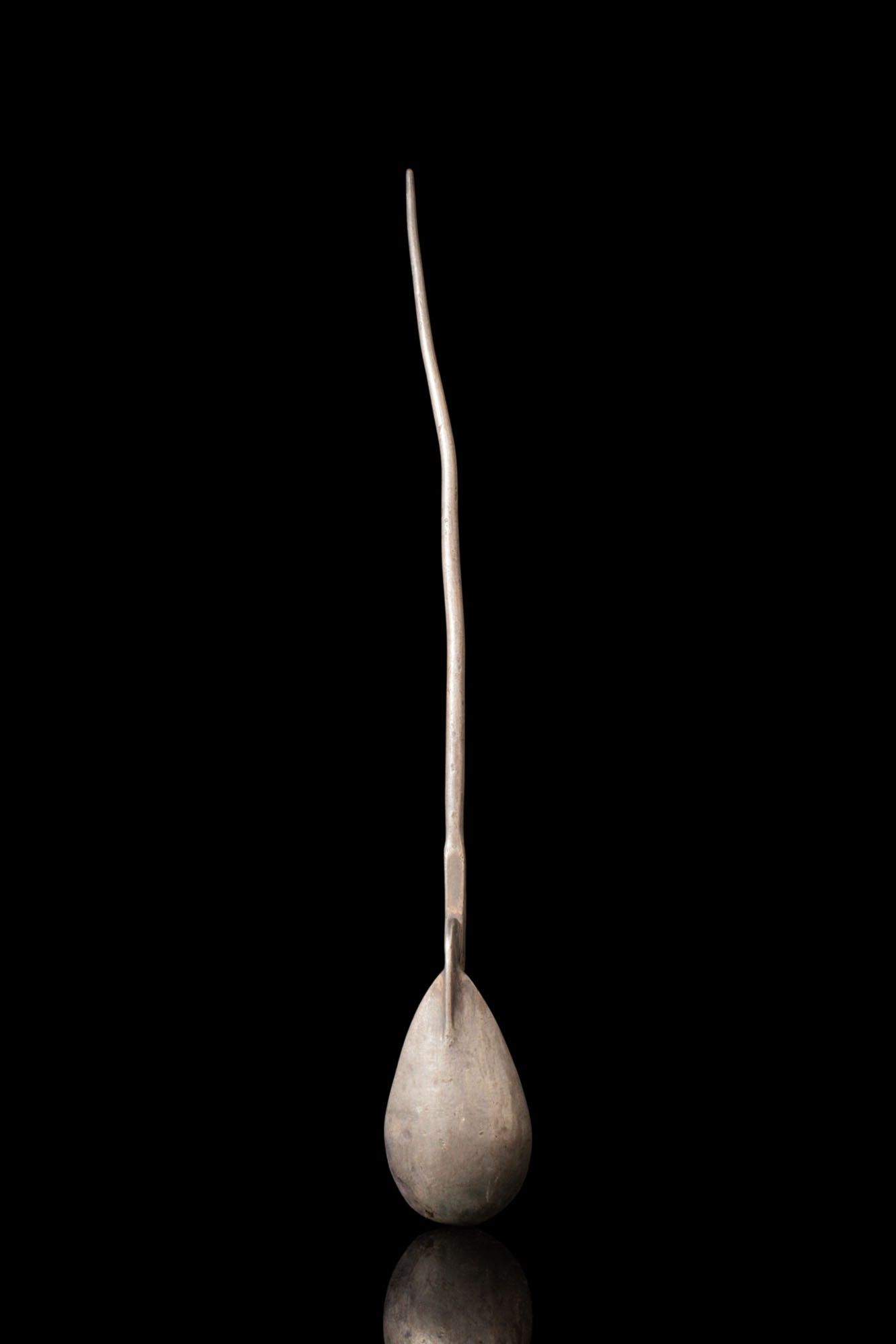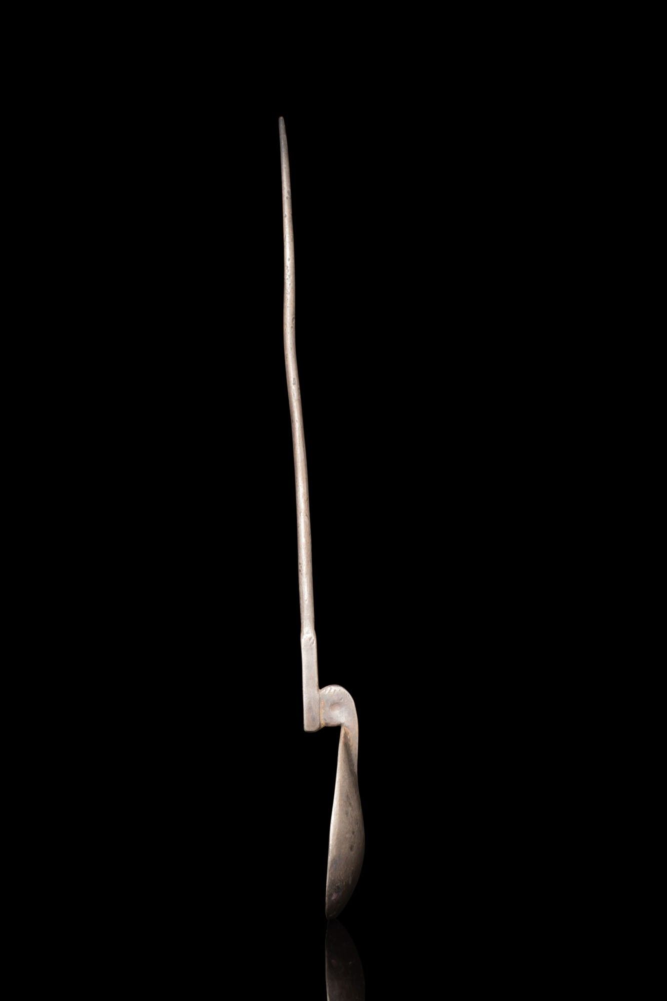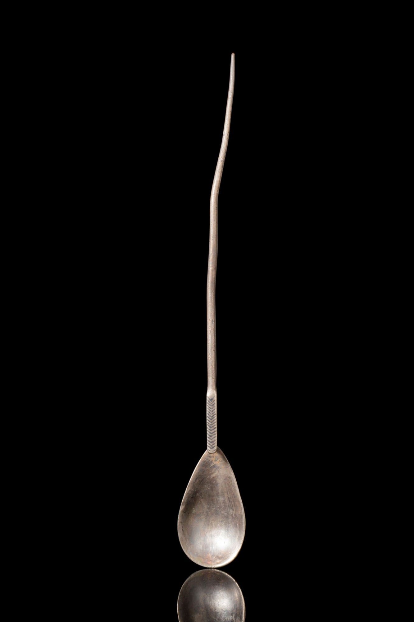 Ca. 300 - 500 AP. J.-C. Cuillère en argent avec un bol ovoïde allongé au profil peu profond. Un court col à angle droit, décoré d'un motif à chevrons niellé, relie le bol à un long manche effilé de section circulaire. Pour des objets similaires, voir : The Metropolitan Museum of Art, numéro d'objet 13.42.1a ; The British Museum, numéro de musée 1899,0425.9. Taille : 180mm x 24mm ; Poids : 21.5g Provenance : Collection privée londonienne, acquise sur le marché de l'art allemand, Munich, avant 2000.