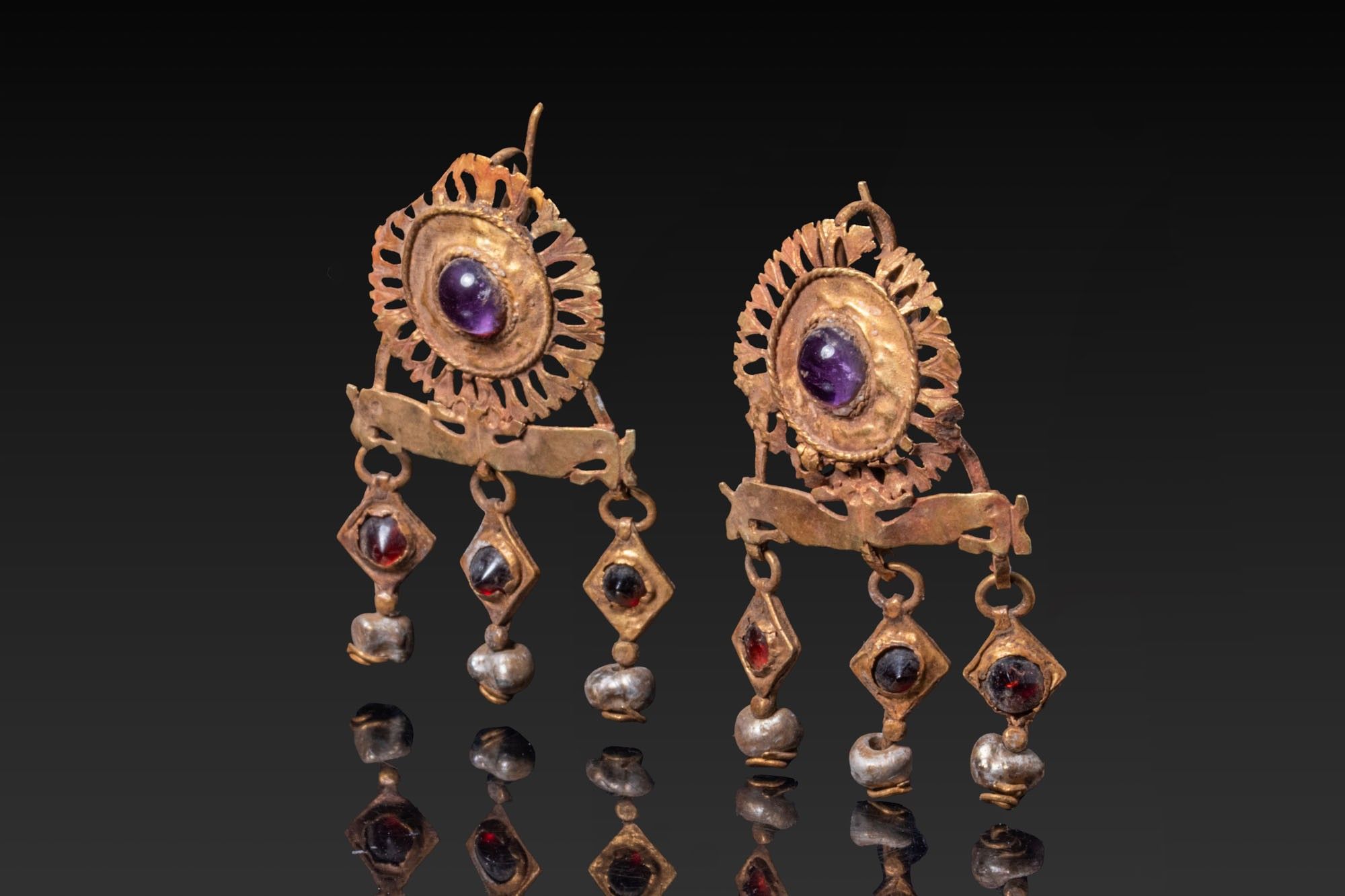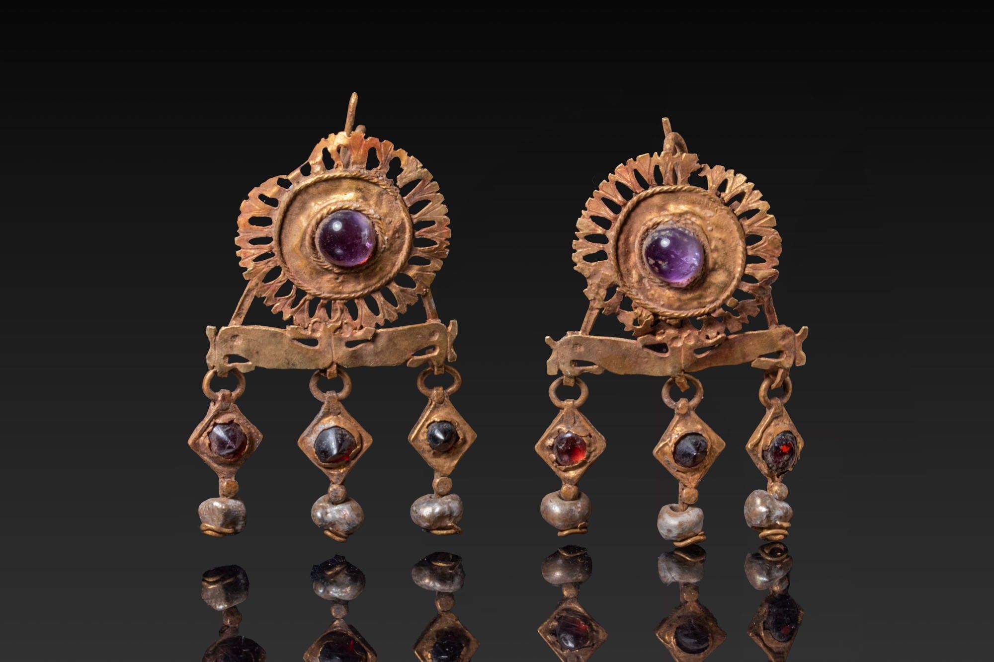 Paire de boucles d'oreilles en or, chacune composée d'une rosette circulaire ajourée surmontant un collet rond surélevé serti d'un cabochon violet. La rosette est reliée par de courts montants à une barre horizontale d'où descendent trois gouttes articulées, formées de colliers rhomboïdaux sertis de petits cabochons et se terminant par des perles globulaires. Les rosettes sont munies de fils d'oreille étroits au verso.