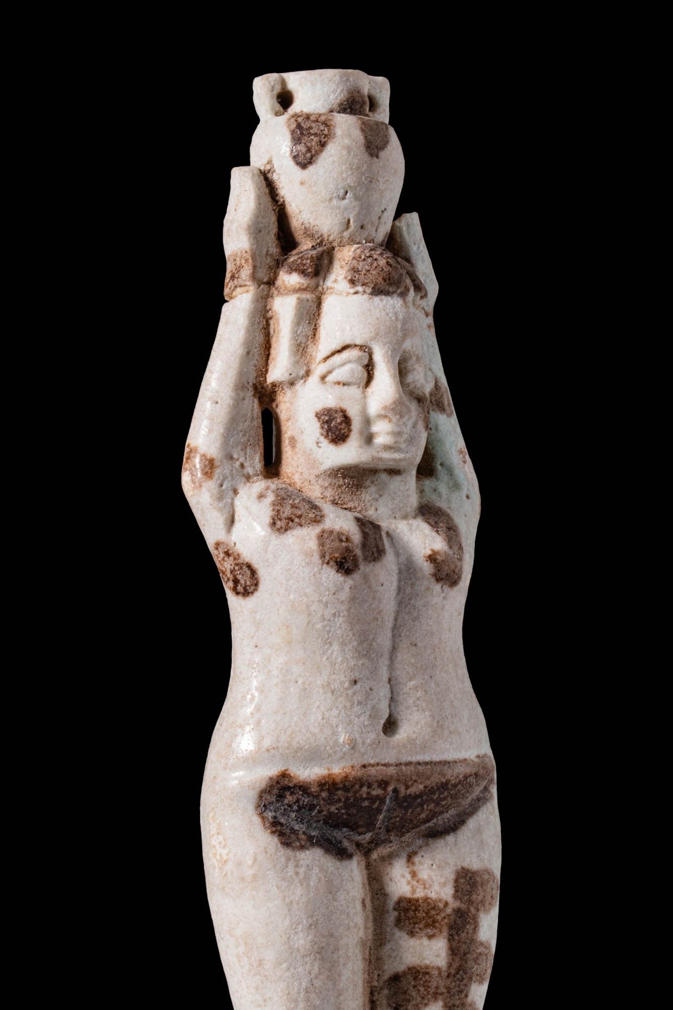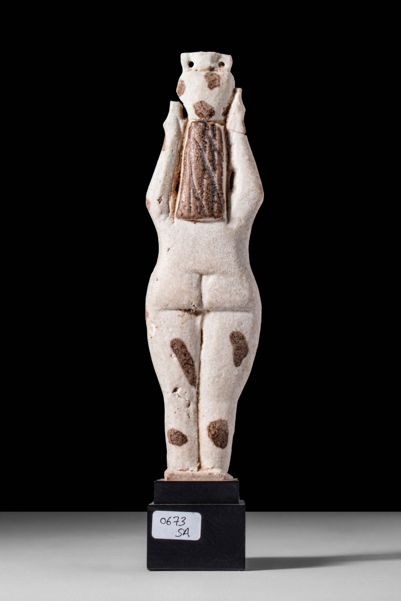 FIGURE ÉGYPTIENNE EN FAÏENCE REPRÉSENTANT UNE FEMME NUE TENANT UN VASE SUR SA TÊTE. Troisième période intermédiaire, 22e-23e dynasties, env. 945 - 715 AV. Cette figure en faïence représente une femme nue debout, les deux mains soutenant une amphore à deux anses posée en équilibre sur sa tête. Ses traits sont stylisés, ses membres allongés et son dos plat. La surface est émaillée dans un ton crème avec des accents noirs soulignant les yeux, le triangle pubien, les marques décoratives sur les membres et le torse, ainsi que le récipient qu'elle porte. Un bloc rectangulaire sous les pieds représente le cercueil de Bastet. Monté. Pour des objets similaires, voir : The Metropolitan Museum of Art, numéro d'objet : 86.1.55 ; J. Bulté, Talismans égyptiens d'heureuse maternité, Paris, 1991, p. 43, doc. 101, pl. 19. Taille : 145mm x 40mm ; Poids : 130g Provenance : Collection Prince, 1990-2014 ; Ex. Jacques Billen. Cet objet a fait l'objet d'une vérification dans la base de données de l'Art Loss Register et est accompagné d'une lettre de confirmation.