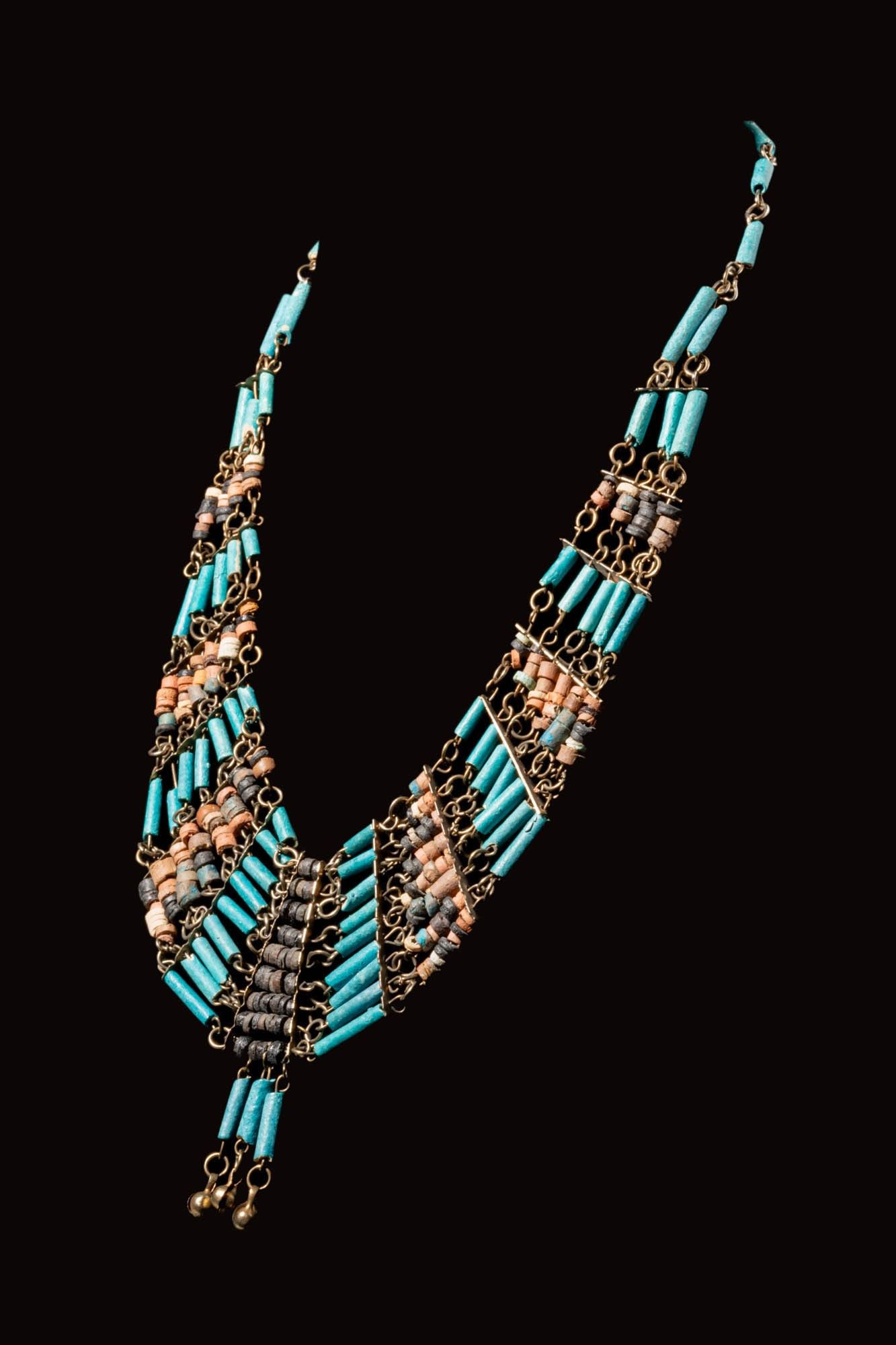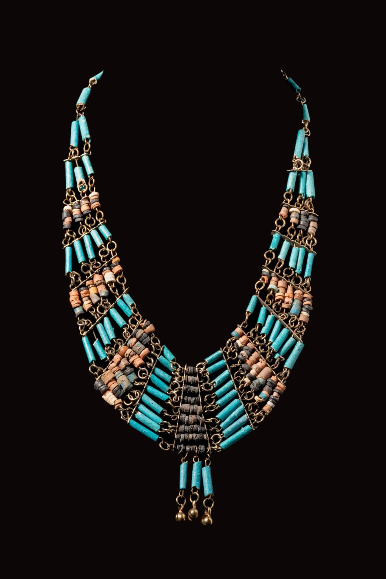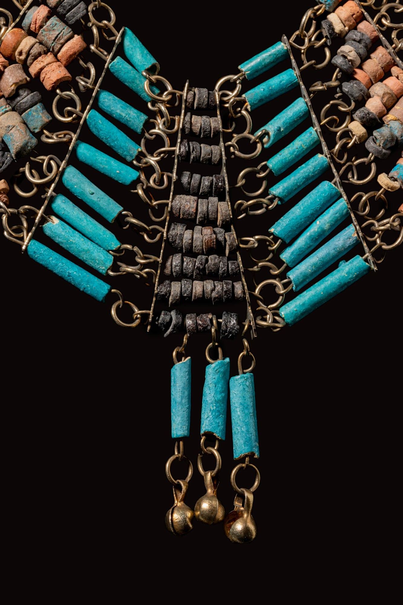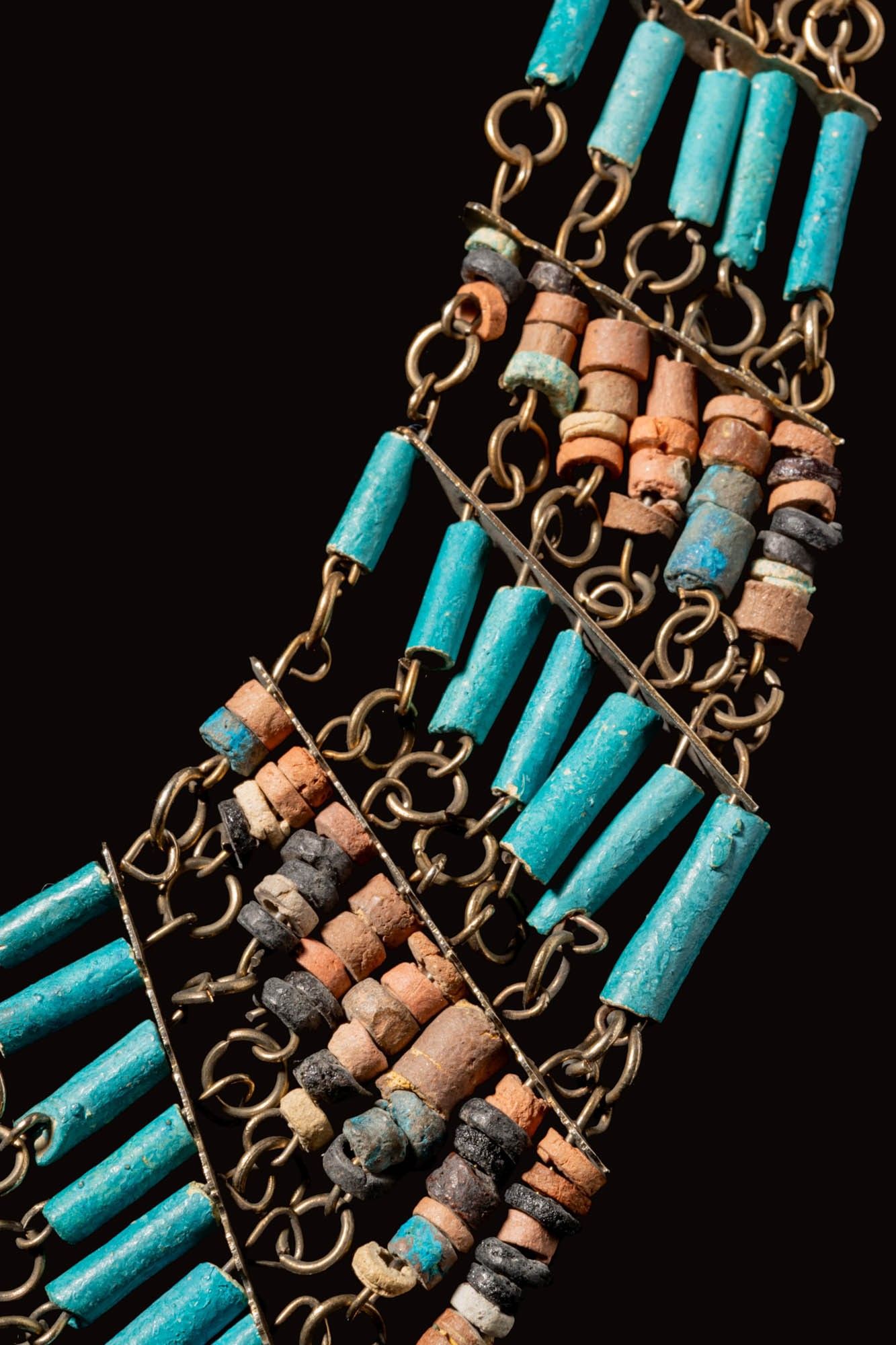 Période tardive, Ca. 664 - 332 AV. Un joli collier à porter en forme de collier pectoral égyptien. Le collier est formé de perles tubulaires en faïence ancienne de couleur bleu aqua et vert-brun. Des perles en forme de disque et de tonneau dans des tons violets, bruns et beiges sont également utilisées. Le collier est composé de neuf rangs de perles tubulaires et cylindriques. Le centre est orné de trois pendentifs avec des pastilles d'or. Bracelet. Taille : 290/580mm x 20mm ; Poids : 36g. Provenance : Propriété d'une galerie londonienne, acquise sur le marché de l'art américain ; Ex. Arnold Saslow, collier acquis par McAdams Ltd. dans les années 1970. Cet objet a fait l'objet d'une vérification dans la base de données de l'Art Loss Register et est accompagné d'une lettre de confirmation.
