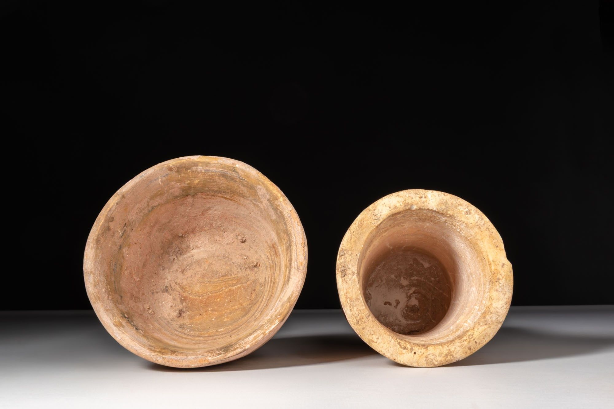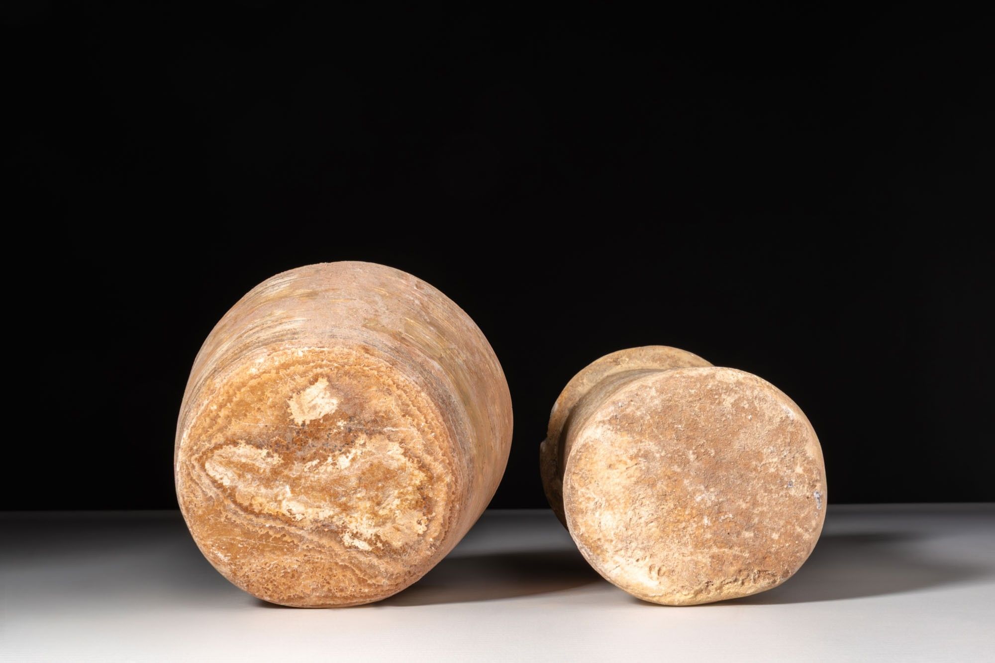 Une paire de récipients en albâtre, comprenant, de gauche à droite : un bol aux côtés légèrement évasés et à la base plate, présentant de fortes bandes naturelles ; une grande jarre au corps cylindrique et au large bord évasé.