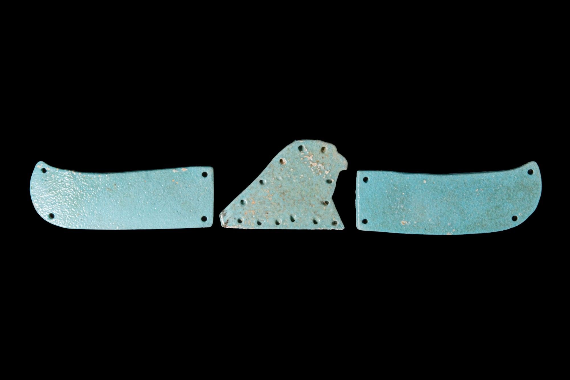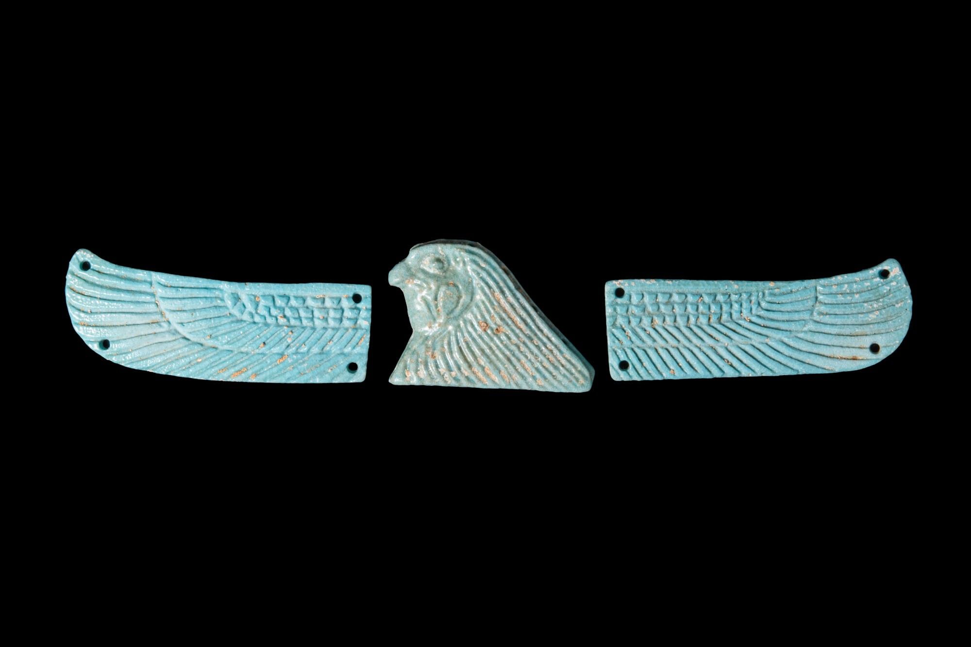 Une collection d'amulettes en faïence comprenant, de gauche à droite : une plaque d'aile moulée avec des plumes de vol superposées et percée pour la fixation le long des bords ; une borne de tête de faucon Horus de profil avec un œil et un bec incisés et un périmètre de perforations de couture ; et une plaque d'aile assortie à la première avec des détails de plumes comparables et des trous de fixation. Ces amulettes étaient destinées à un pectoral de scarabée ailé et à un large collier de wesekh.