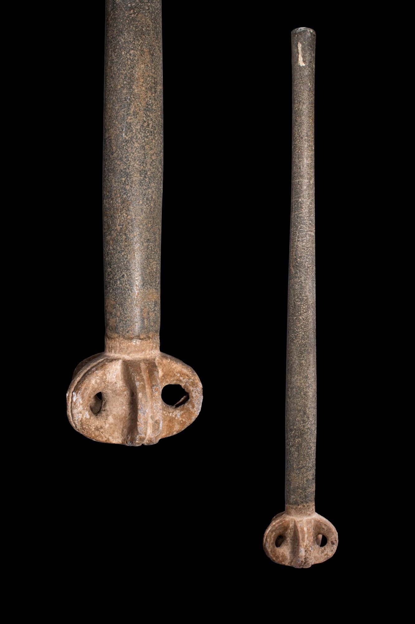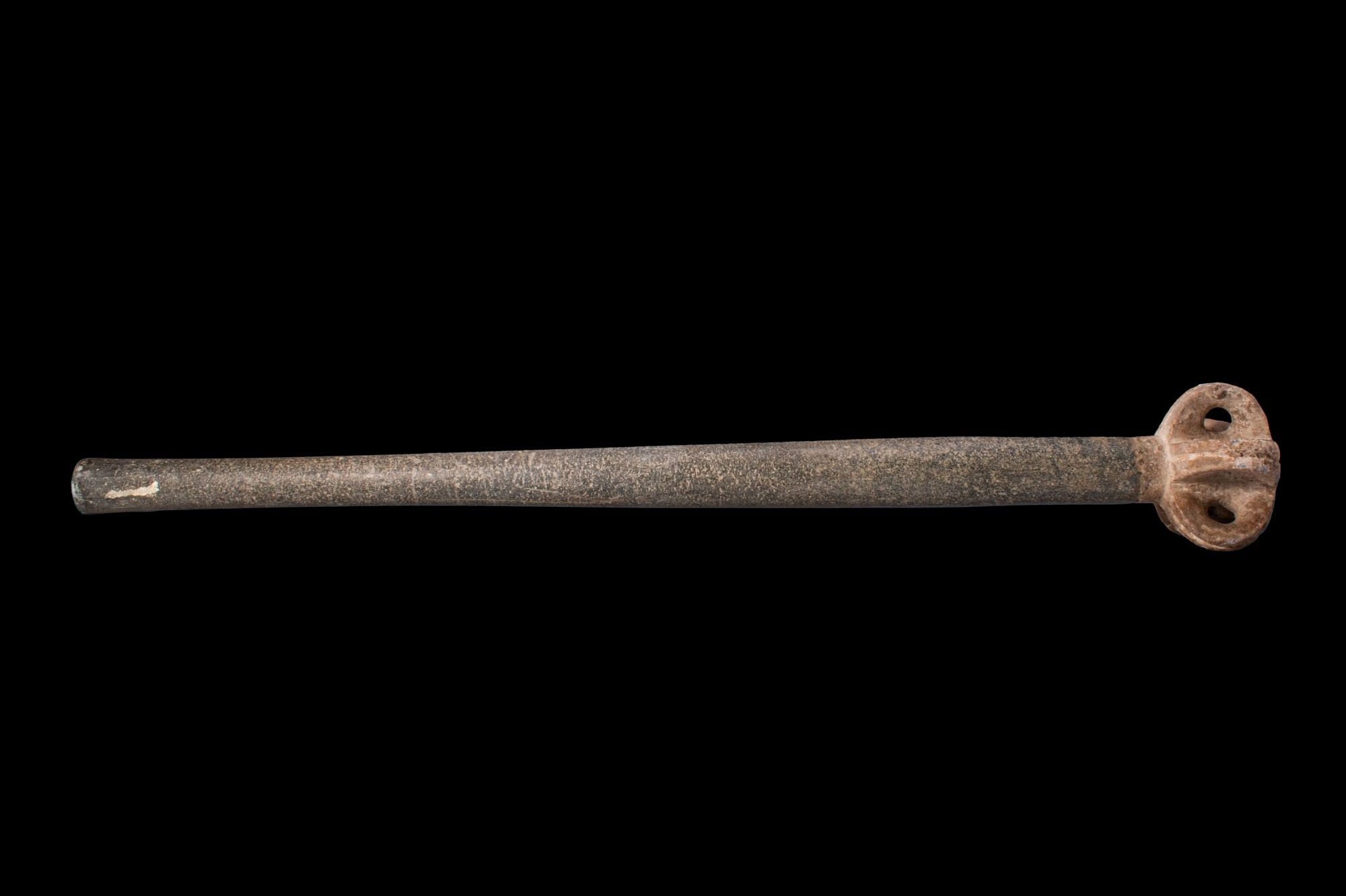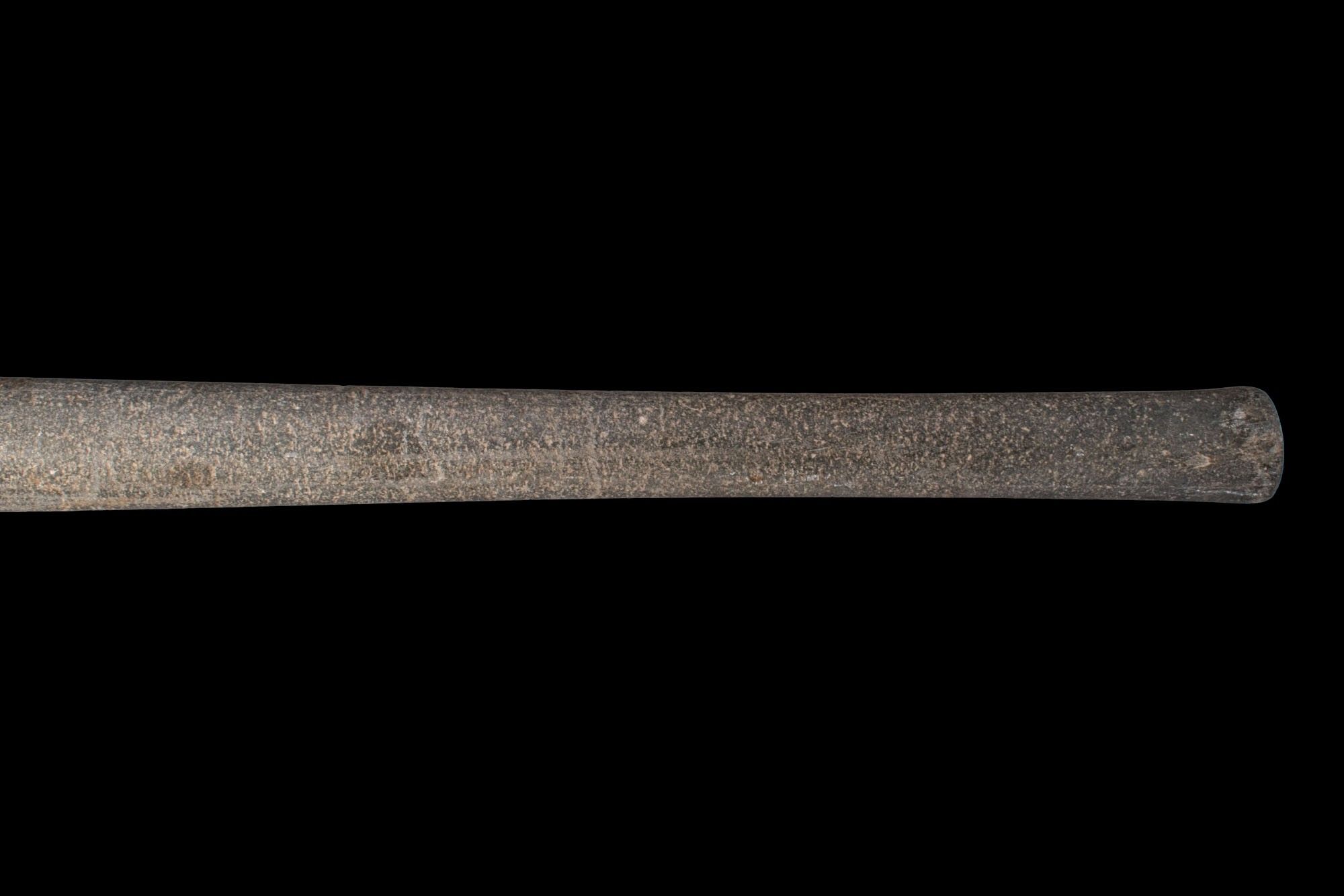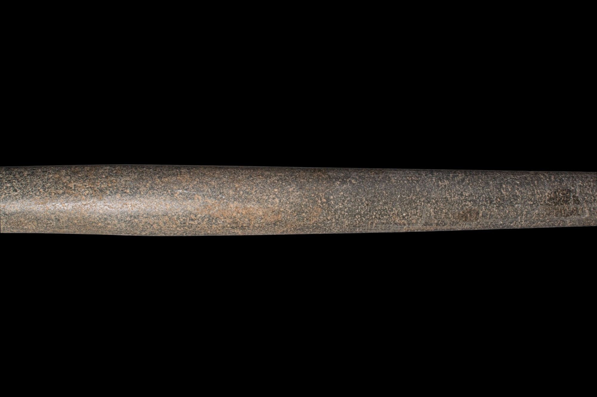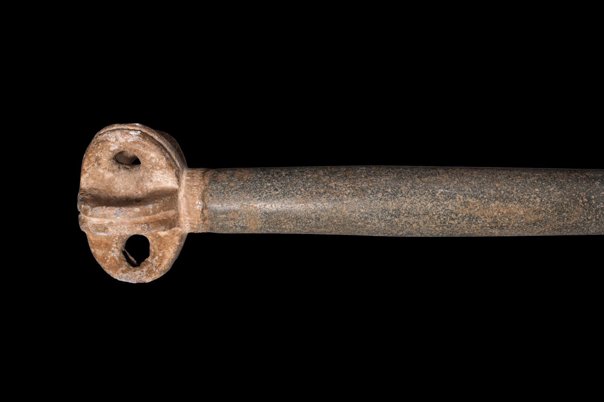 Ca. 2000 - 1500 AV. Cette massue en pierre dure est dotée d'une longue tige cylindrique effilée et d'un court collier. La tête est modelée comme un bossage arrondi articulé avec des lobes, chaque lobe étant percé et divisé par des côtes moulées. Taille : 830 mm x 125 mm ; poids : 6,17 kg Provenance : Collection privée londonienne ; acquis en Allemagne ; anciennement dans la collection de C. E. Schultze, Munich, fin des années 1980. Cet objet a fait l'objet d'une vérification dans la base de données de l'Art Loss Register et est accompagné d'une lettre de confirmation.