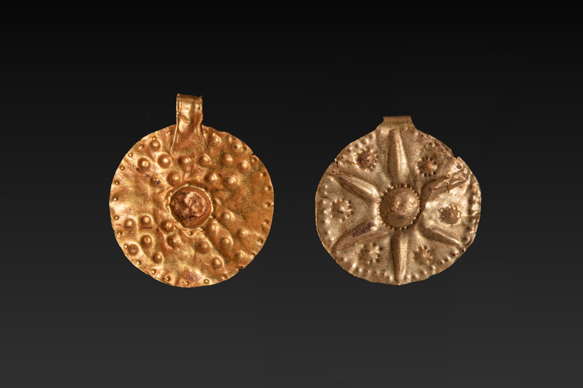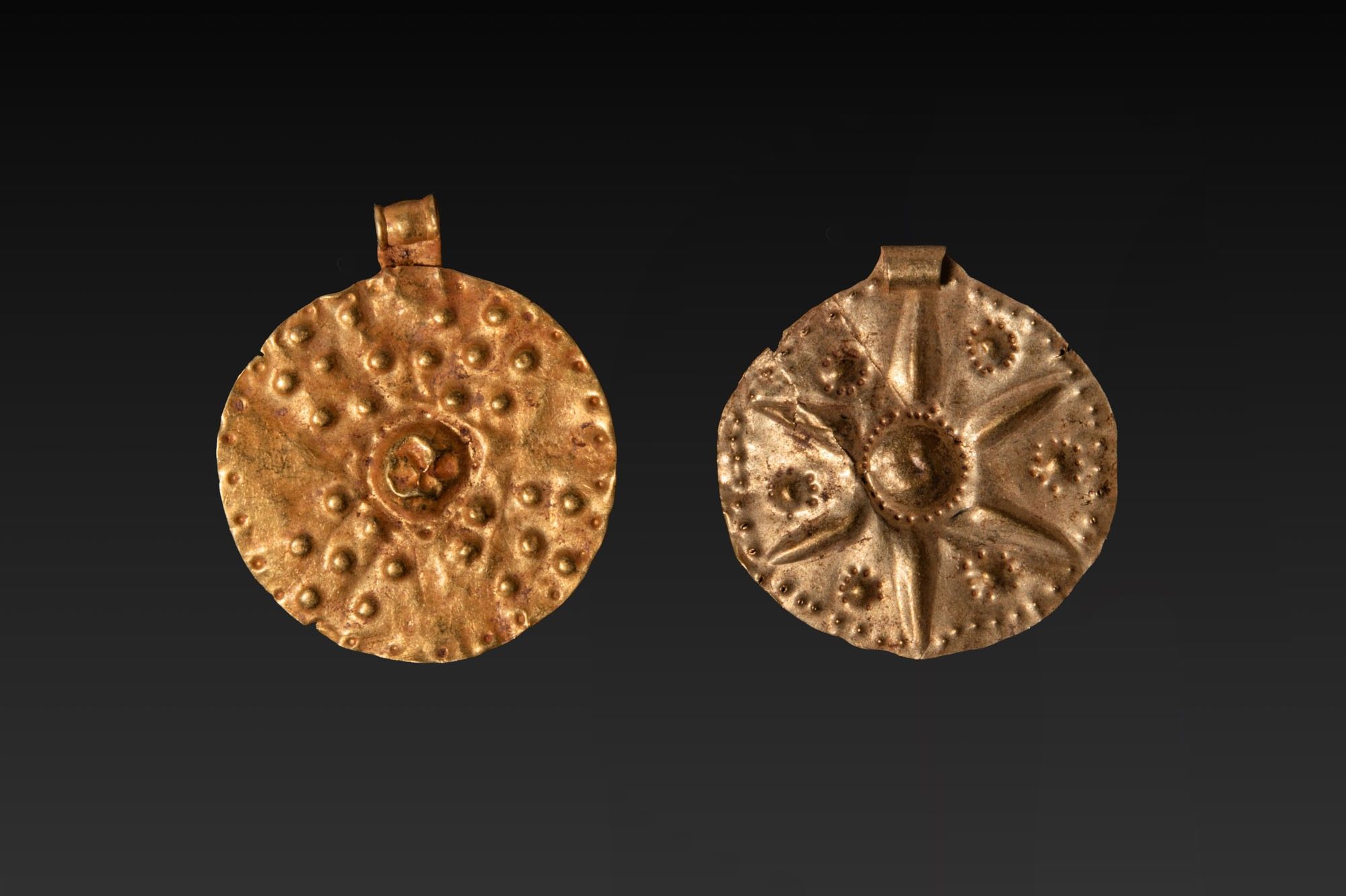 Une paire de médaillons en or repoussé, comprenant, de gauche à droite : un pendentif circulaire avec un tube enroulé, décoré de pastilles éparses en relief autour d'un bossage central ; et un pendentif circulaire en feuille avec un tube de suspension enroulé, la face centrée par un bossage en dôme à l'intérieur d'un anneau perlé et six côtes rayonnantes formant une étoile, les champs poinçonnés de petites rosettes et entourés d'une bordure en pointillé.