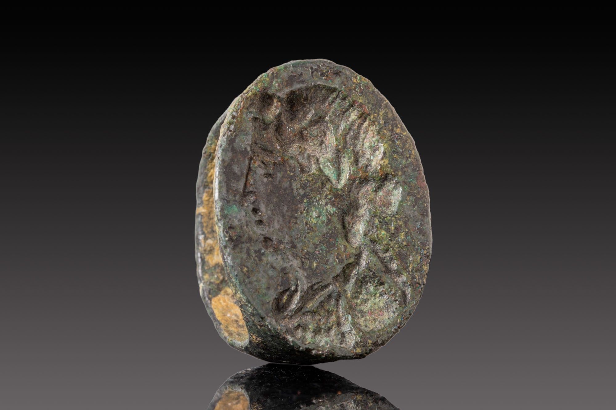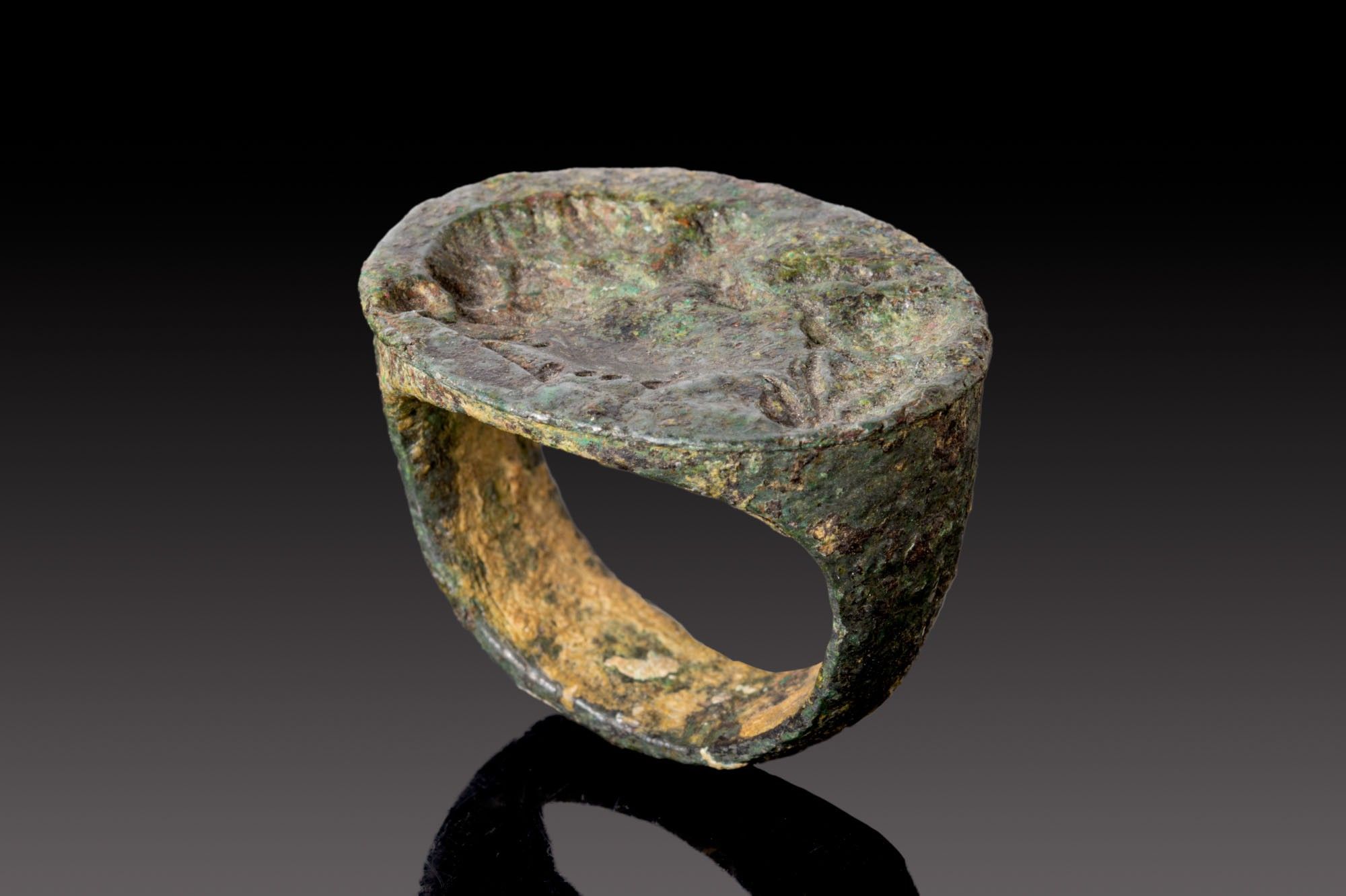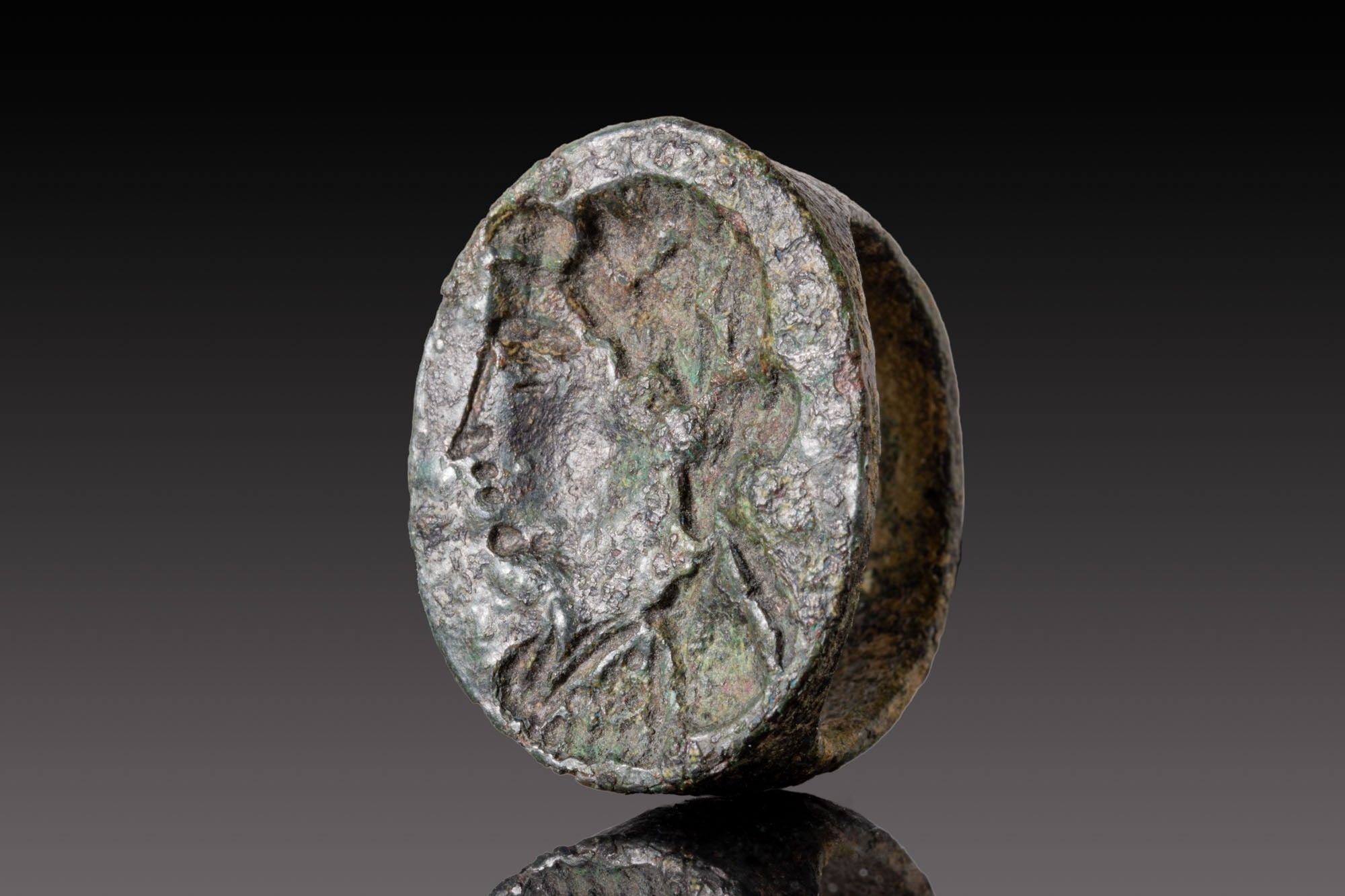 Ca. 300 - 100 AV. Bague en bronze à large chaton ovale gravé du profil gauche d'une femme noble, les cheveux ramenés en arrière en vagues lisses jusqu'à un nœud bas. Le portrait montre un front haut, un nez droit et de petites lèvres pincées au-dessus d'un menton arrondi, avec un œil en amande enfoncé sous une paupière supérieure fortement incisée et un front court et linéaire. La lunette est soutenue par un large anneau plat qui s'élargit sous le disque et se contracte vers l'arrière. Pour des exemples similaires, voir : J. Bagot, El legado de Hefesto : A Memorial to a Private Collection of Ancient Rings and Glyptics, n. 111. Taille : D:18.14mm / US : 8 / UK : P 1/2 ; Poids : 18g Provenance : Collection privée du Royaume-Uni ; d'une collection américaine formée dans les années 1980 ; cet objet a été vérifié dans la base de données de l'Art Loss Register et est accompagné d'une lettre de confirmation.