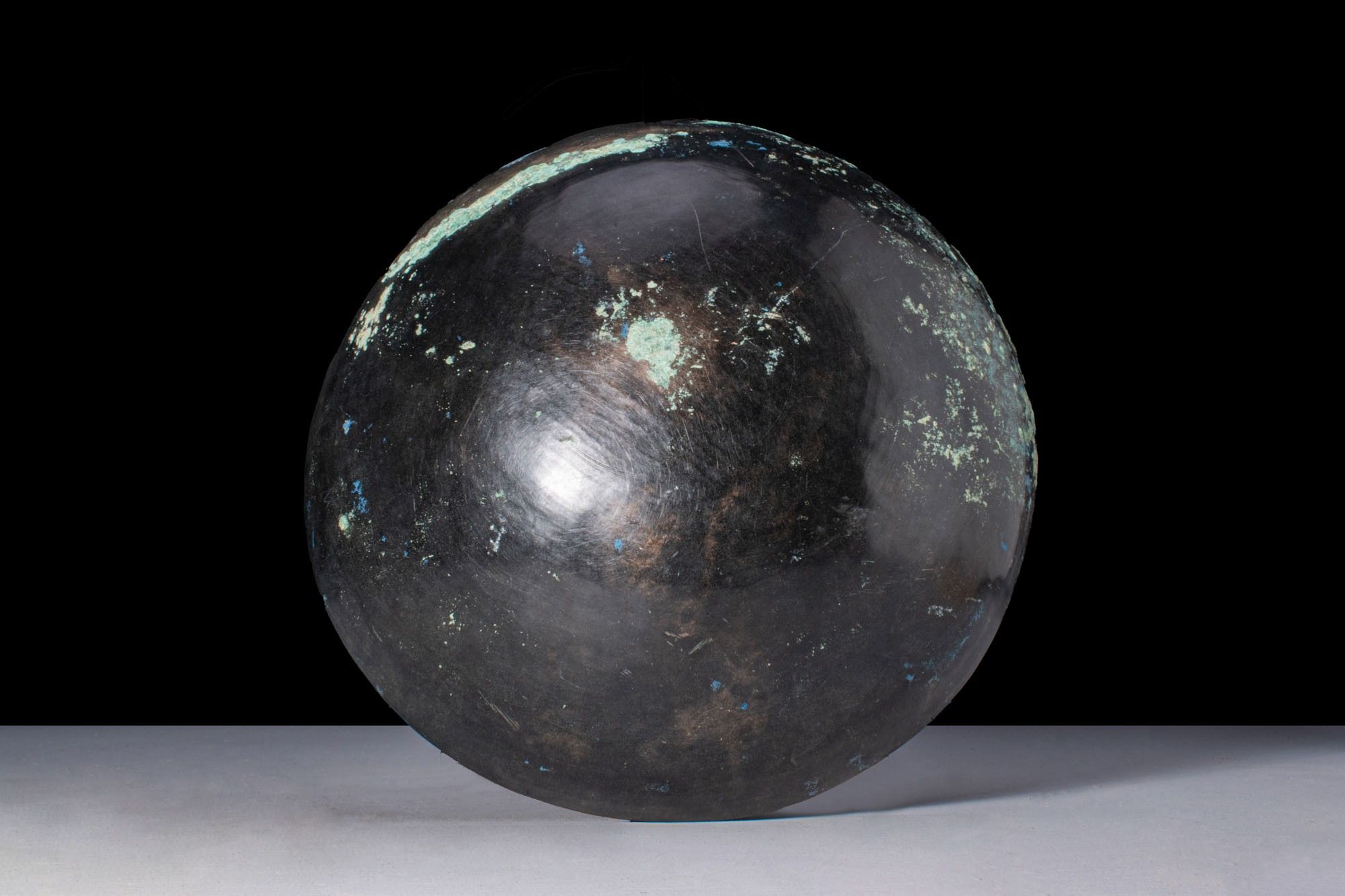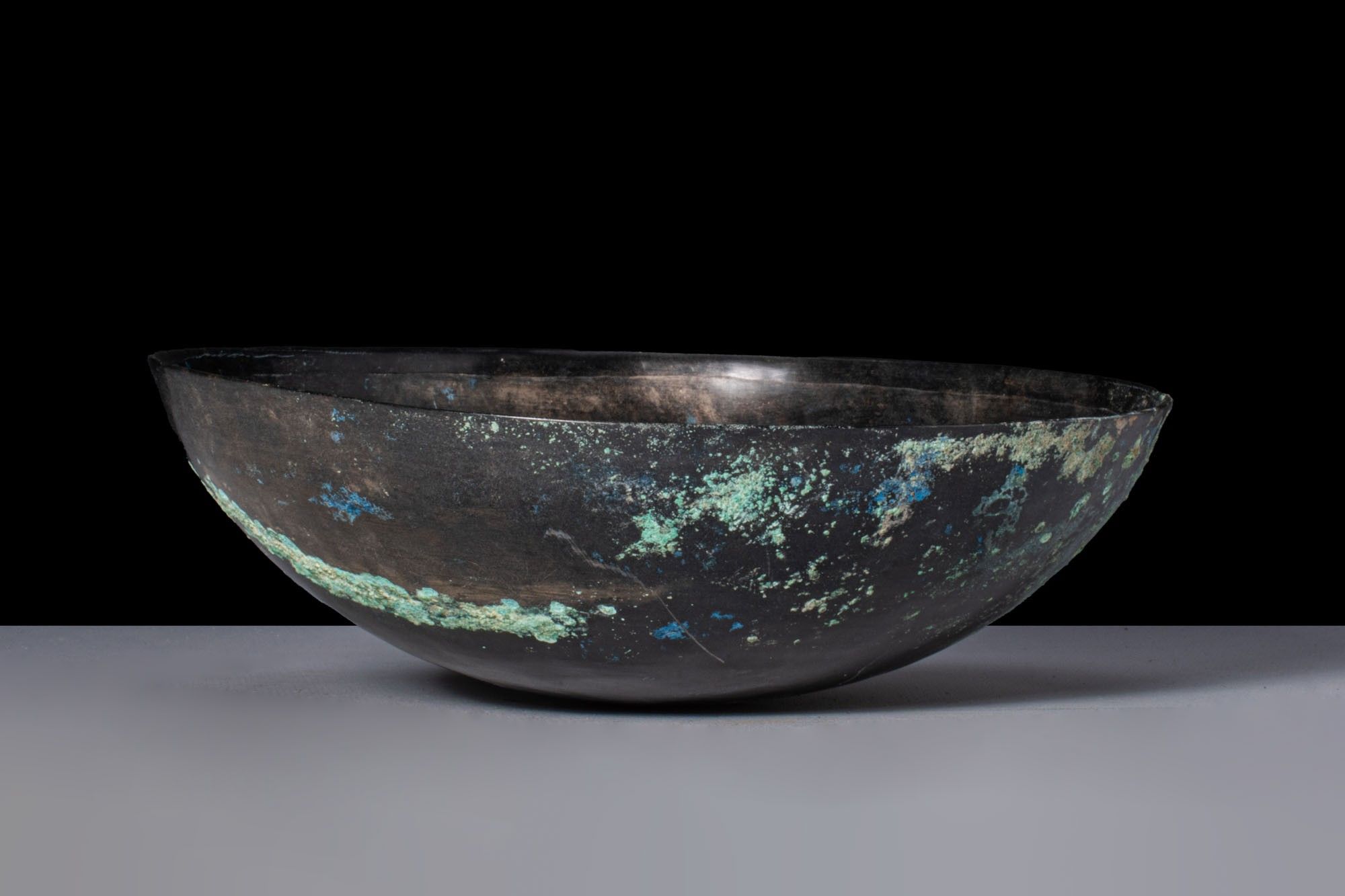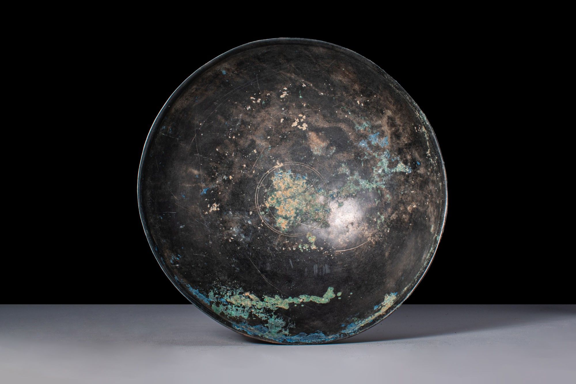 Cette coupe en bronze martelé présente un profil hémisphérique. Le centre intérieur est décoré de cercles concentriques incisés.