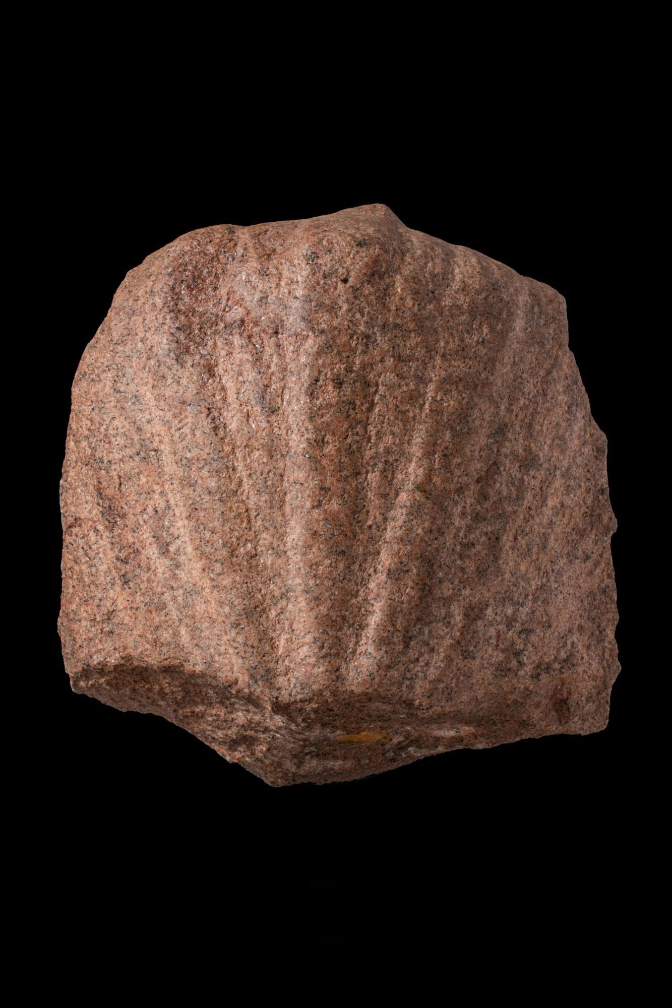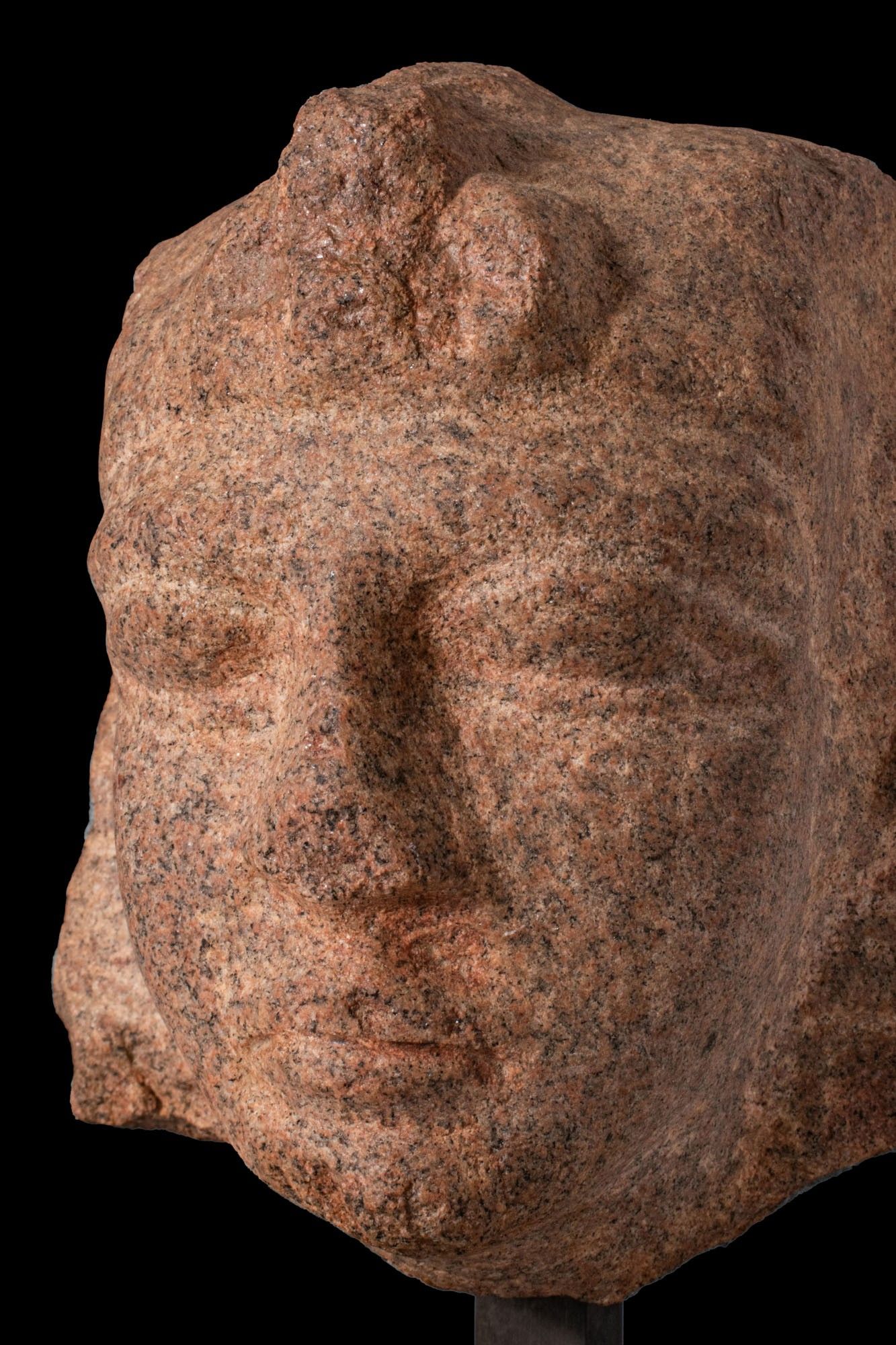 Tête de pharaon en granit rouge. Le visage est large et arrondi, avec des joues pleines, une bouche légèrement incurvée et des yeux en amande sous des sourcils arqués. Un uræus est faiblement visible au centre du front. Les restes de la coiffe du némès encadrent les côtés de la tête. La pièce est montée sur un socle personnalisé.
