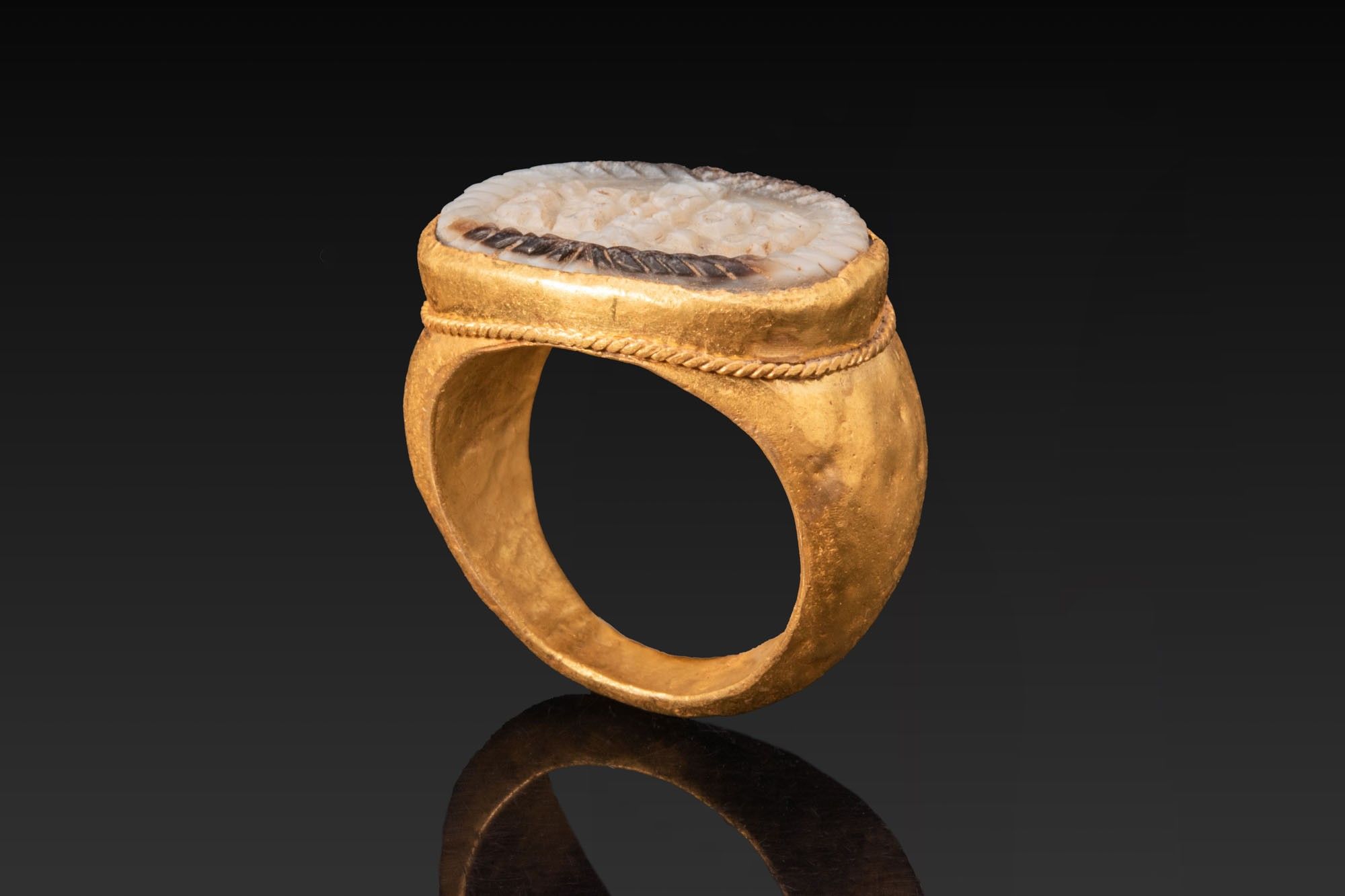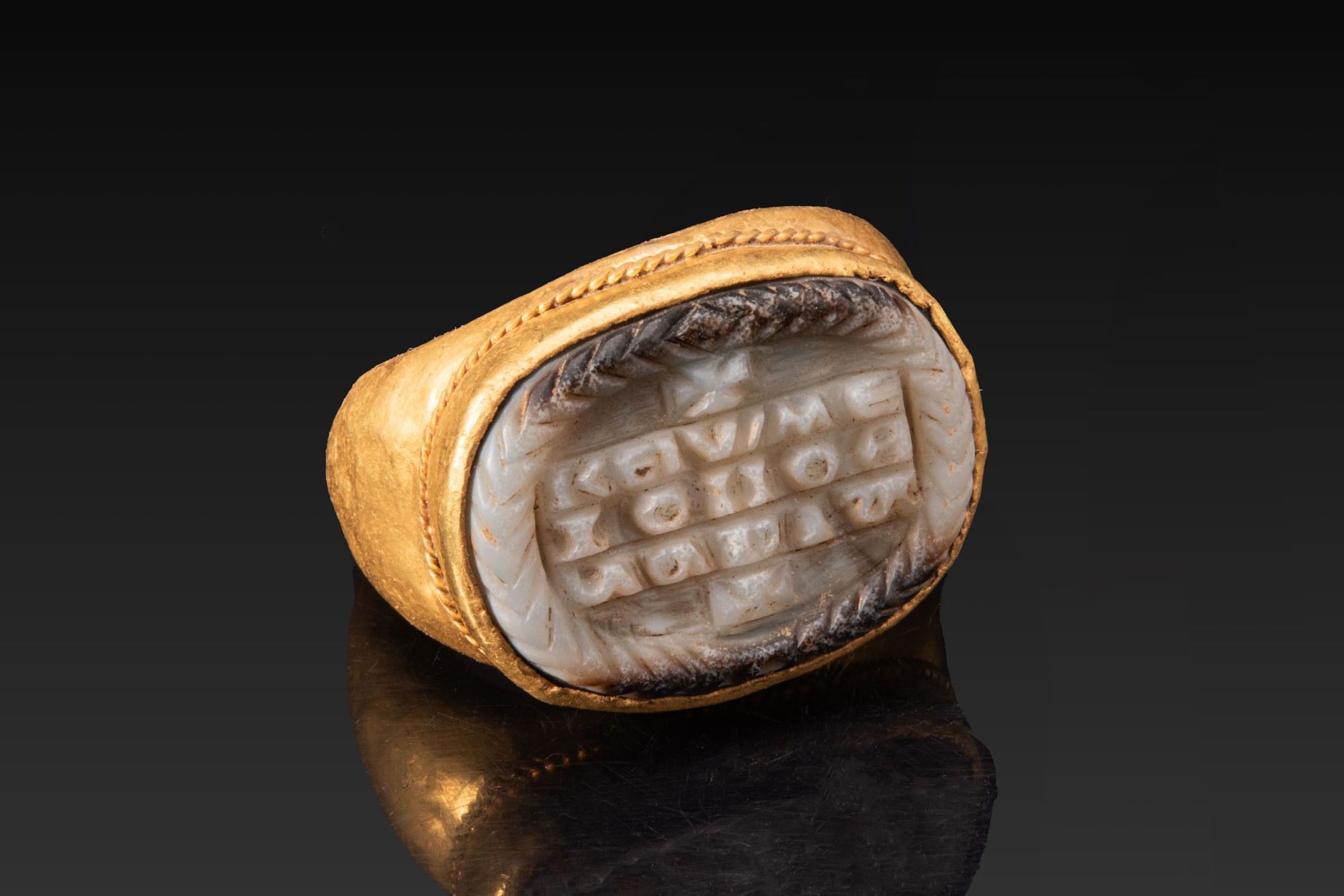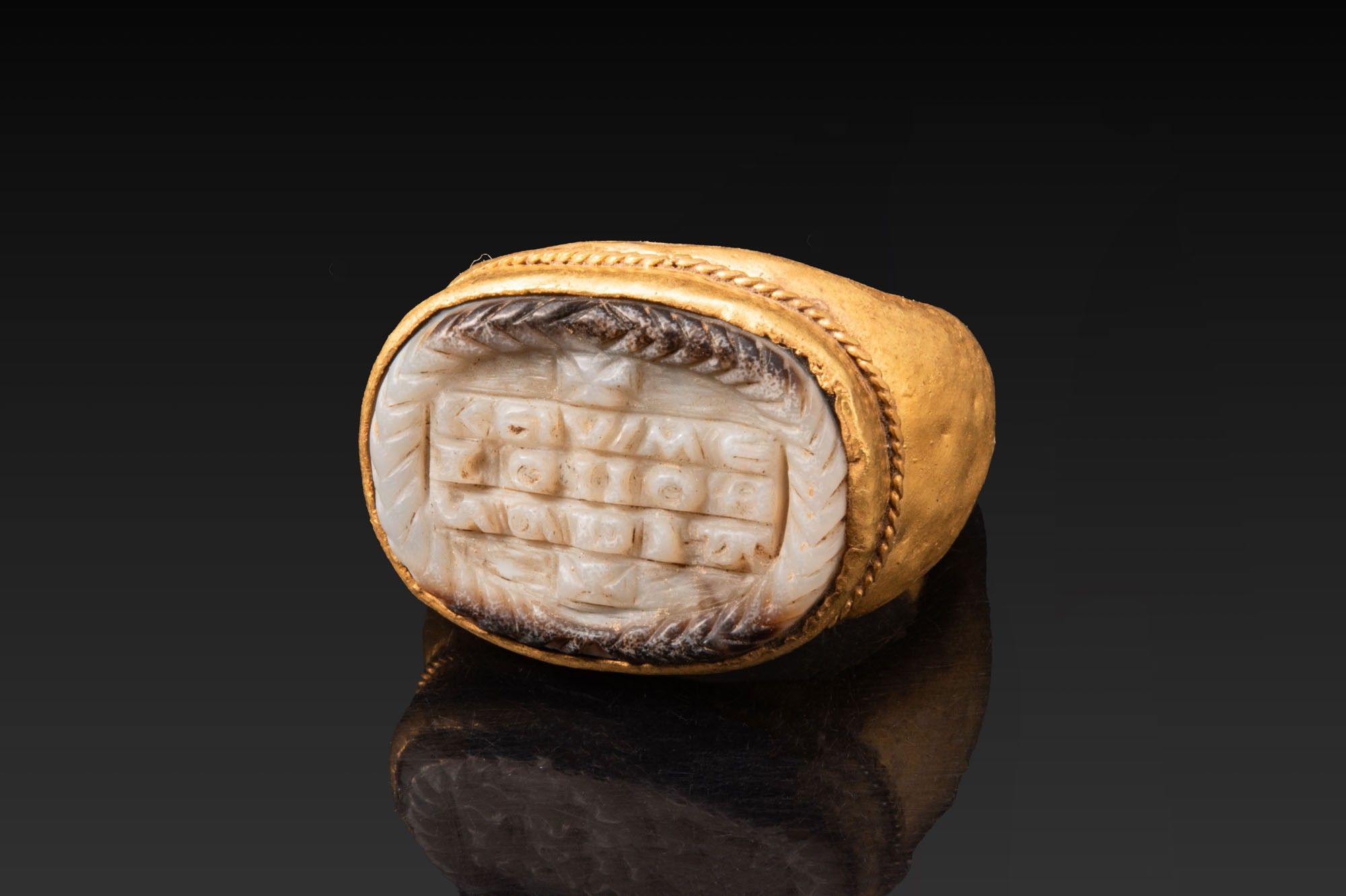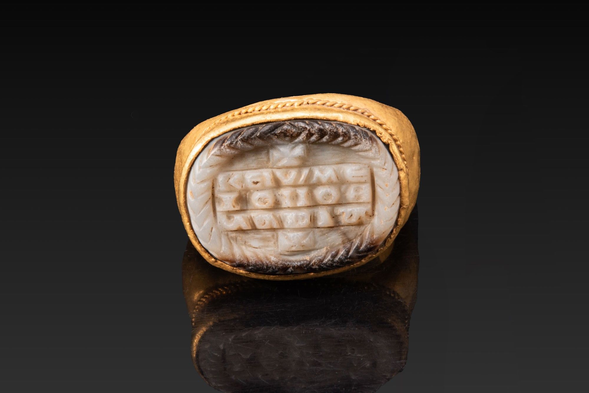 GRAND CAMÉE EN AGATE PORTANT UNE INSCRIPTION ROMAINE TARDIVE DANS UN ANNEAU EN OR.