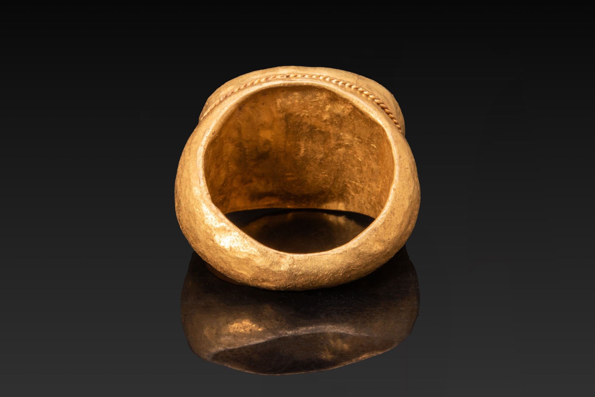 Un rare et grand camée religieux en agate inscrit, serti dans un anneau d'or substantiel d'une période peut-être plus tardive. La gemme ovale est sculptée de trois registres de lettres grecques, entourées d'une bordure en chevron et flanquées de petites croix en haut et en bas. La bague possède un anneau épais et arrondi qui s'étend jusqu'à de larges épaules et est dotée d'un collet ovale surélevé avec un filet à torsion de corde. Inscription : "_____ ______ __ _____" - Le Seigneur aide son serviteur.