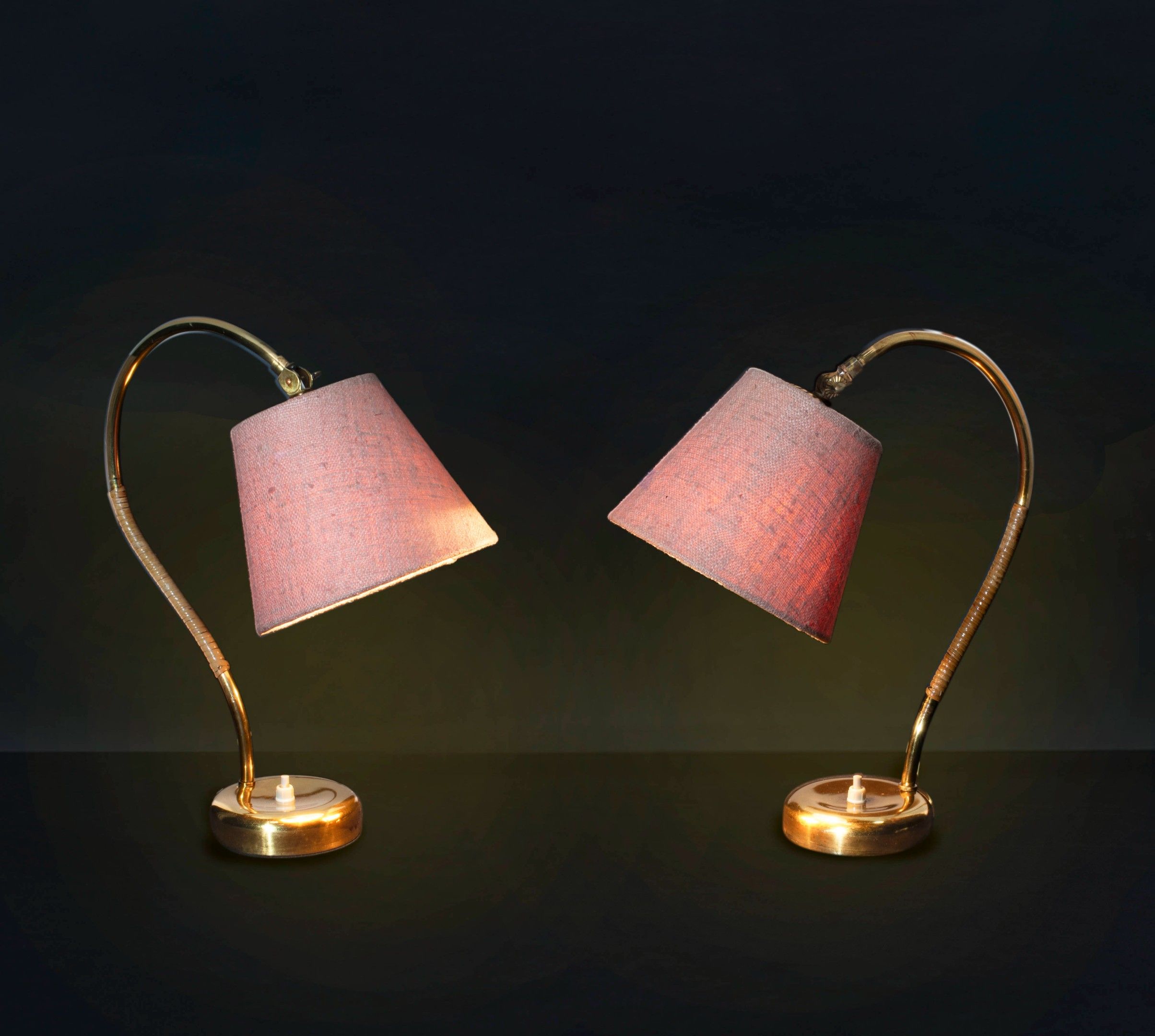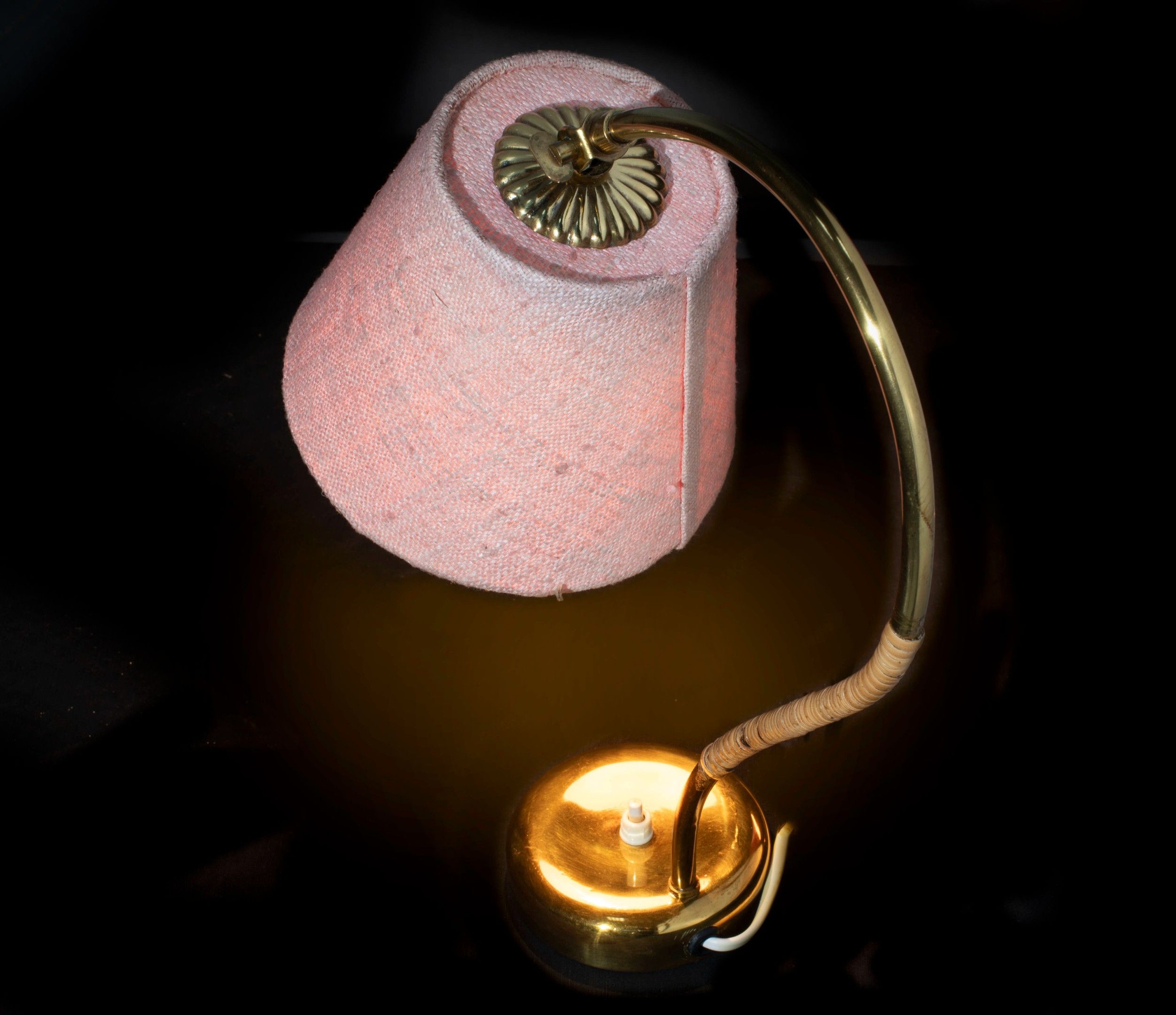 A brass, rattan and fabric pair of table lamps by Mauri Almari for Idman - circa 1950