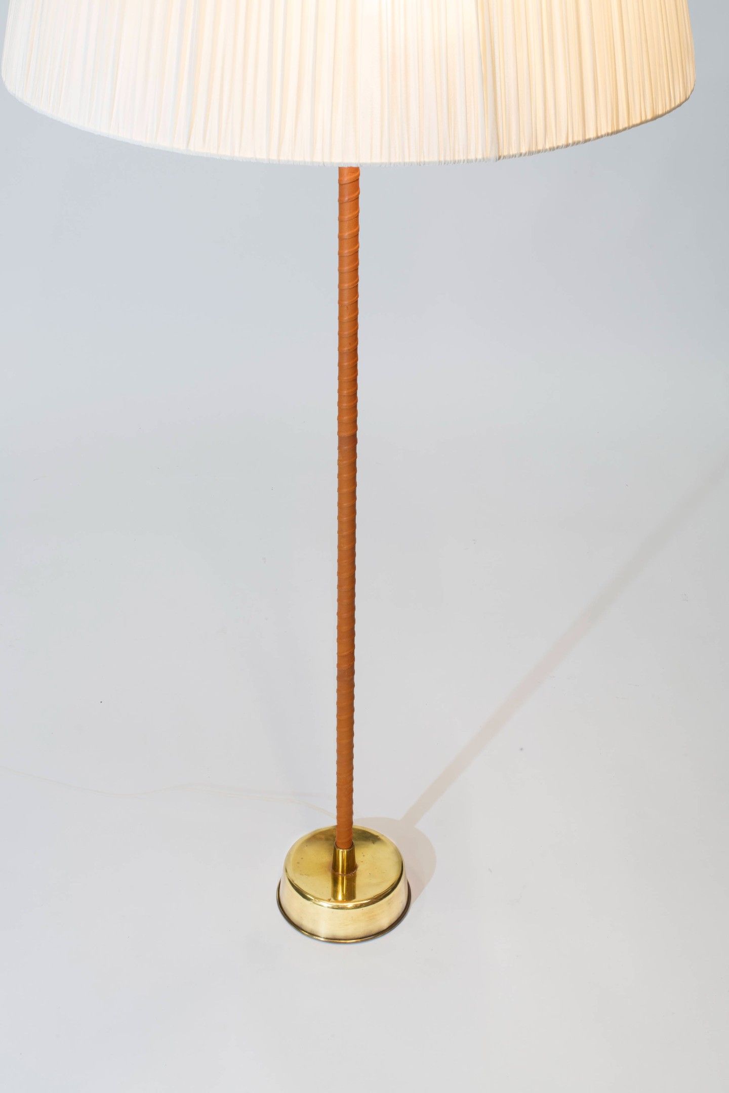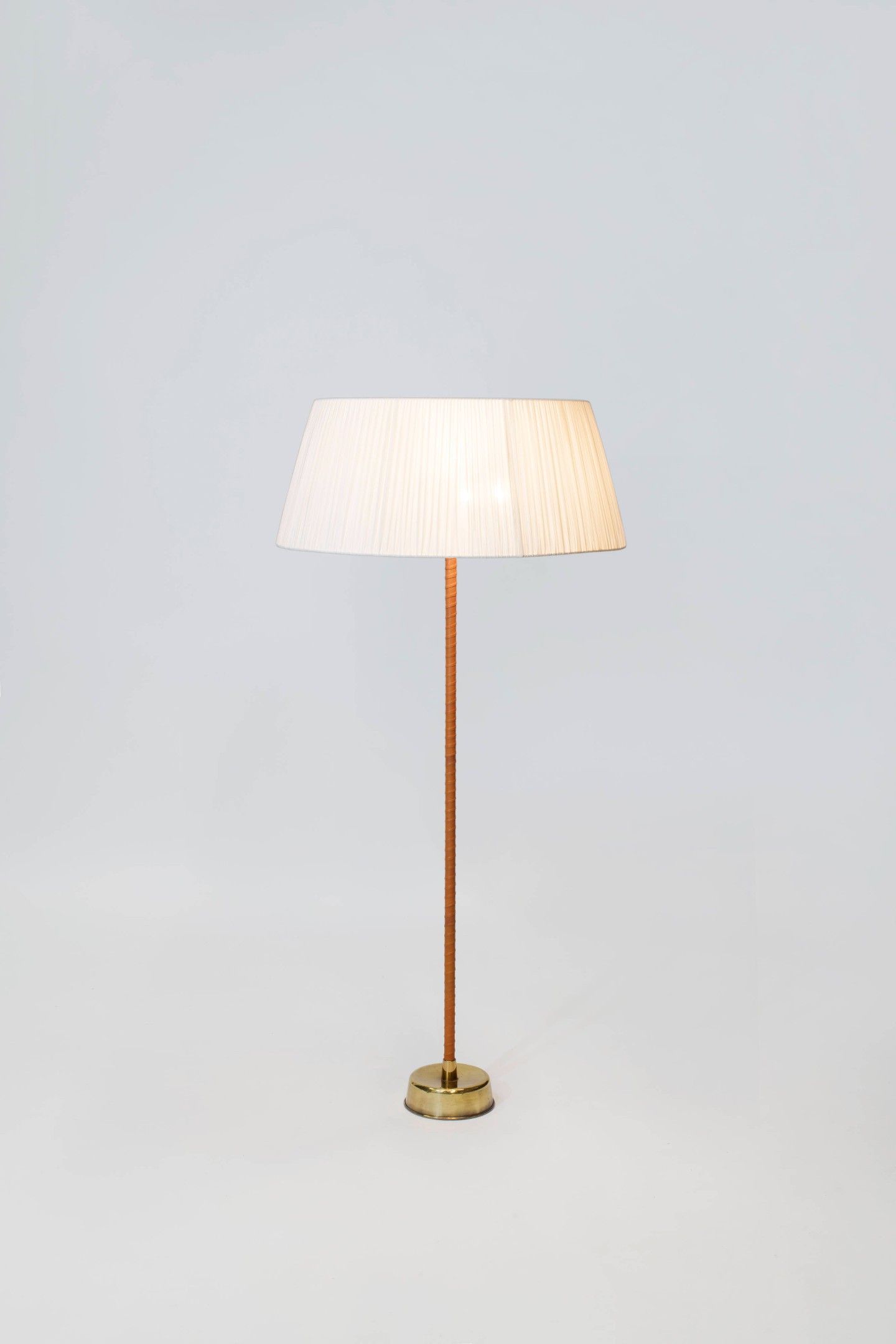 A brass, leather, plexiglass, silk floor lamp by Lisa Johansson-Pape for Orno - circa 1950