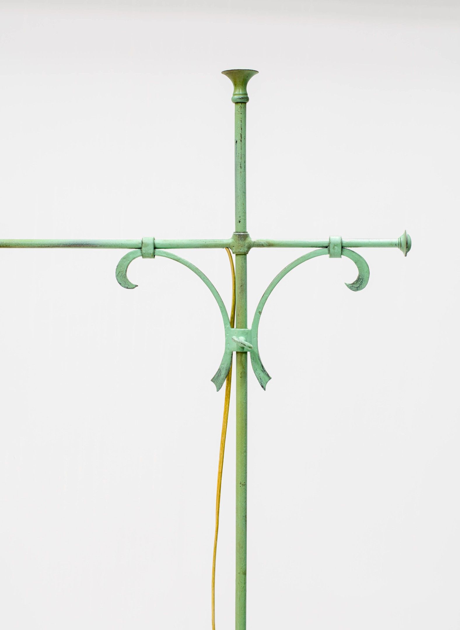 Structure en fer forgé laqué vert clair, abat-jour en lamelles de bouleau