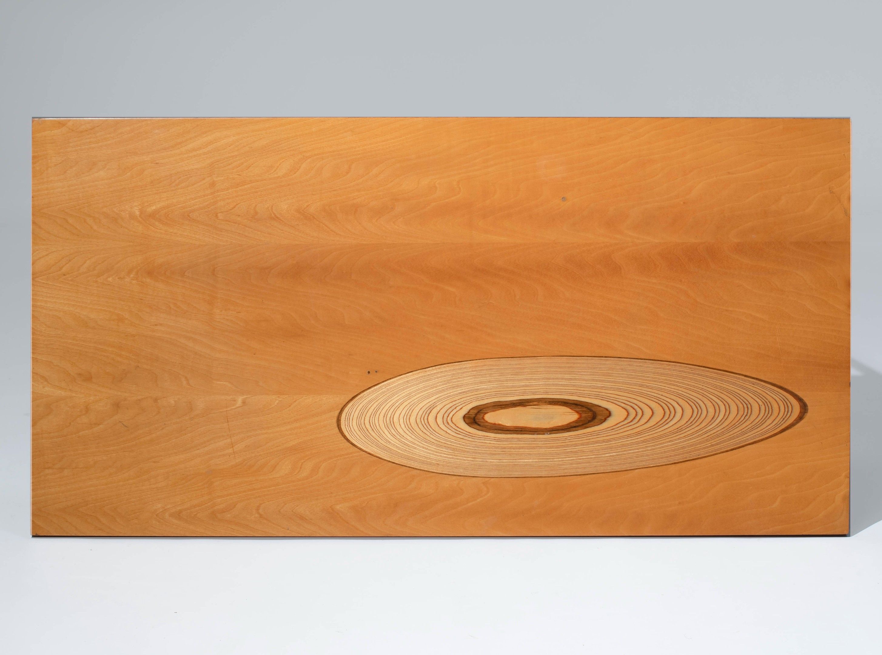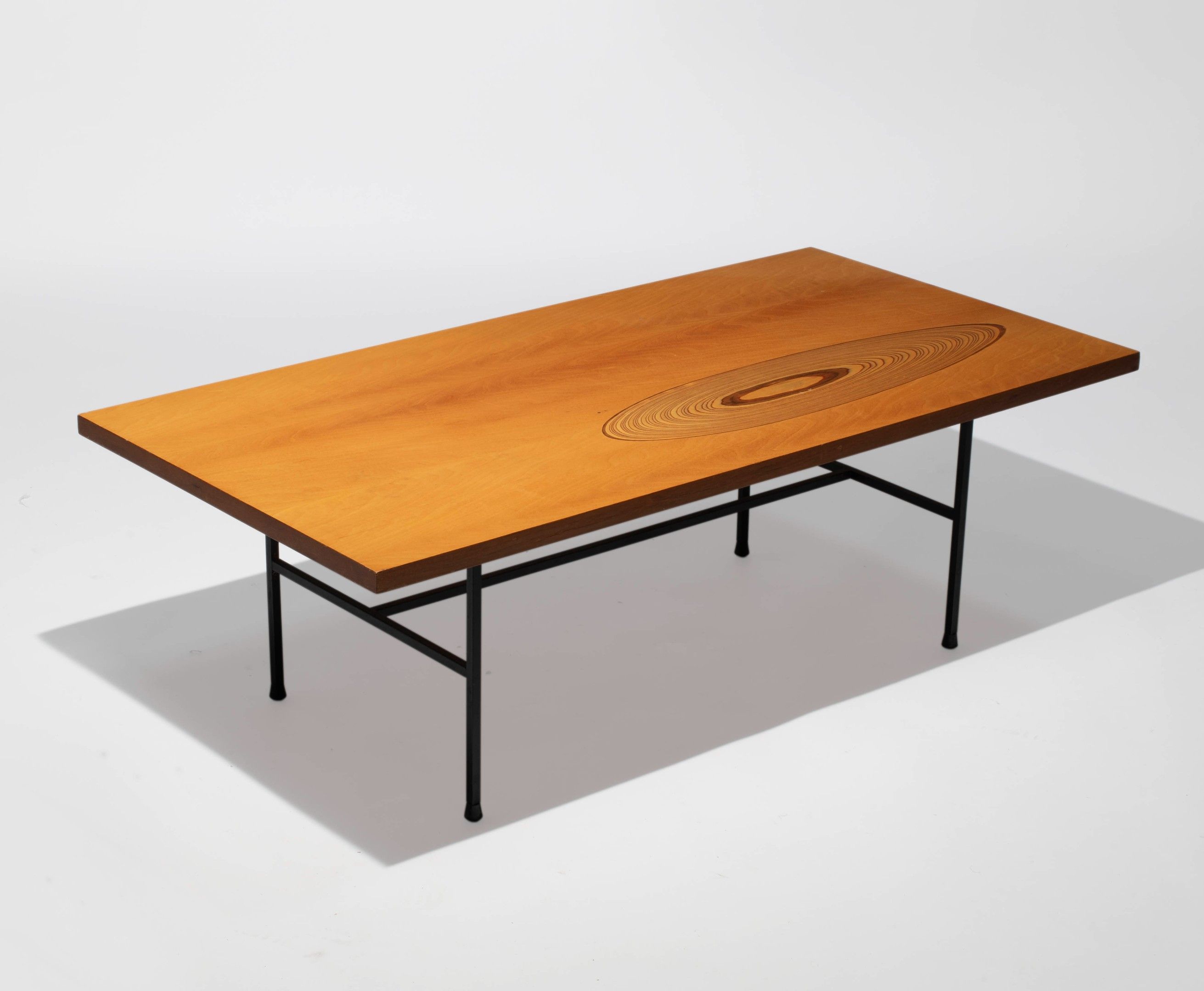 Structure en métal laqué noir, plateau en bouleau avec décor en placage dit « Mussel »