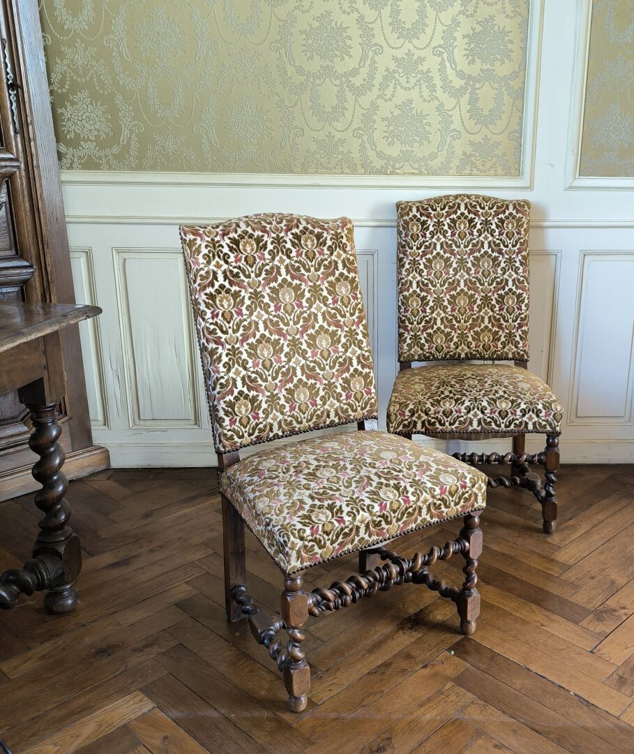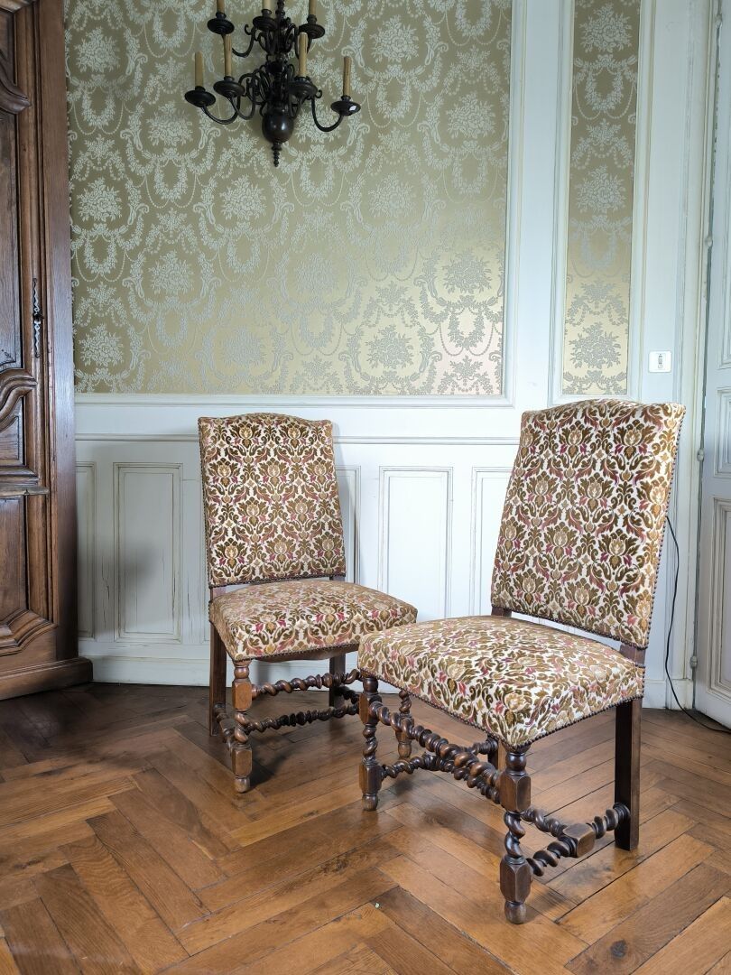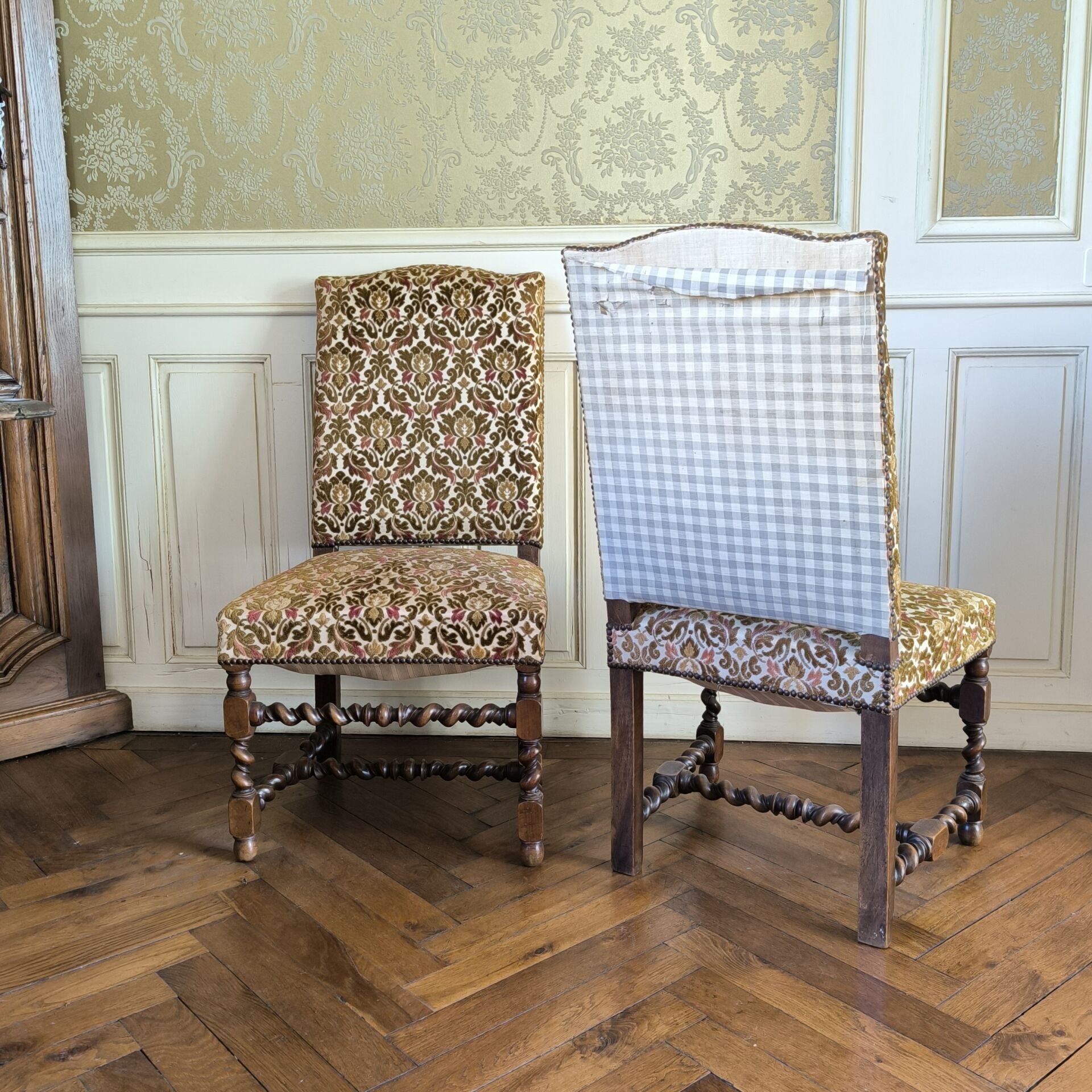 Paire de chaises en noyer en bois sculpté et mouluré, garniture de tissu, en partie d'époque Louis XIV. Haut. 99,5 cm