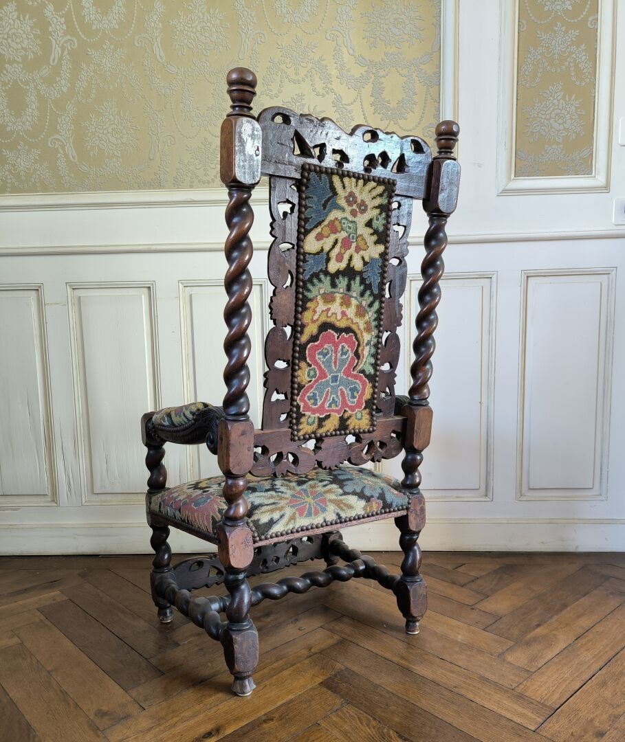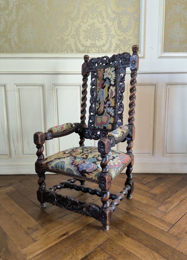 Fauteuil bas en bois sculpté à décor d'un aigle, style Louis XIII. (petites usures) Haut. 103 cm, long. 51 cm, larg. 45 cm