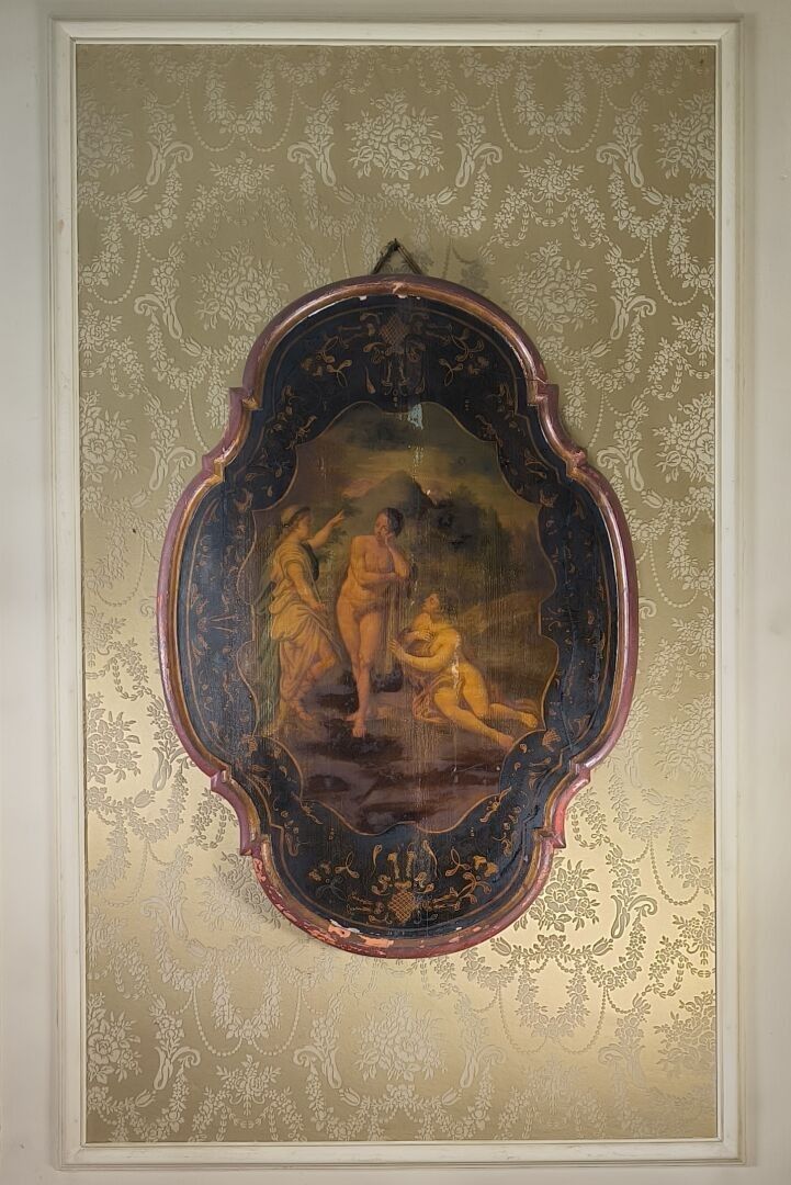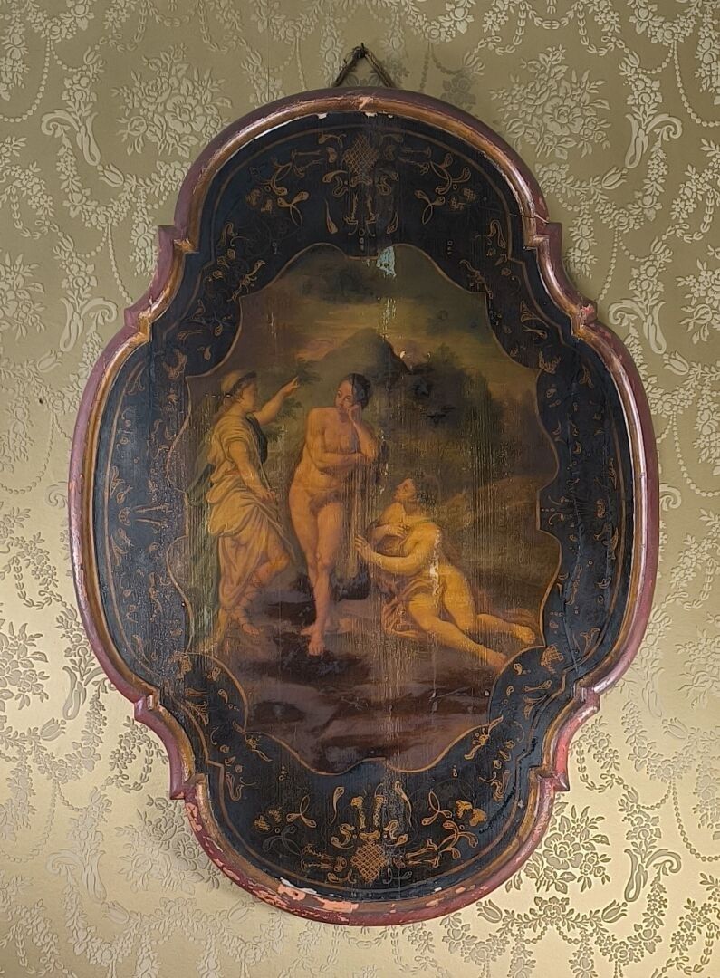 Panneau en bois peint de forme violonée : les trois grâces, XIXème. (manques de peintures, craquelures) 116 x 81 cm