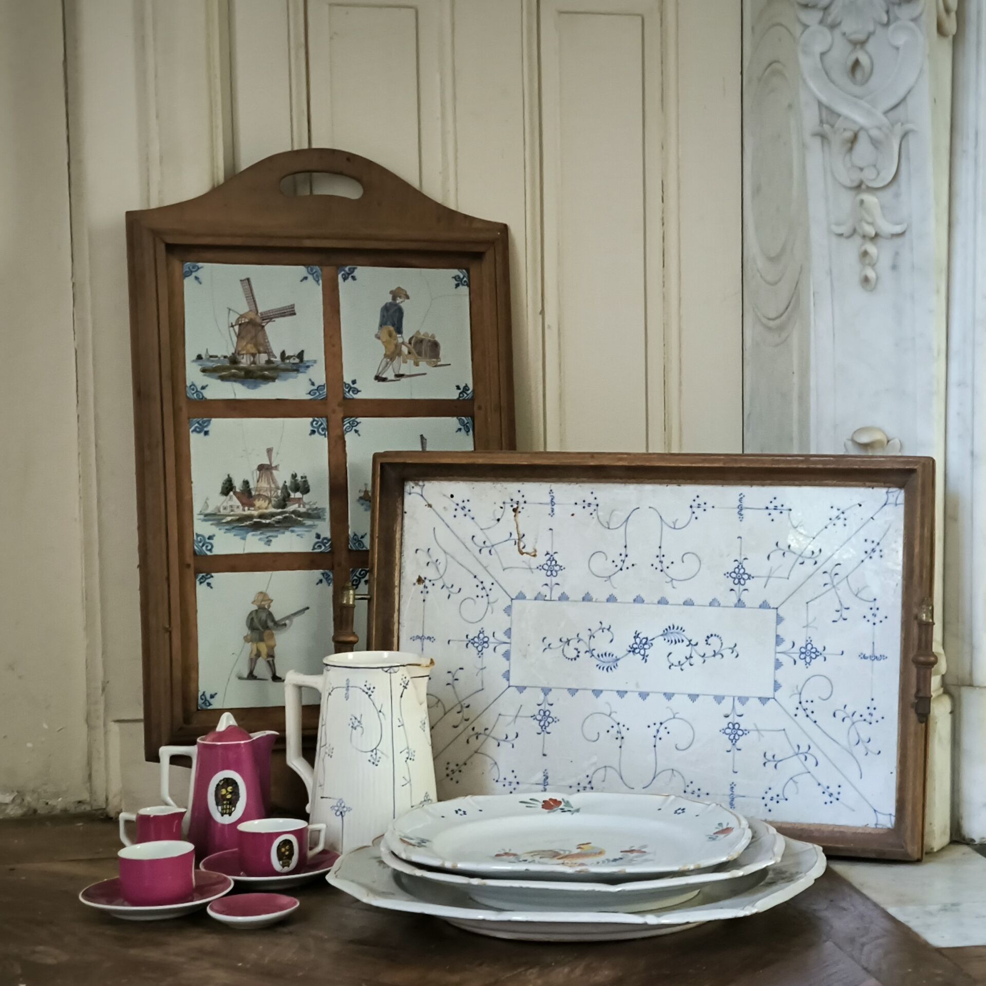 . Lot : un plateau à décor de 6 carreaux en faïence, un plat…