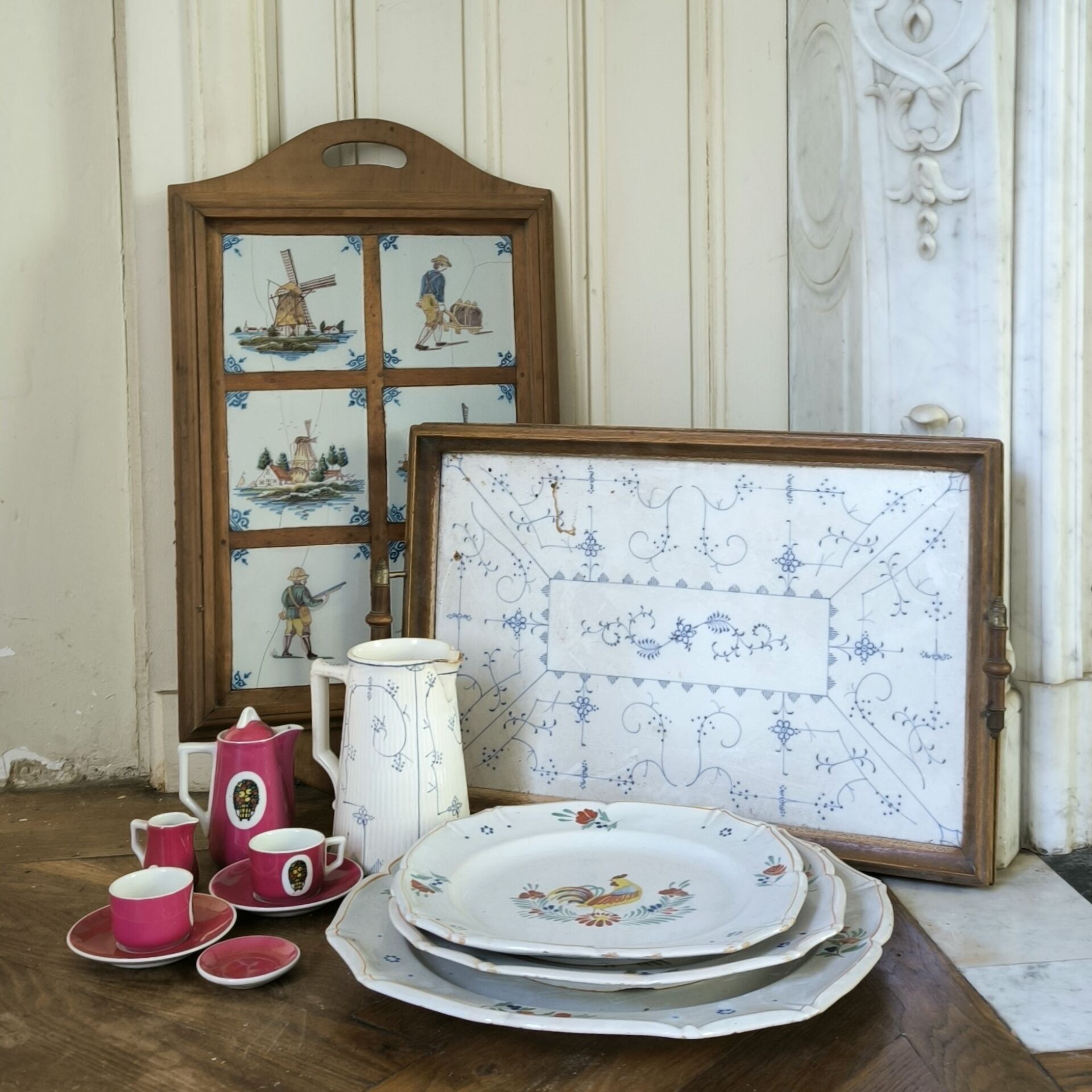 . Lot : un plateau à décor de 6 carreaux en faïence, un plateau à décor d'une plaque en porcelaine, pichet, plats à décor de coq (KG Saint Clément), un service à café et céramiques diverses