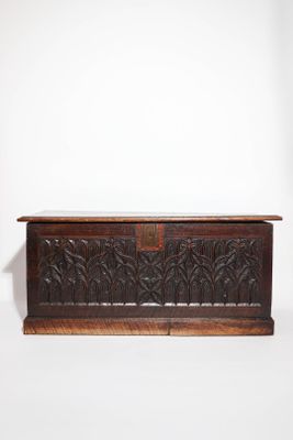 Coffre en bois sculpté et mouluré, la façade ornée d’un déco…