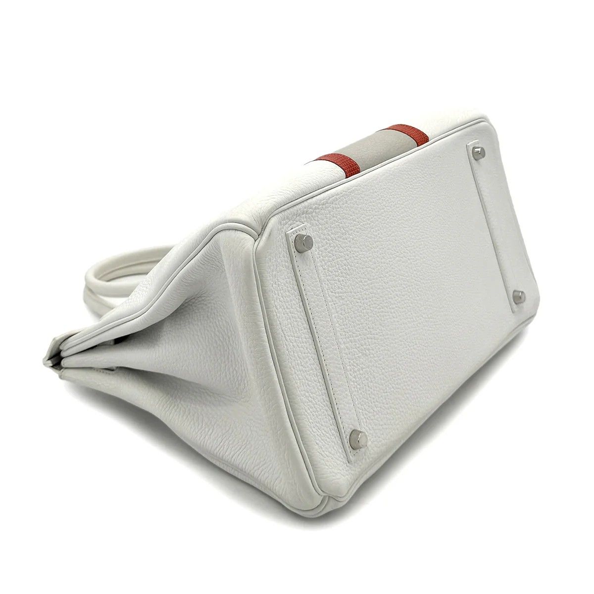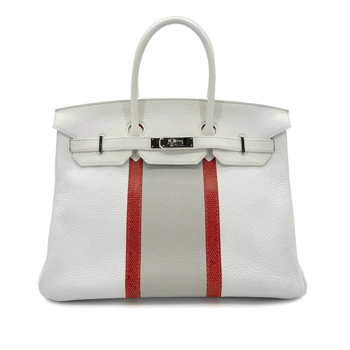 Matière : Cuir Taurillon Clémence blanc, gris Perle et Sanguine, détails en lézard, finitions argentées