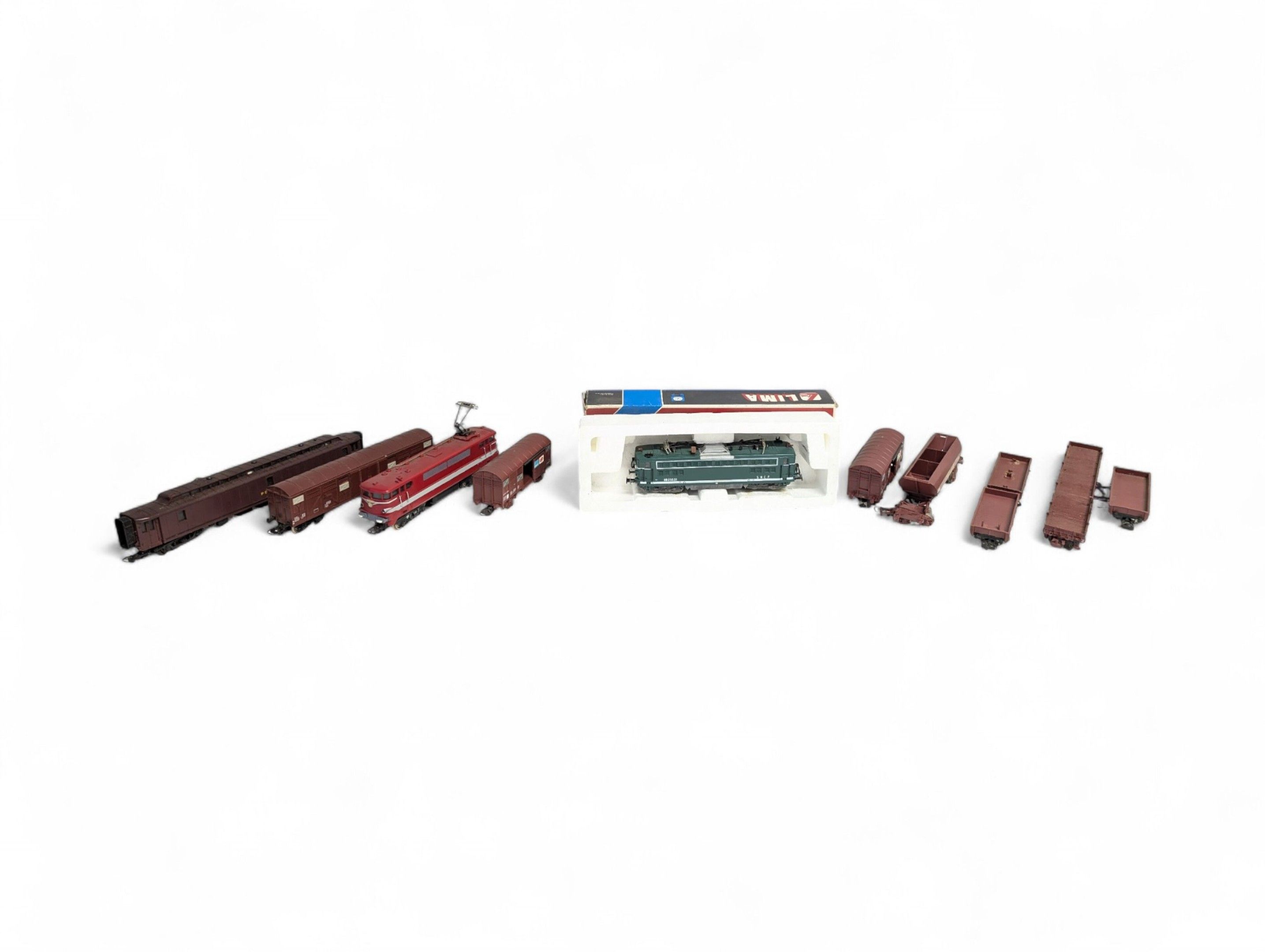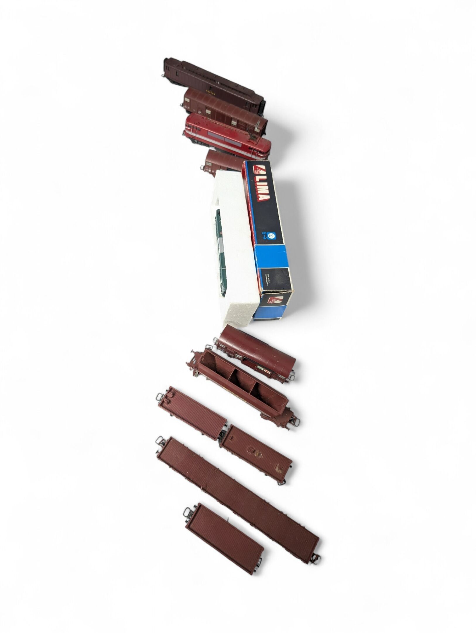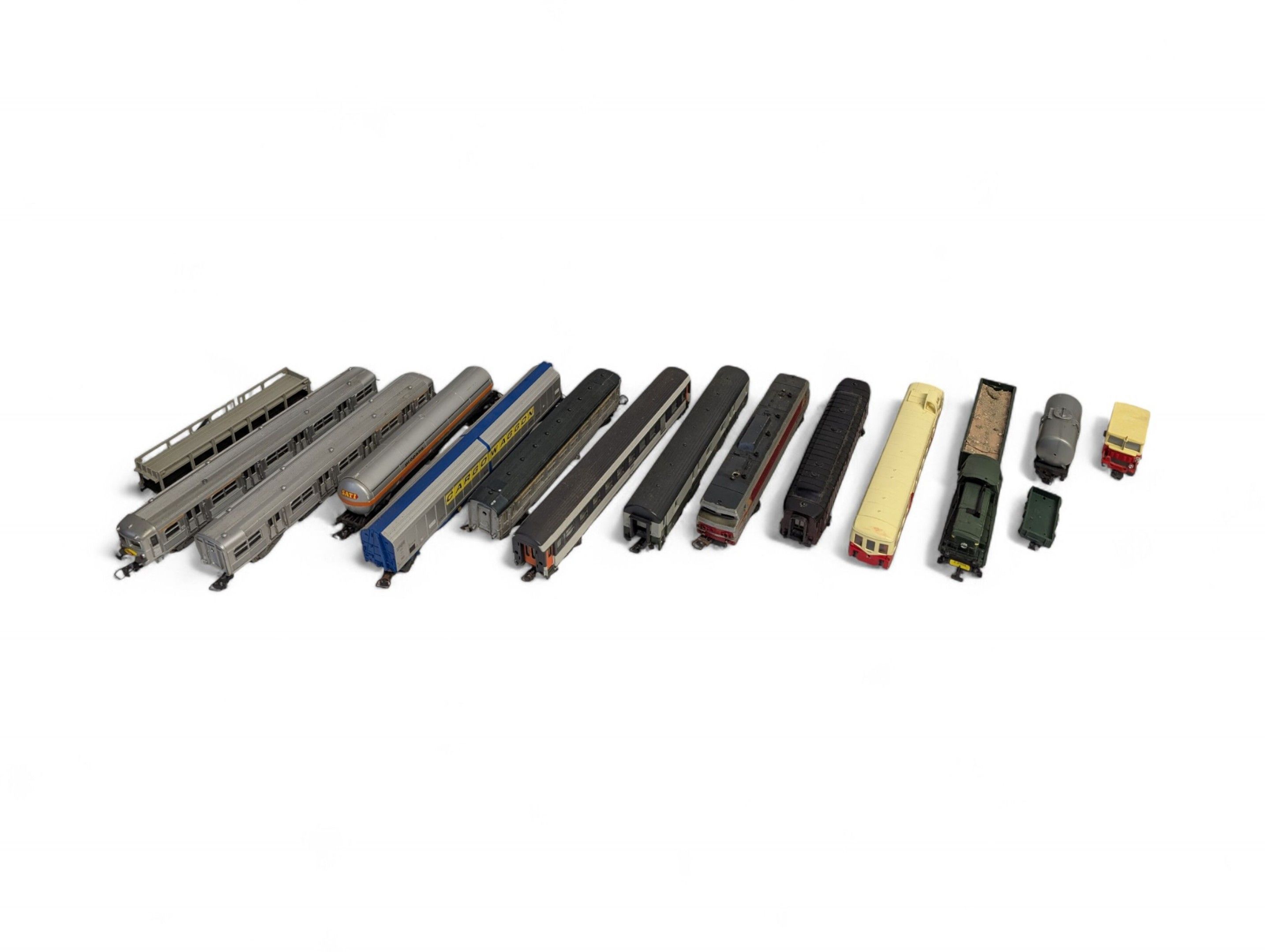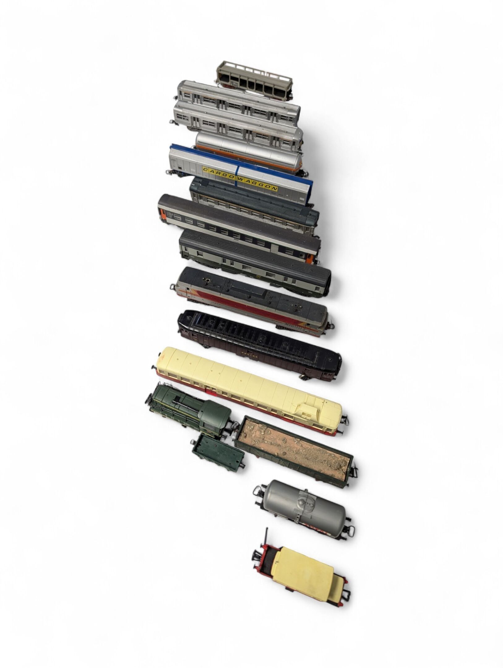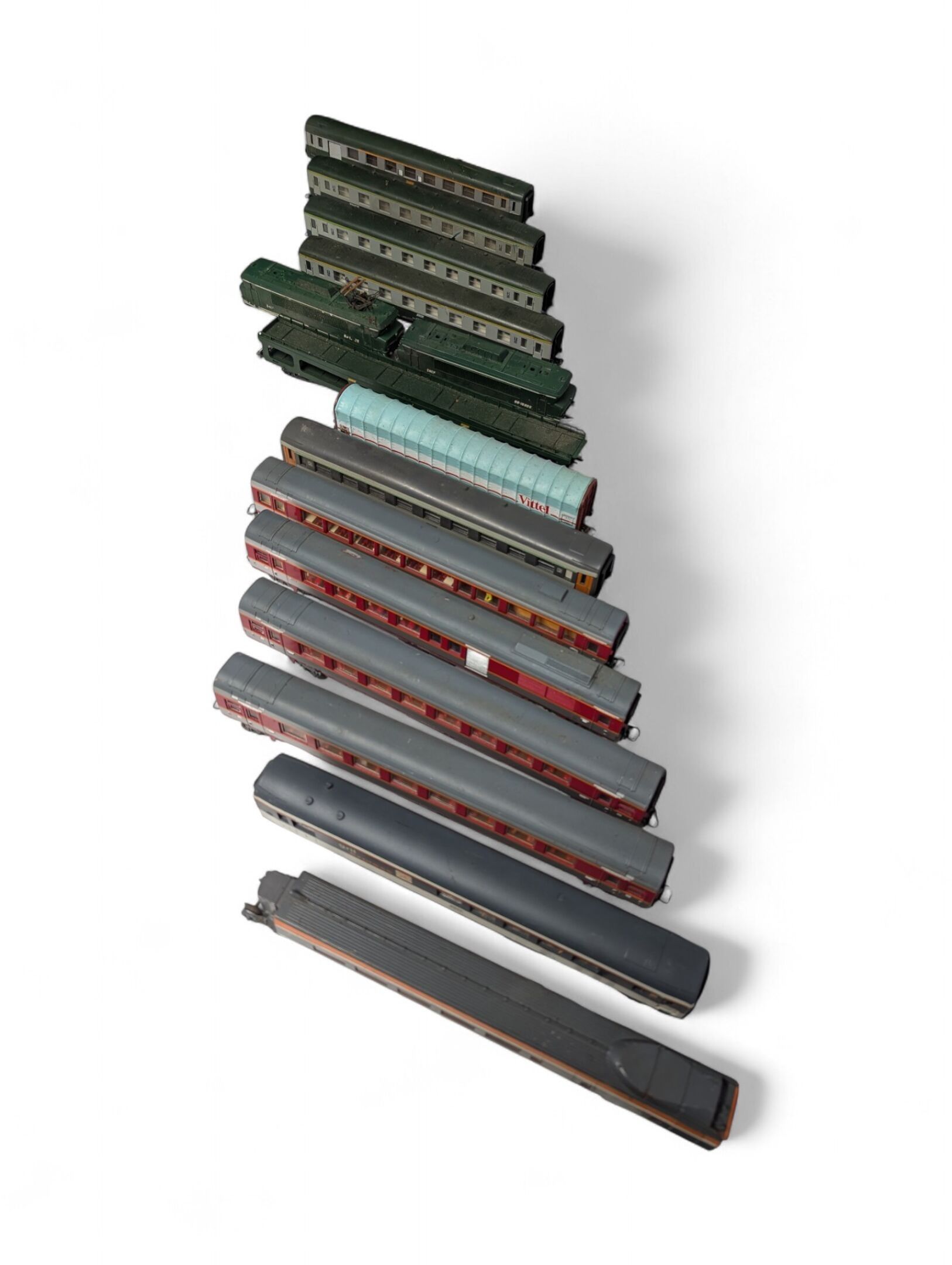 Collection d'environ 30 wagons de transport de marchandises, de transport de voyageurs, Vittel, matériaux et divers