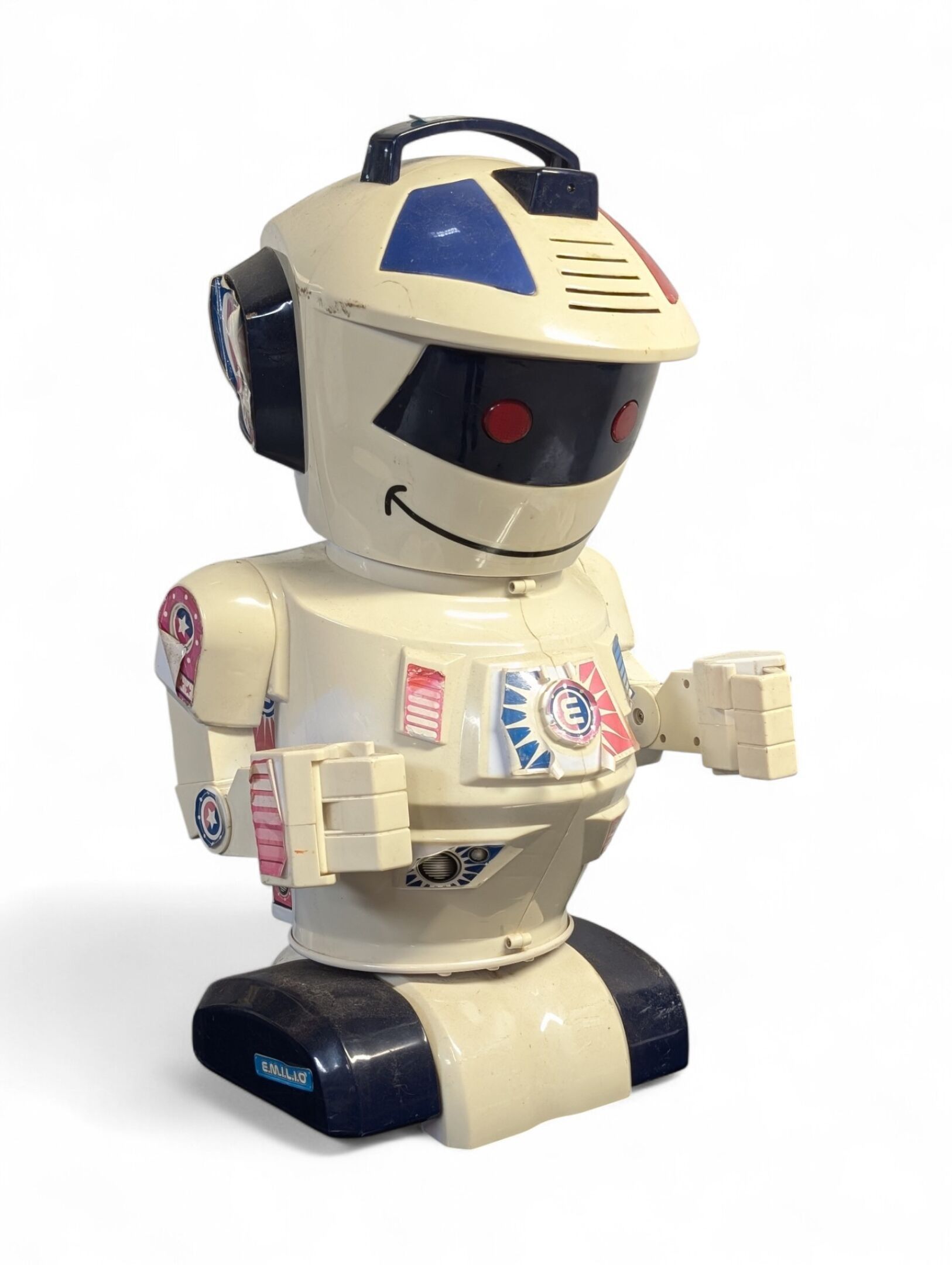 BANDAI ® « Emilio le Robot » Robot télécommandé en plastique. Vers 1990. Avec sa télécommande et sa notice d'utilisation Hauteur : 80 cm