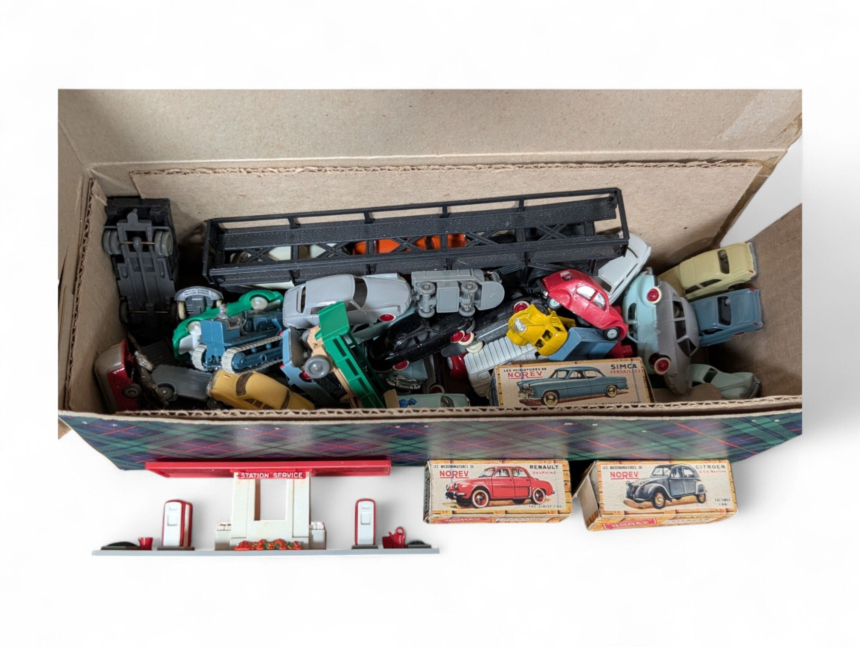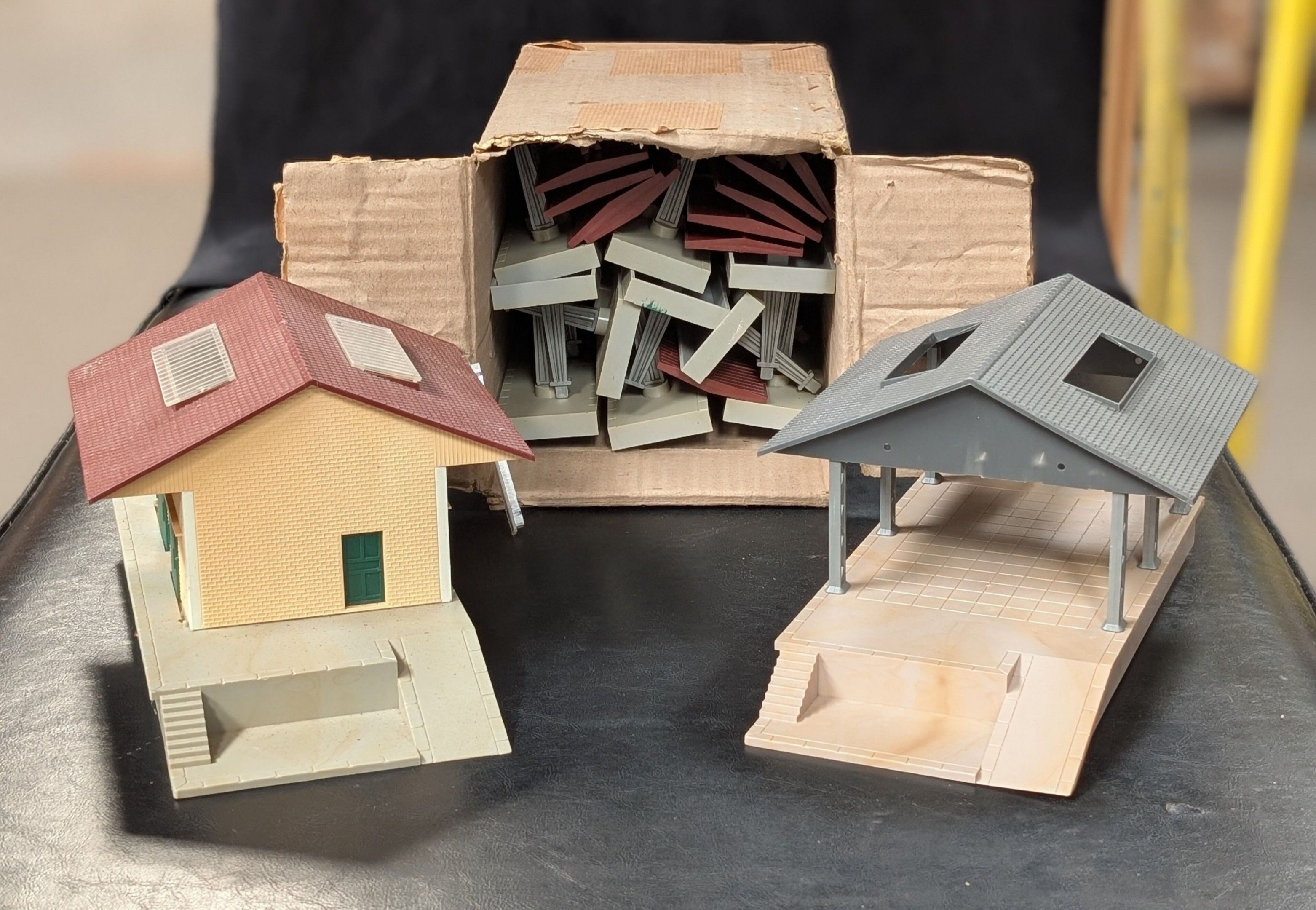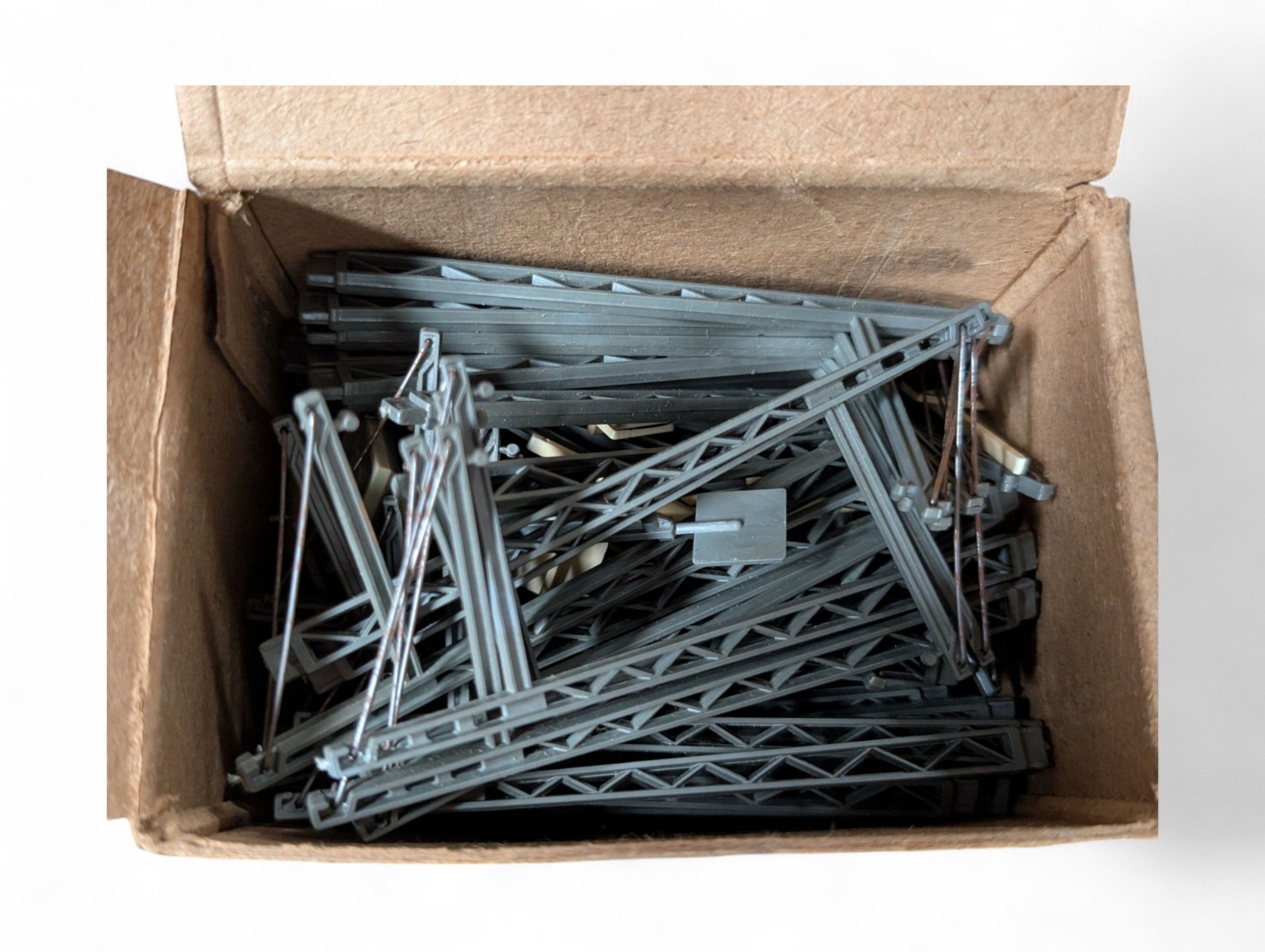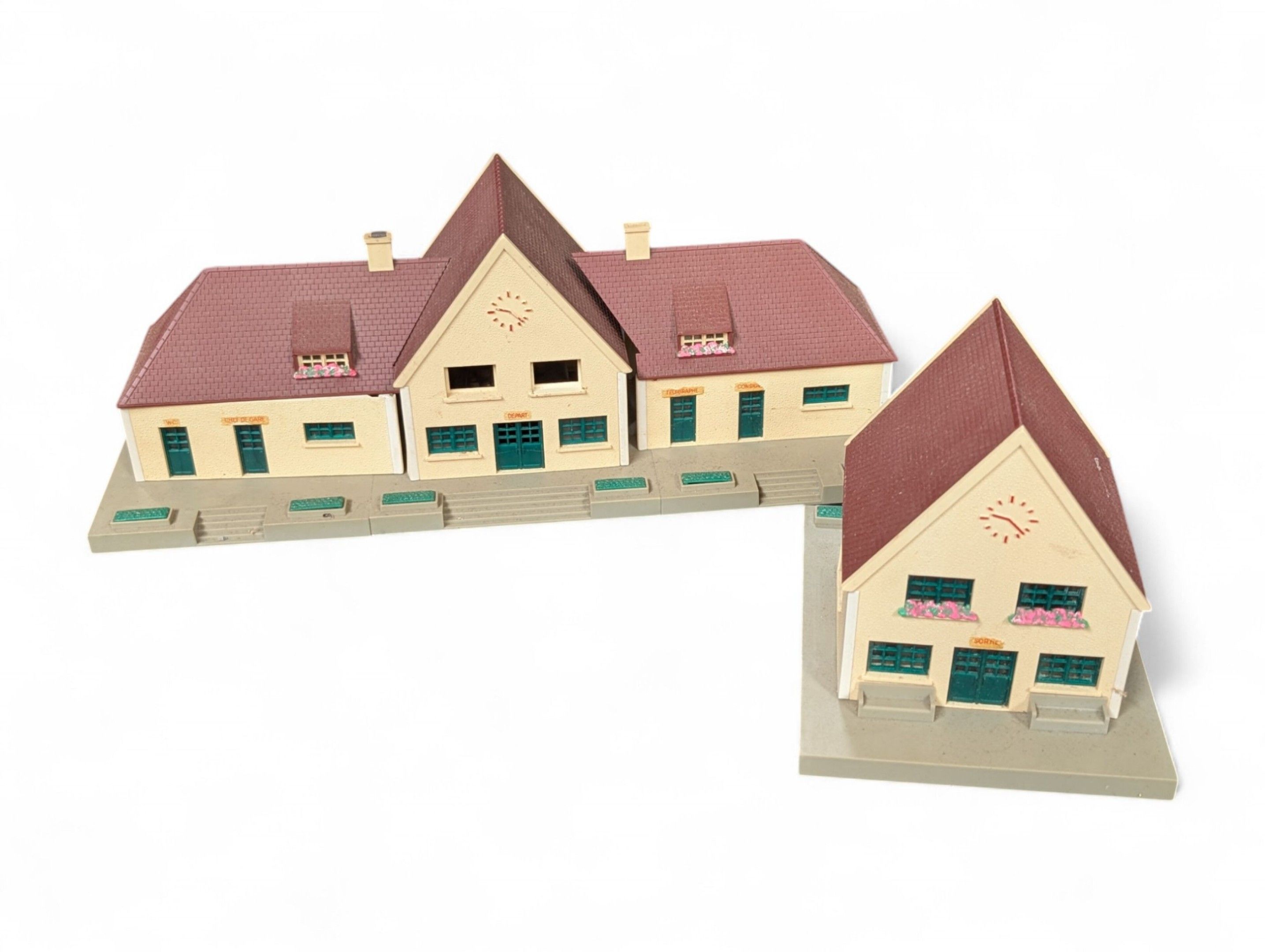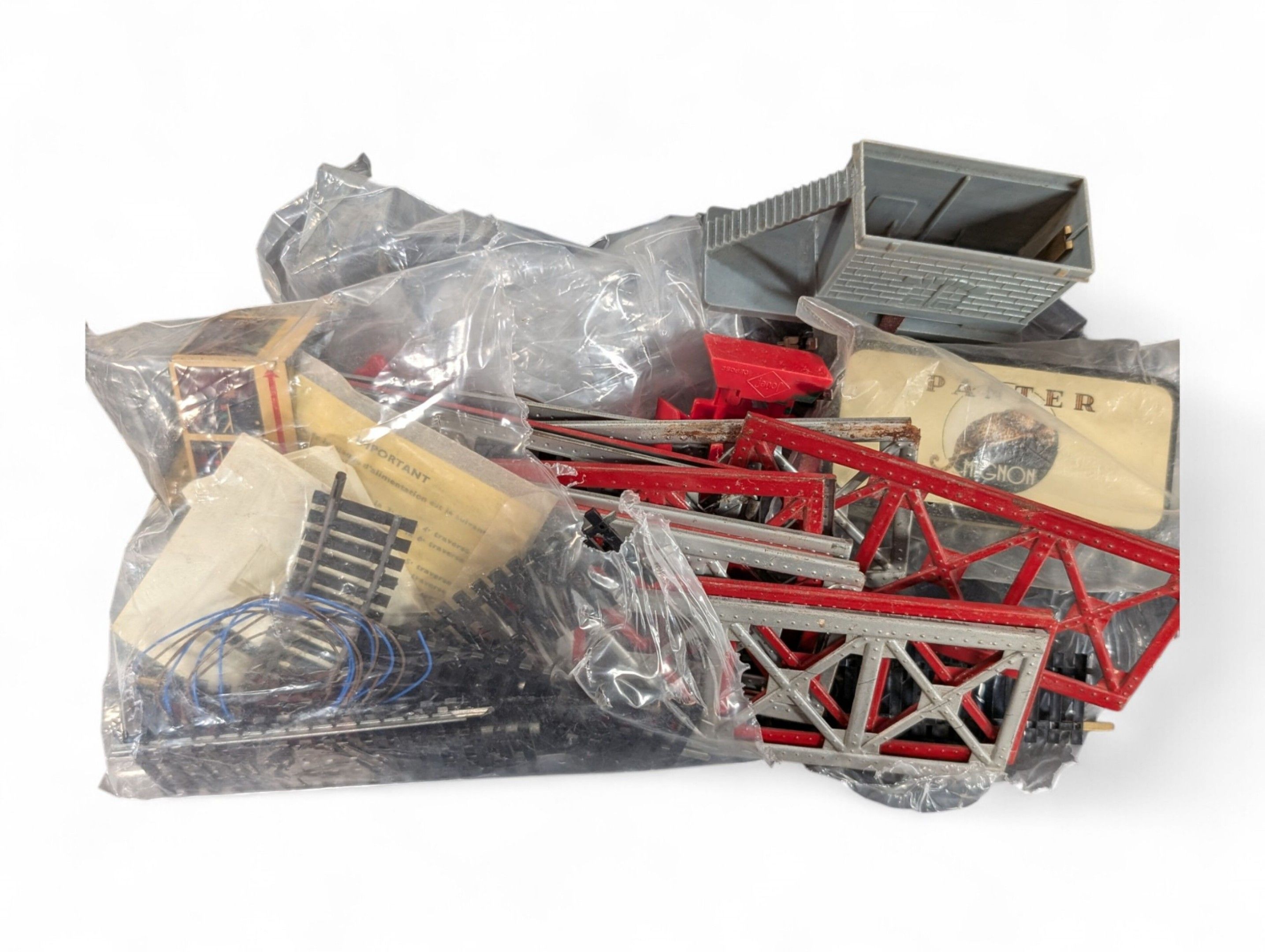Importante collection de wagons, 12 locomotives électriques, citernes, barrières, passages à niveau à commande électrique, trémies, passage supérieur avec pont, rails, gares, hall, quais, transformateurs, poteaux électriques et signaux