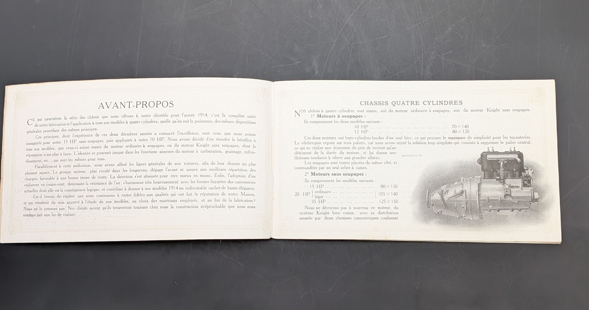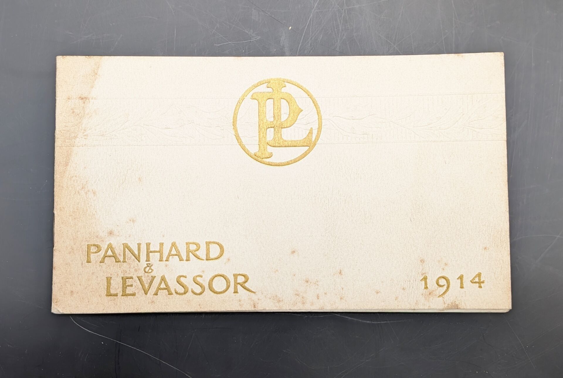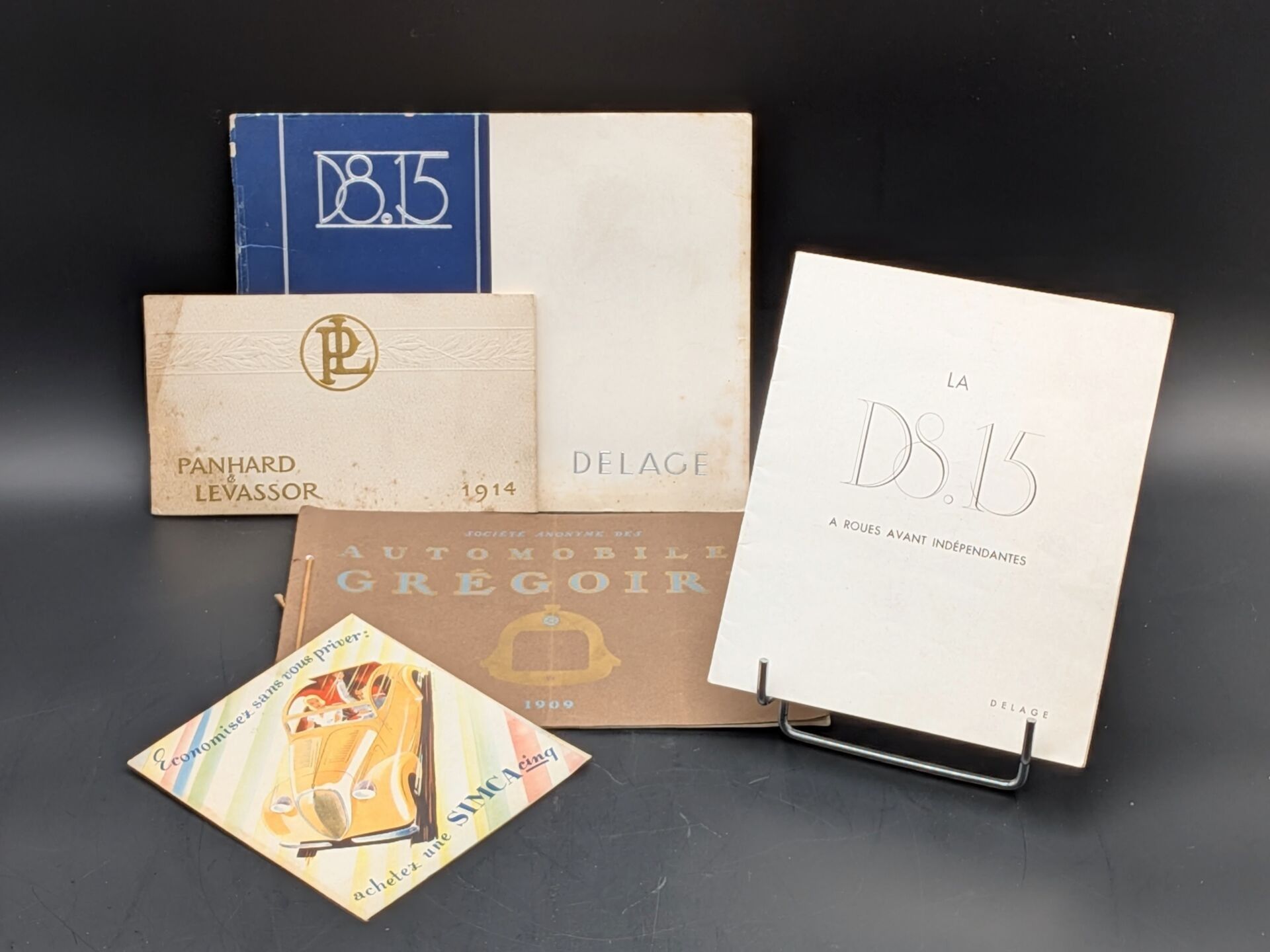 AUTOMOBILIA. Ensemble de 2 catalogues DELAGE D8.15, un catalogue PANHARD LEVASSOR 1914, un catalogue automobiles GREGOIRE 1909, un fascicule SIMCA 5
