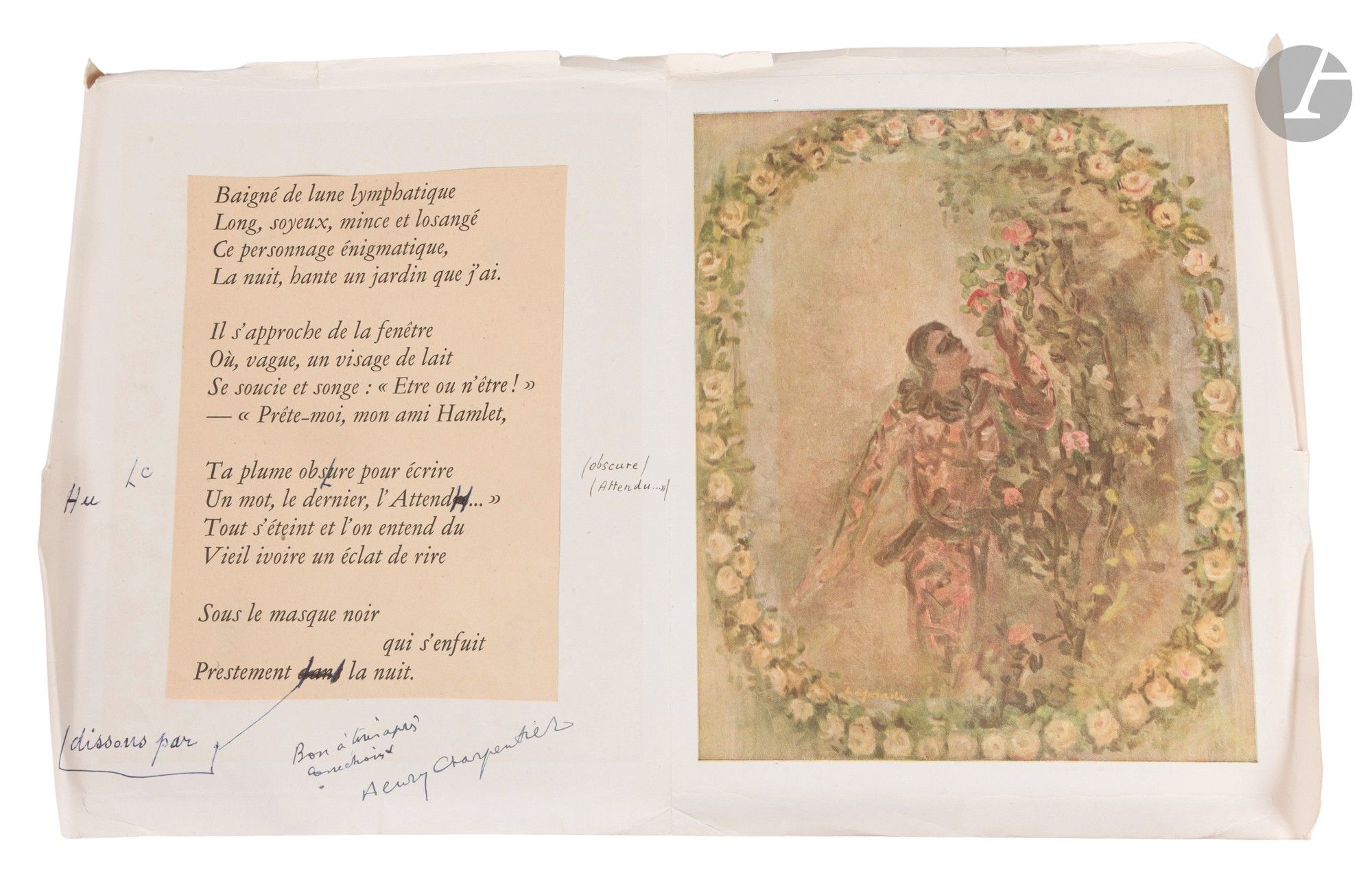 - Épreuve corrigée par Henri Charpentier des deux premiers feuillets contenant le poème « Arlequin »,