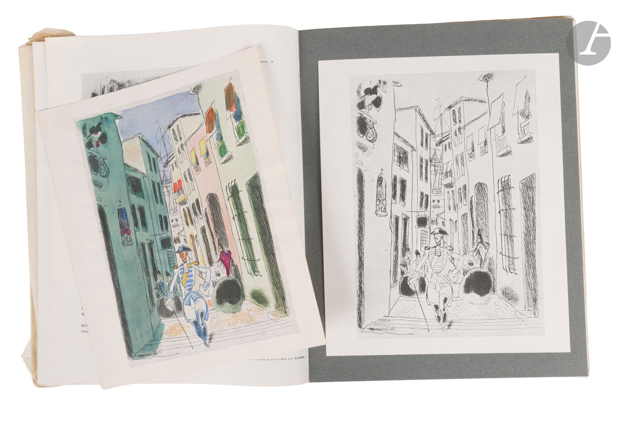 - 5 reproductions d’une même gravure de Gus Bofa (4 en noir et une en couleurs),
