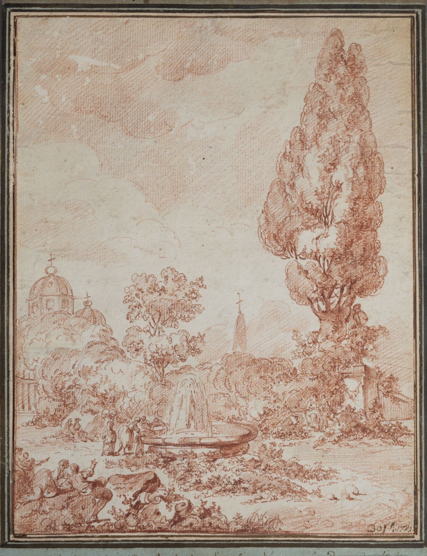École FRANCAISE du XVIIIè siècle Paysage d'Italie Sanguine H. 22,5 cm - L. 17 cm DB Monogrammé et daté à la plume « 1775 » en bas à droite