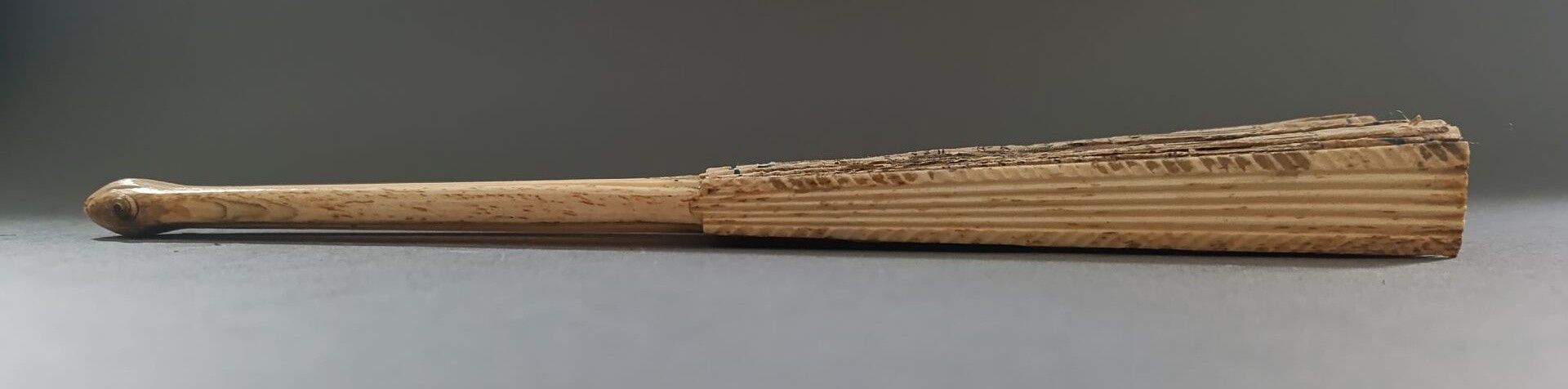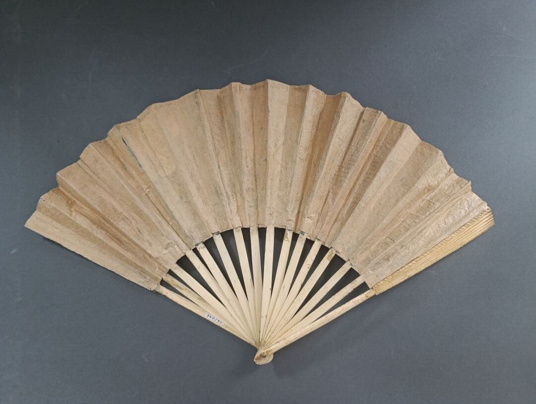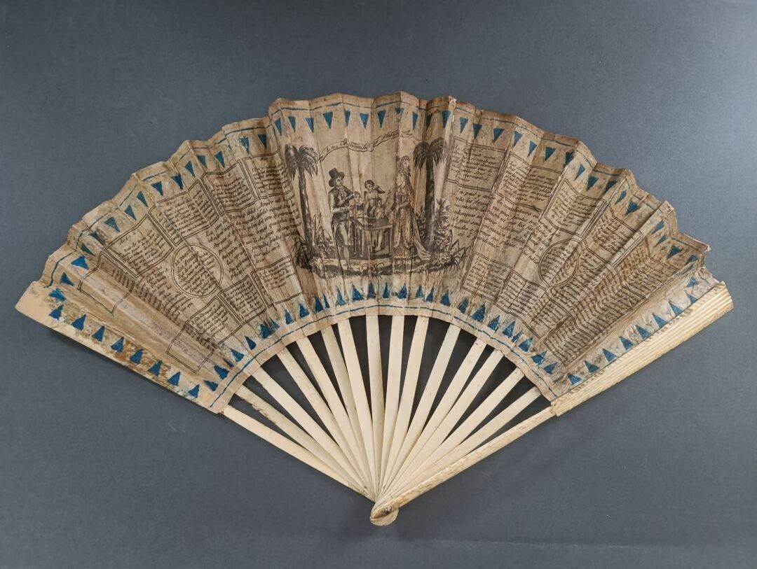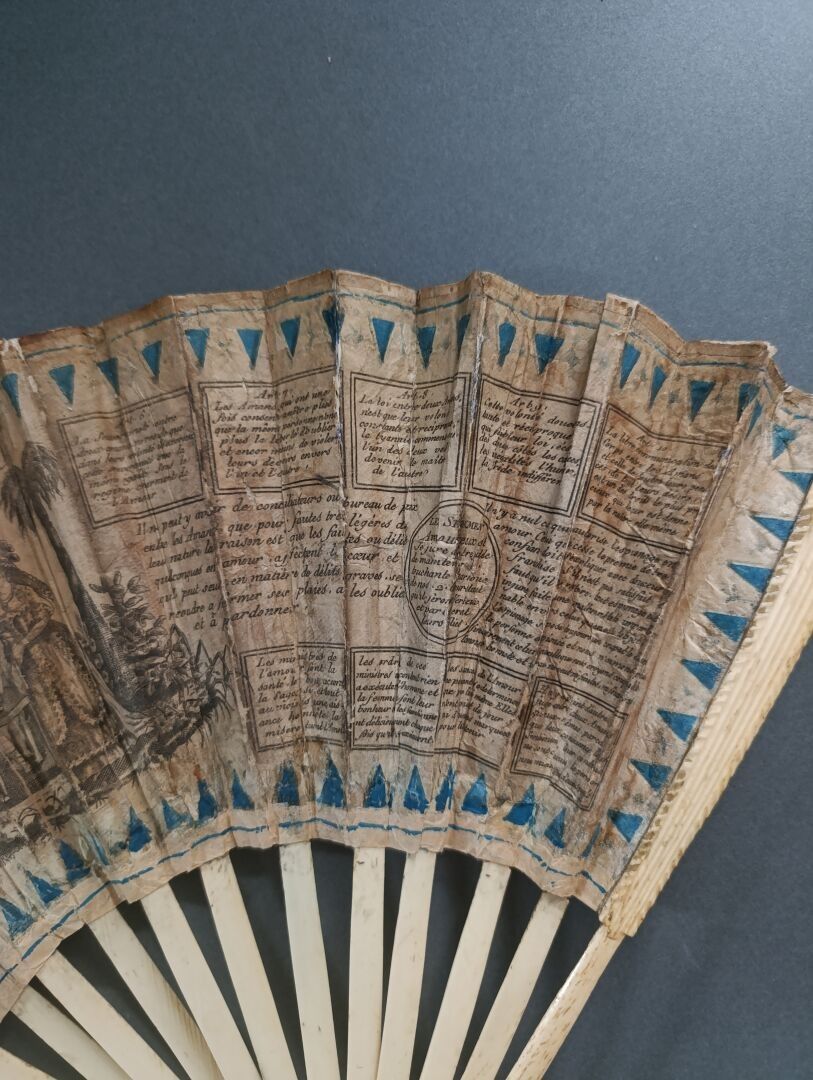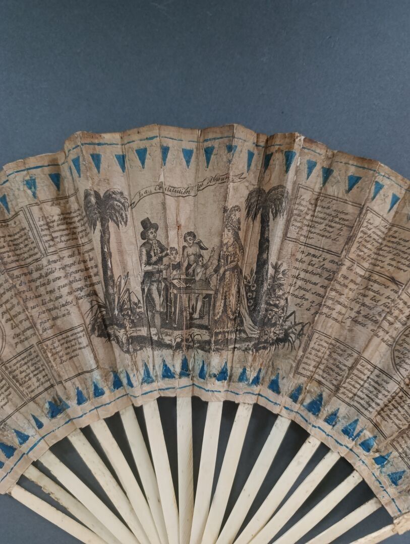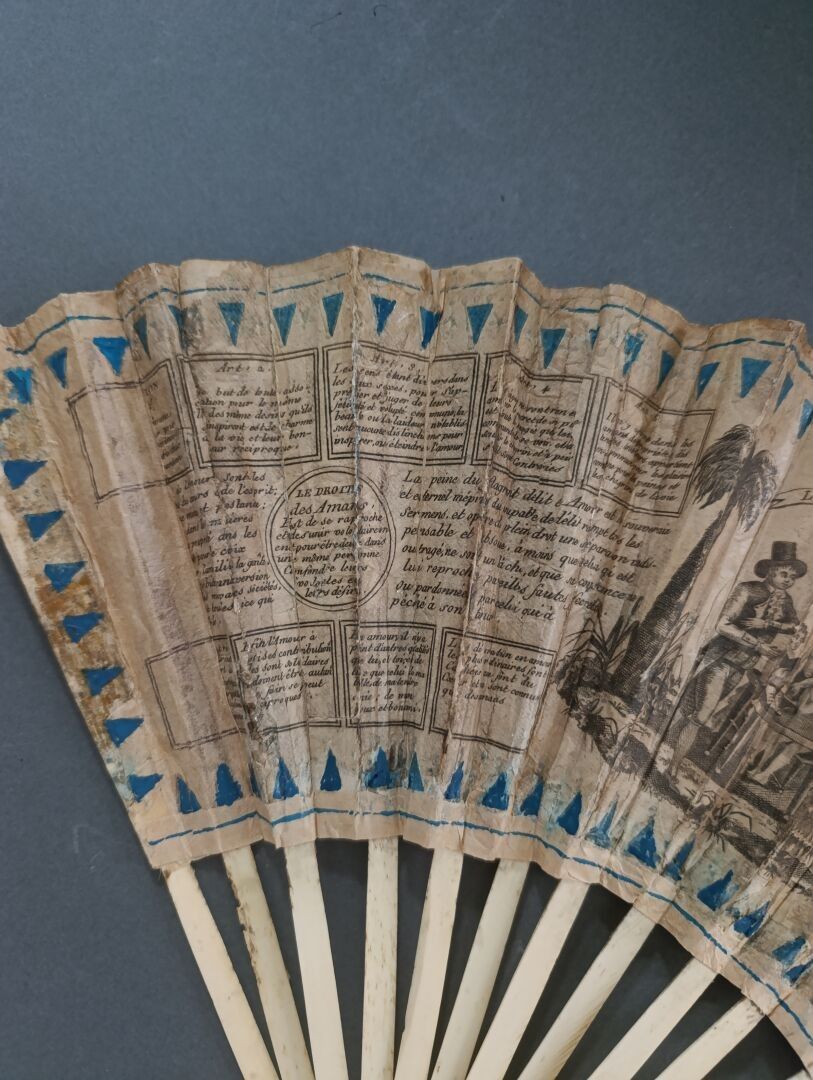 Éventail plié, la feuille double en papier gravé d'un couple se présentant devant le bureau des amours.