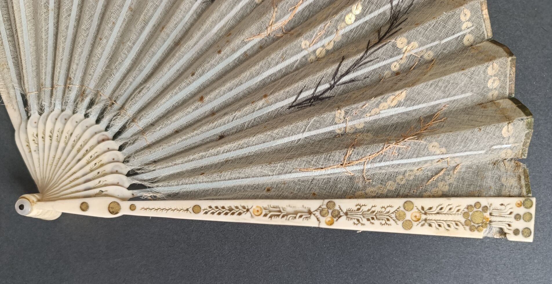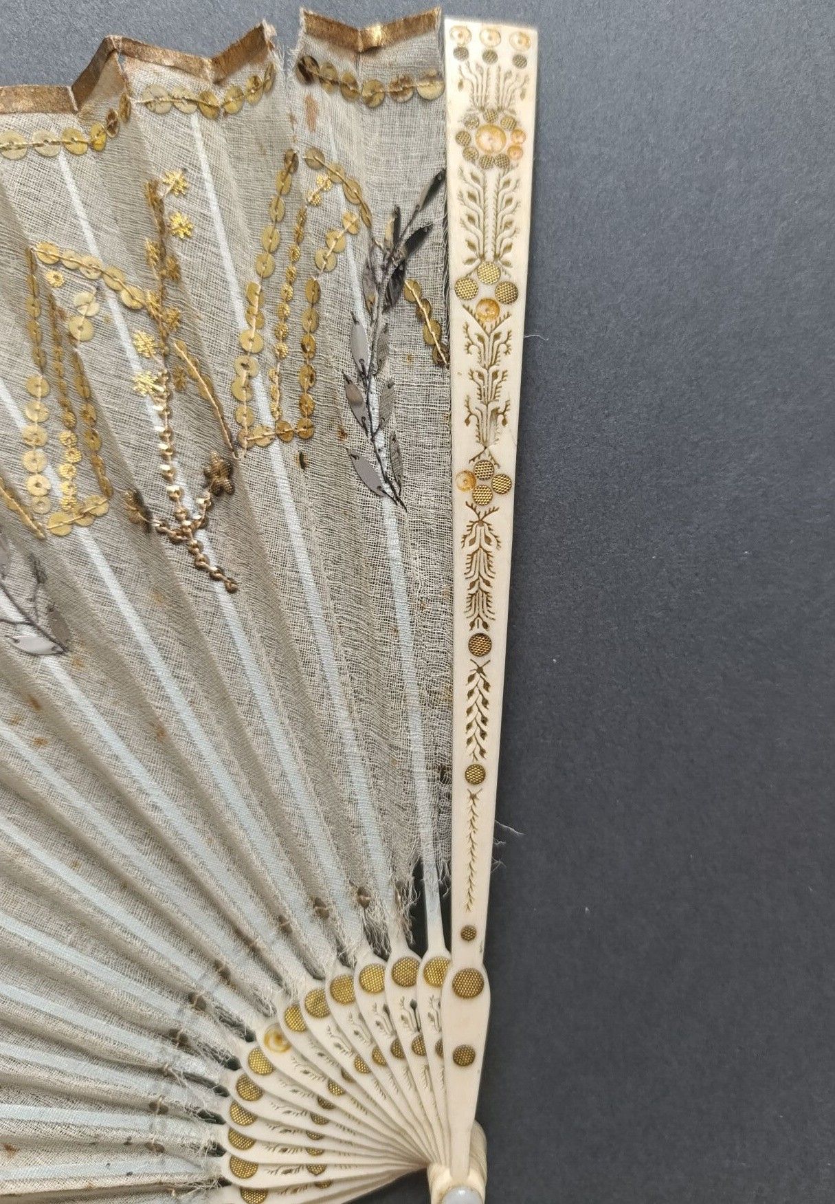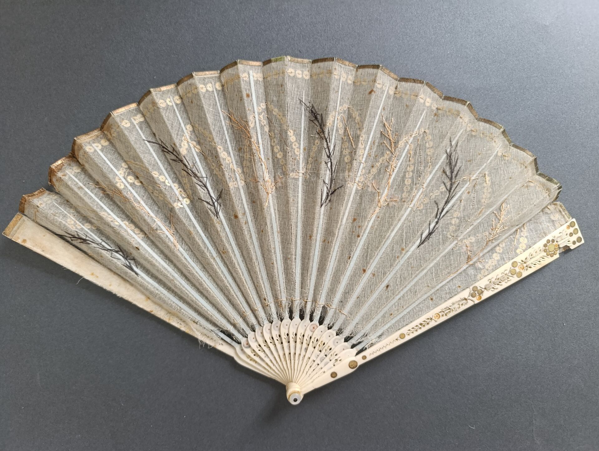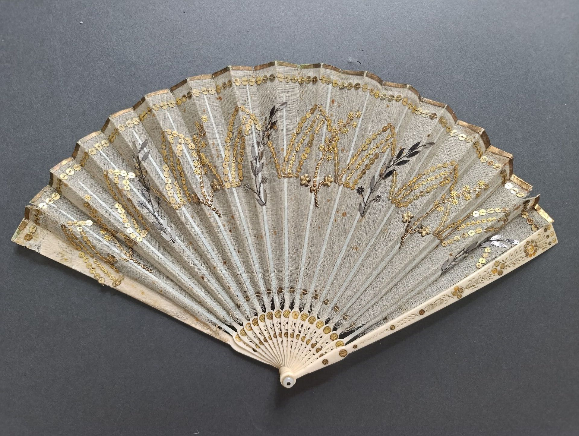 Éventail plié, la feuille en soie brodée de paillettes argentées et dorées dessinant des ogives et des branches, dans le goût néo-gothique.