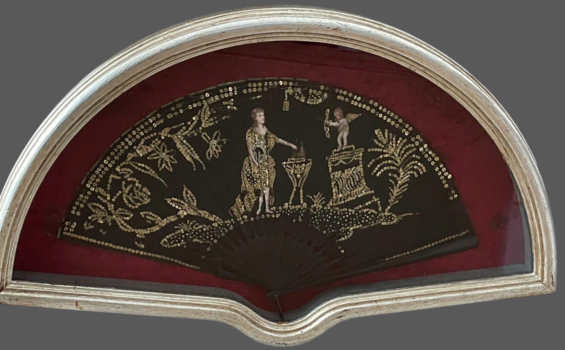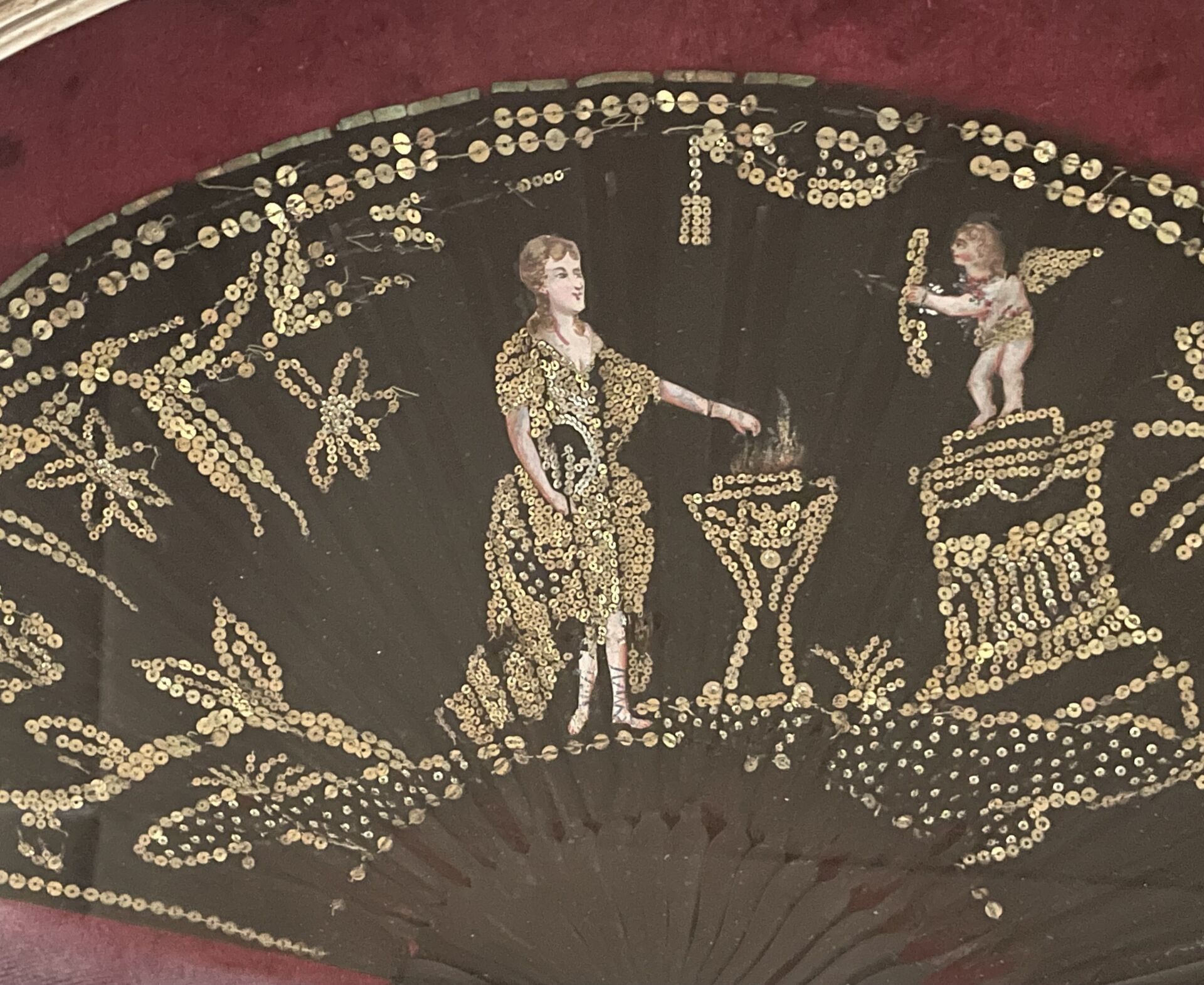 Éventail plié, la feuille en soie noire brodée de paillettes dorées dessinant une femme alimentant un feu en l'honneur de Cupidon. Les têtes en relief.